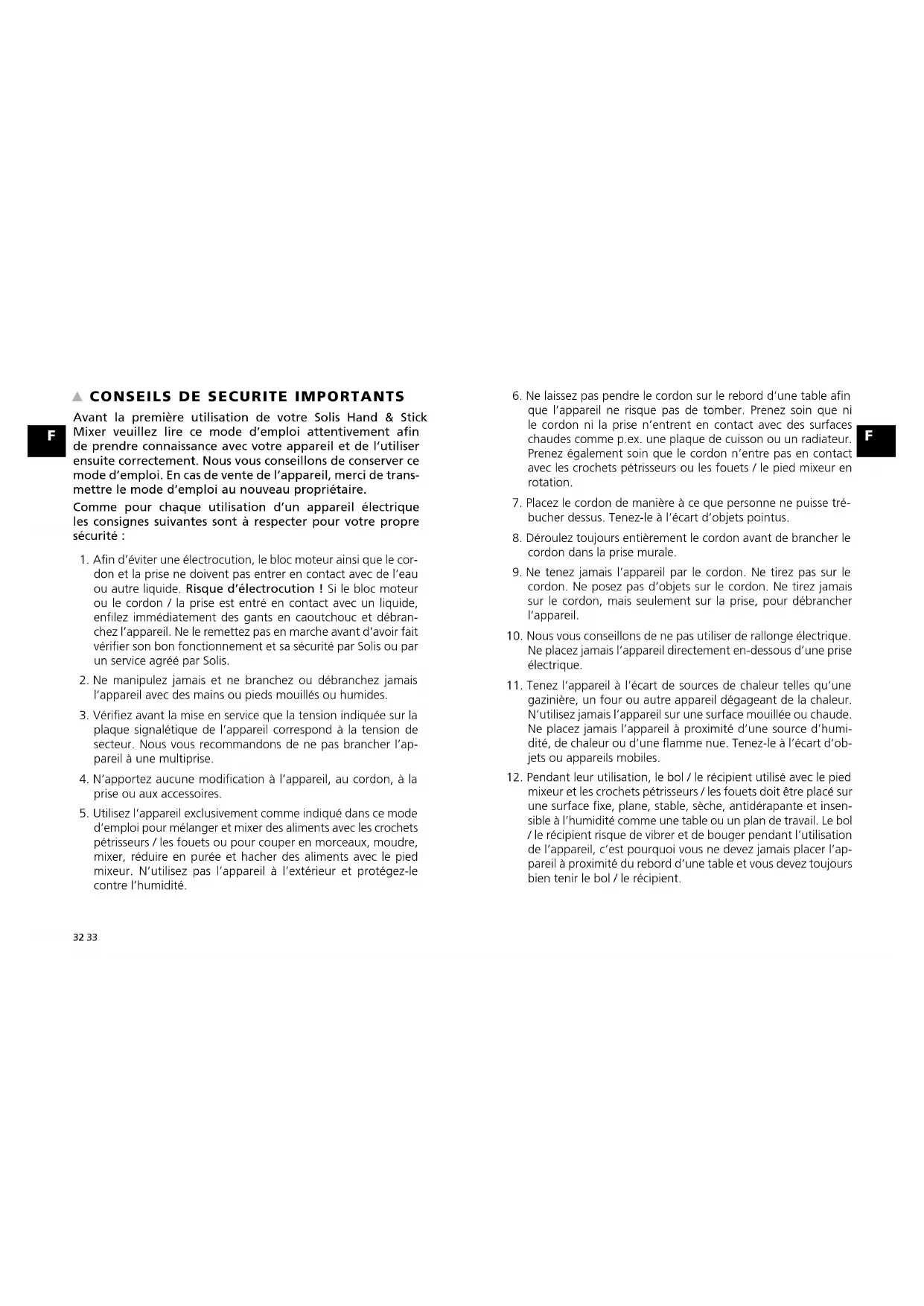 Avant la première utilisation de votre Solis Hand & Stick Mixer veuillez lire ce mode d’emploi attentivement afin de prendre connaissance avec votre appareil et de l’utiliser ensuite correctement. Nous vous conseillons de conserver ce mode d’emploi. En cas de vente de l’appareil, merci de trans- mettre le mode d’emploi au nouveau propriétaire. Comme pour chaque utilisation d’un appareil électrique les consignes suivantes sont à respecter pour votre propre sécurité :
