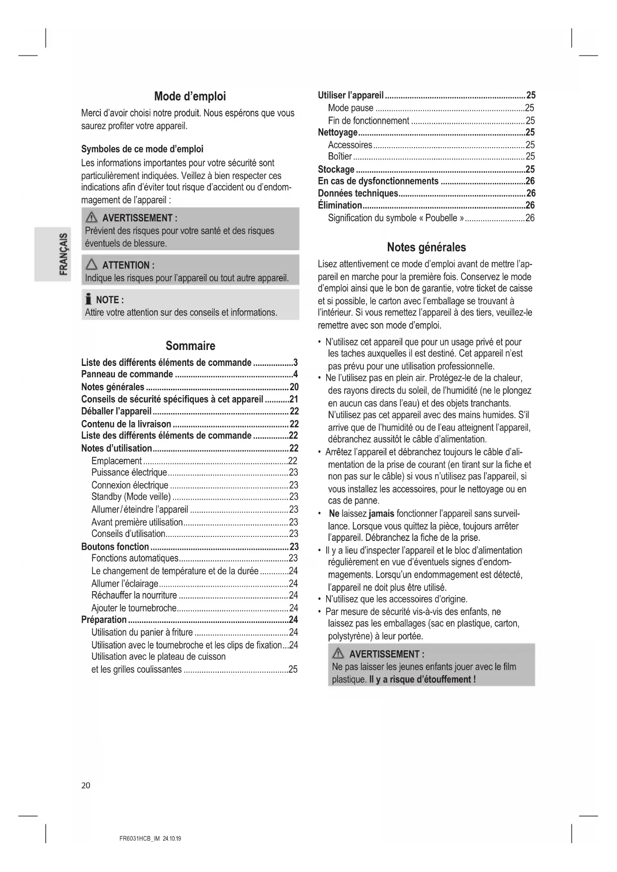 En cas de dysfonctionnements S’il y a un problème, ce n’est souvent pas grave. Avant de contacter notre service après-vente, veuillez vérier ce qui suit : Problème Cause possible Solution L’appareil ne fonctionne pas. L’appareil ne reçoit pas d’alimentation électrique. Vériez la prise avec un autre appareil. Branchez correctement la che secteur. Vériez le disjoncteur principal. La porte n’est pas correctement fermée. Fermez la porte jusqu’à ce qu’elle s’enclenche de façon audible. L’appareil est défectueux. Contactez notre service ou un centre d’entretien. L’éclairage de l’intérieur ne s’allume plus. L’éclairage a un défaut. Les aliments n’ont pas ni de cuire. Le panier est trop plein. Réduisez la quantité d’aliments. Des quantités plus petites cuisent uniformément. La température réglée est trop basse. Augmenter la température. La durée de cuisson est réglée trop basse. Augmenter la durée. Les aliments ne sont pas croustillants. Les aliments utilisés conviennent uniquement pour une friteuse conventionnelle. Utilisez des aliments prêts à cuire au four ou arrosez-les d’un peu d’huile. De la fumée sort de l’appareil. Vous préparez les aliments très gras. De l’huile qui gicle dans l’appareil peut causer une émission de fumée. Fournissez une ventila- tion adaptée. Sur la plaque de cuisson / plateau d’égouttage de graisse il y a encore des résidus de graisse de la cuisson antérieure. Nettoyez la plaque de cuisson / bac d’égouttage de graisse après chaque utilisation comme décrit dans le chapitre « Nettoyage ». Données techniques Modèle : ..........................................................FR 6031 H CB Alimentation : .....................................220 - 240 V~, 50 / 60 Hz Consommation : .......................................................... 1500 W Classe de protection : ............................................................ Poids net : ..............................................................env. 6,8 kg Nous nous réservons le droit d’apporter des modications techniques ainsi que des modications de conception dans le cadre du développement continu de nos produits. Cet appareil a été contrôlé d’après toutes les directives européennes actuelles applicables, comme par exemple concernant la compatibilité électromagnétique et la basse tension. Cet appareil a été fabriqué en respect des régle- mentations techniques de sécurité les plus récentes. Élimination Signication du symbole « Poubelle » Protégez votre environnement, ne jetez pas vos appareils électriques avec les ordures mé- nagères. Utilisez, pour l’élimination de vos appareils électriques, les bornes de collecte prévues à cet effet où vous pouvez vous débarrasser des appareils que vous n’utilisez plus. Vous contribuez ainsi à éviter les impacts potentiels dans l’environnement et sur la santé de chacun, causés par une mauvaise élimination de ces déchets. Vous contribuez aussi au recyclage sous toutes ses formes des appareils électriques et électroniques usagés. Vous trouverez toutes les informations sur les bornes d’élimination des appareils auprès de votre commune ou de l’administration de votre communauté.FR6031HCB_IM 24.10.19