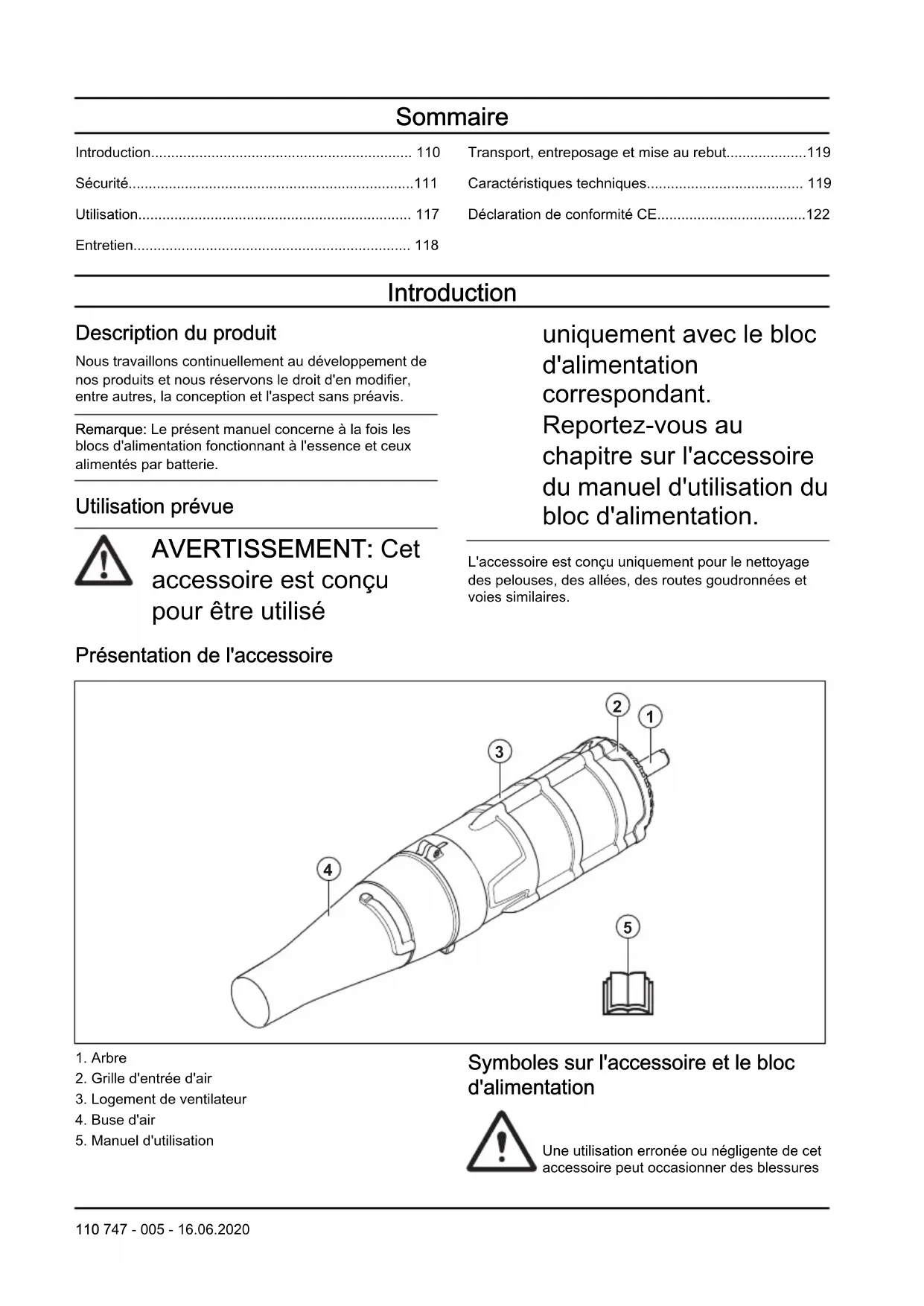 Symboles sur l'accessoire et le bloc d'alimentation Une utilisation erronée ou négligente de cet accessoire peut occasionner des blessures 110 747 - 005 - 16.06.2020graves, voire mortelles, pour l'utilisateur ou d'autres personnes. Avant d'utiliser l'accessoire, lisez at- tentivement le manuel de l'opérateur et assimilez les instructions qu'il con- tient. Cet accessoire est conforme aux directives CE en vigueur. Utilisez des protège-oreilles, des protections pour les yeux et un masque respiratoire homologués. Utilisez des gants de protection homologués. Émissions sonores dans l'environnement selon la directive de la Communauté européenne. Les émissions de l'accessoire sont indiquées au chapitre Caractéristiques techniques et sur l'étiquette. L’opérateur du souffleur doit veiller à ce qu’aucune personne ou aucun ani- mal ne se trouve à moins de 15 mè- tres. Lorsque plusieurs opérateurs partagent le même lieu de travail, la distance de sécurité doit être de 15 mètres au minimum. Le souffleur peut projeter violemment des objets pouvant ricocher. Ceci peut provo- quer des blessures graves aux yeux si l'équipement de protection person- nelle recommandé n'est pas utilisé. Le souffleur peut projeter vio- lemment des objets pouvant ricocher. Ceci peut provo- quer des blessures graves aux yeux si l'équipement de protection personnelle re- commandé n'est pas utilisé. L'utilisateur du produit doit s'assurer qu'aucune per- sonne ou animal ne s'appro- che à moins de 15 mètres pendant le travail. Sectionnement des doigts ou de la main par les pales du ventilateur. N'ouvrez ou ne déposez pas les filets ou dispositifs de sécurité pendant que le moteur est en marche. Remarque: Les autres symboles/autocollants présents sur l'accessoire concernent des exigences de certification spécifiques à certains marchés. Sécurité Définitions de sécurité Des avertissements, des recommandations et des remarques sont utilisés pour souligner des parties spécialement importantes du manuel d'utilisation.