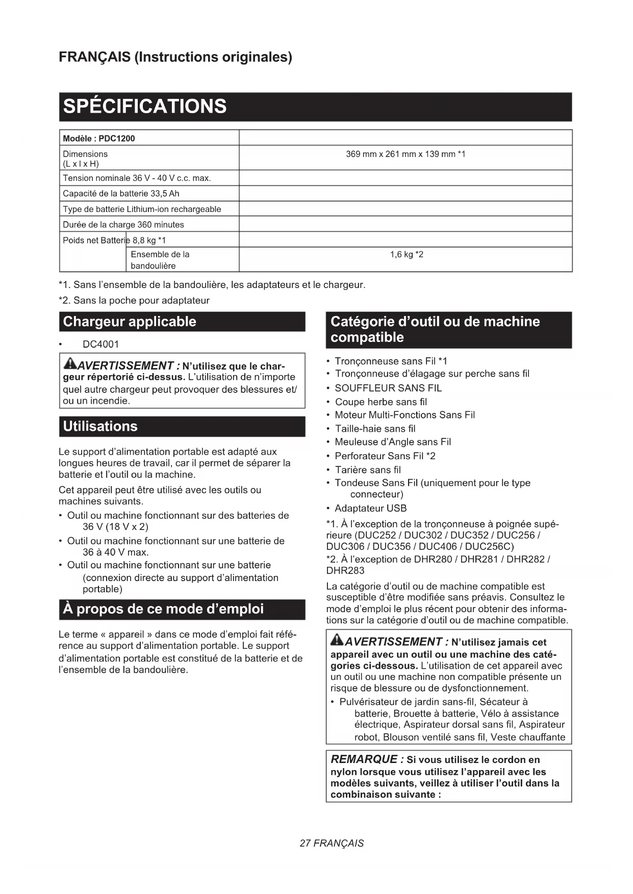 geur répertorié ci-dessus. L’utilisation de n’importe quel autre chargeur peut provoquer des blessures et/ ou un incendie. Utilisations Le support d’alimentation portable est adapté aux longues heures de travail, car il permet de séparer la batterie et l’outil ou la machine. Cet appareil peut être utilisé avec les outils ou machines suivants.