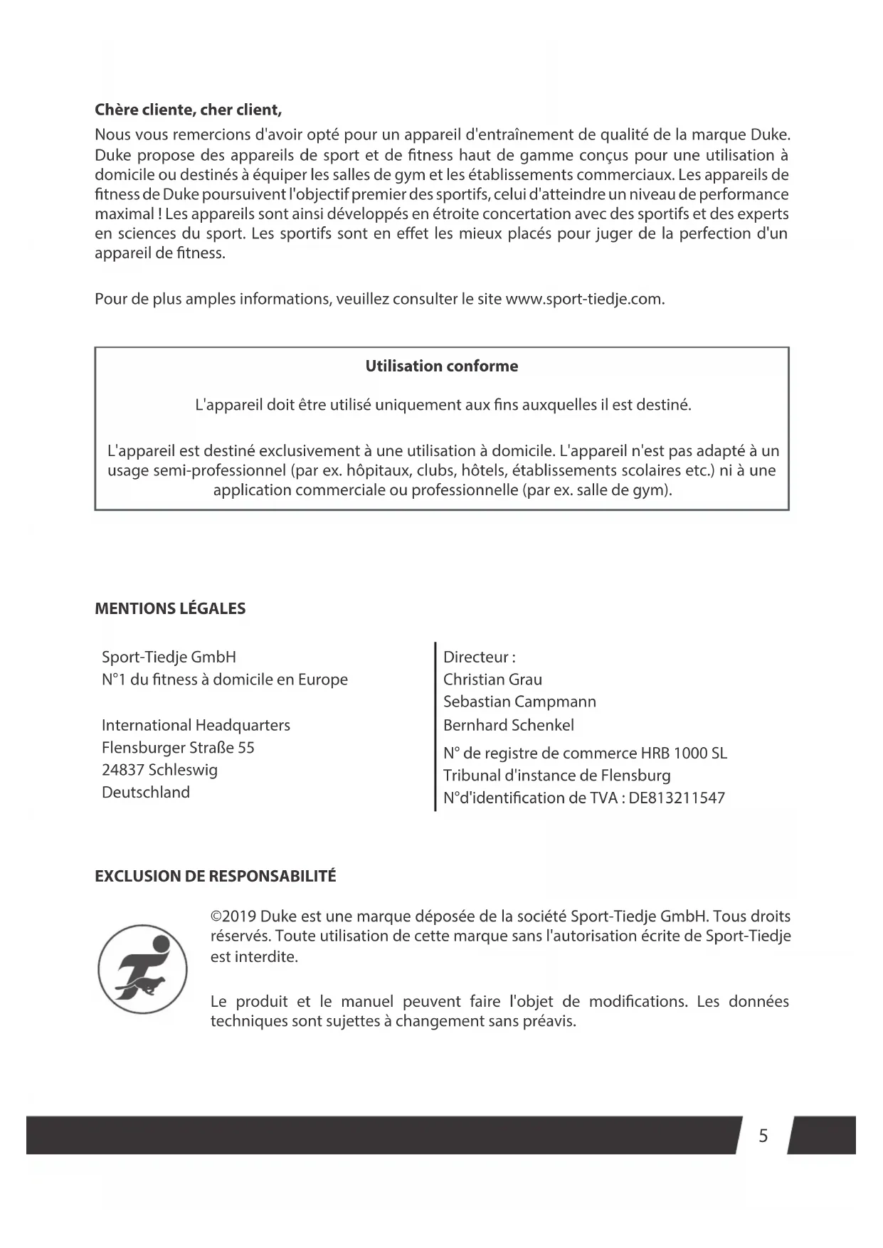 ©2019 Duke est une marque déposée de la société Sport-Tiedje GmbH. Tous droits réservés. Toute utilisation de cette marque sans l'autorisation écrite de Sport-Tiedje est interdite. Le produit et le manuel peuvent faire l'objet de modications. Les données techniques sont sujettes à changement sans préavis. Utilisation conforme L'appareil doit être utilisé uniquement aux ns auxquelles il est destiné. L'appareil est destiné exclusivement à une utilisation à domicile. L'appareil n'est pas adapté à un usage semi-professionnel (par ex. hôpitaux, clubs, hôtels, établissements scolaires etc.) ni à une application commerciale ou professionnelle (par ex. salle de gym).6 RAMEUR IR40
