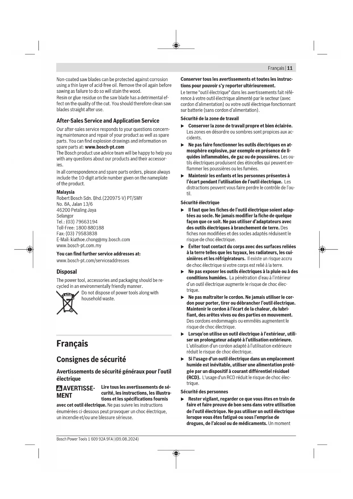 The 0° cut mark (10) indicates the position of the saw blade when making a right-angled cut. The 45° cut mark (9) indic- ates the position of the saw blade when making a 45° cut. For a precise cut, place the circular saw against the work- piece as shown in the figure. We recommend making a test cut. Start-up u Pay attention to the mains voltage. The voltage of the power source must match the voltage specified on the rating plate of the power tool. u Products that are only sold in AUS and NZ: Use a resid- ual current device (RCD) with a nominal residual current of 30 mA or less. Switching on/off u Make sure that you are able to press the On/Off switch without releasing the handle. 3 601 EA2 0K./3 601 EA2 0L./3 601 EA2 0F.: To start the power tool, press and hold the on/off switch (3). Press the lock-on button (2) to lock the on/off switch (3) in this position. To switch off the power tool, release the on/off switch (3); or, if the switch is locked with the lock-on button (2), briefly press the on/off switch (3) and then release it. 3 601 EA2 08./3 601 EA2 0B./3 601 EA2 04./ 3 601 EA2 00./3 601 EA2 07.: To start the power tool, first press the lock-off switch (2), then press and hold the on/off switch (3). To switch off the power tool, release the on/off switch (3). Note: For safety reasons, the on/off switch (3) cannot be locked; it must remain pressed during the entire operation. Practical advice u Pull the plug out of the socket before carrying out any work on the power tool. The width of cut varies depending on the saw blade used. Protect saw blades against shock and impact. Guide the power tool evenly, pushing it gently in the cutting direction in order to achieve a high cut quality. Applying too much pressure will significantly reduce the service life of ap- plication tools and can damage the power tool. Always work with uniform feed and ensure that the speed of the saw blade stays constant. Avoid increasing pressure (e.g. when working with damp wood, pressure-treated con- struction timber or waste wood) and the resulting speed re- duction in order to prevent the saw blade teeth from over- heating. The sawing performance and the quality of the cut essen- tially depend on the condition and the tooth shape of the saw blade. This is why you should only use sharp saw blades that are suitable for the material being machined. Sawing wood Choosing the right saw blade depends on the wood type, wood quality and whether cuts with or against the grain are required. Making cuts in spruce with the grain produces long, spiral- shaped chips. Beech and oak dust is especially detrimental to health. Therefore, work only with dust extraction. Sawing with a parallel guide (see figure D) The parallel guide (11) allows you to make precise cuts along the edge of a workpiece and cut strips with the same dimensions. Loosen the wing bolt (8) and slide the scale of the parallel guide (11) through the guide in the base plate (14). Adjust the desired cutting width as a scale value at the correspond- ing (10) or (9) cut mark, see the section "Cut marks". Retighten the wing bolt (8). Sawing with an auxiliary guide (see figure E) For working on large workpieces or for cutting straight edges, you can securely fasten a board or rail to the work- piece as an auxiliary guide. The circular saw can be guided along the path of this auxiliary guide with the base plate. Maintenance and Service Maintenance and Cleaning u Pull the plug out of the socket before carrying out any work on the power tool. u To ensure safe and efficient operation, always keep the power tool and the ventilation slots clean. In order to avoid safety hazards, if the power supply cord needs to be replaced, this must be done by Bosch or by an after-sales service centre that is authorised to repair Bosch power tools. The retracting blade guard must always be able to move freely and retract automatically. It is therefore important to keep the area around the retracting blade guard clean at all times. Remove dust and chips with a paintbrush. 1 609 92A 9FA | (09.08.2024) Bosch Power ToolsFrançais | 11 Non-coated saw blades can be protected against corrosion using a thin layer of acid-free oil. Remove the oil again before sawing as failure to do so will stain the wood. Resin or glue residue on the saw blade has a detrimental ef- fect on the quality of the cut. You should therefore clean saw blades straight after use. After-Sales Service and Application Service Our after-sales service responds to your questions concern- ing maintenance and repair of your product as well as spare parts. You can find explosion drawings and information on spare parts at: www.bosch-pt.com The Bosch product use advice team will be happy to help you with any questions about our products and their accessor- ies. In all correspondence and spare parts orders, please always include the 10‑digit article number given on the nameplate of the product. Malaysia Robert Bosch Sdn. Bhd.(220975-V) PT/SMY No. 8A, Jalan 13/6 46200 Petaling Jaya Selangor Tel.: (03) 79663194 Toll-Free: 1800 880188 Fax: (03) 79583838 E-Mail: kiathoe.chong@my.bosch.com www.bosch-pt.com.my You can find further service addresses at: www.bosch-pt.com/serviceaddresses Disposal The power tool, accessories and packaging should be re- cycled in an environmentally friendly manner. Do not dispose of power tools along with household waste. Français Consignes de sécurité Avertissements de sécurité généraux pour l’outil électrique AVERTISSE- MENT Lire tous les avertissements de sé- curité, les instructions, les illustra- tions et les spécifications fournis avec cet outil électrique. Ne pas suivre les instructions énumérées ci-dessous peut provoquer un choc électrique, un incendie et/ou une blessure sérieuse. Conserver tous les avertissements et toutes les instruc- tions pour pouvoir s'y reporter ultérieurement. Le terme "outil électrique" dans les avertissements fait réfé- rence à votre outil élect
