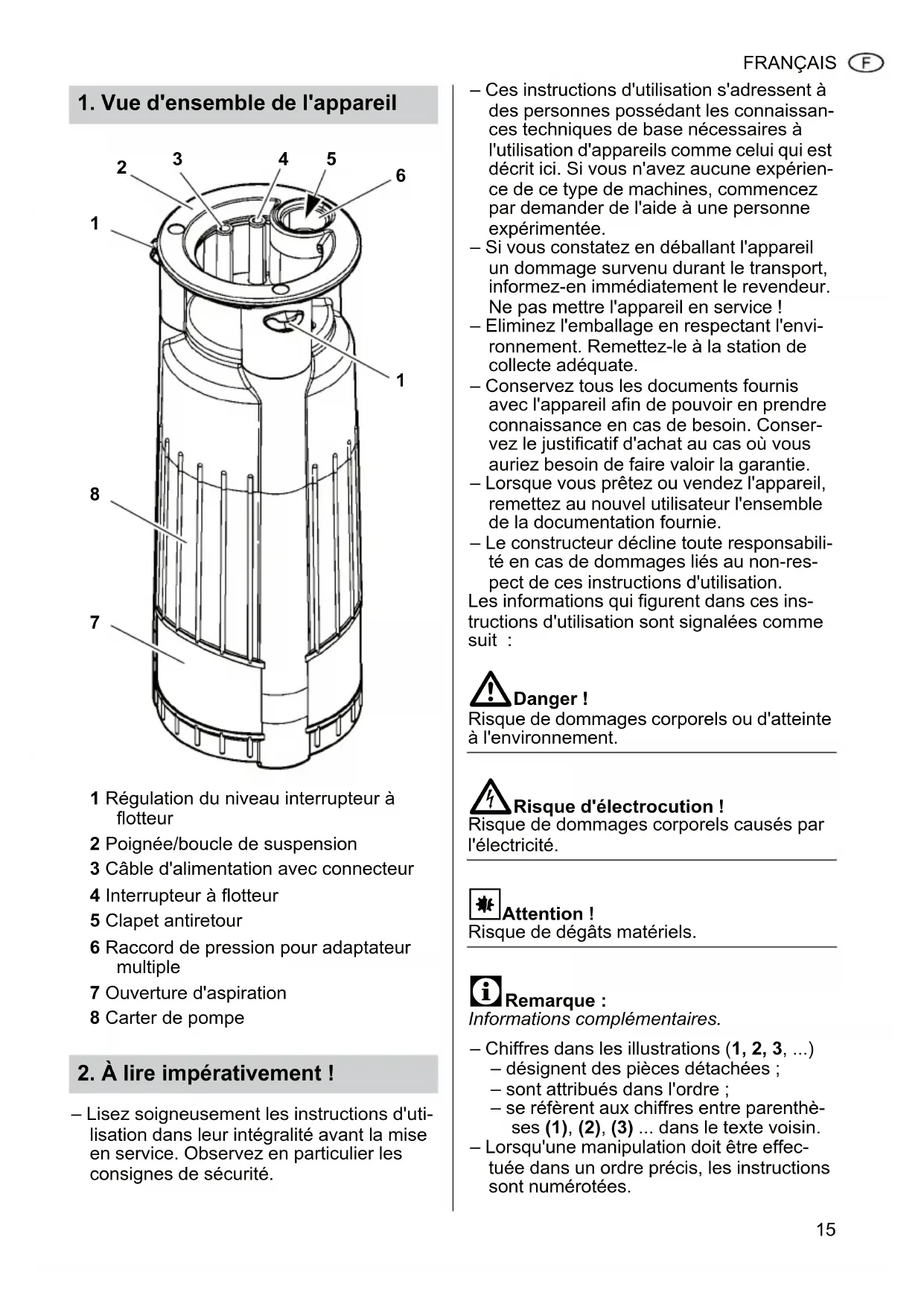 sécurité – Respectez les consignes de sécurité sui- vantes en utilisant cet appareil afin d'élimi- ner tout risque de dommage corporel ou matériel. – Respectez également les directives léga- les ou les prescriptions en matière de pré- vention des accidents relatives au manie- ment des pompes immergées. – Respecter les dispositions des normes DIN VDE 0100 -702, -738 en cas d'utilisa- tion de l'appareil dans des piscines, des étangs de jardin et dans leur zone de pro- tection. Tenir également compte des prescriptions locales, s'il y en a. – La protection par fusibles de l'appareil doit s'effectuer avec un interrupteur de protec- tion à courant différentiel résiduel (RCD) avec un courant de défaut de référence de 30 mA au plus. ADangers d'ordre général ! N'utilisez pas l'appareil quand des person- nes se trouvent en contact avec le liquide re- foulé (p. ex. dans une piscine ou un étang de jardin) ! Les dangers résiduels suivants subsistent toujours en cas d'utilisation de pompes im- mergées – on ne peut les éliminer complète- ment, même en prenant toutes les précau- tions requises. ADangers dus à des influences de l'environnement ! L'appareil ne doit pas être utilisé dans des locaux explosibles ni à proximité de liquides ou de gaz combustibles ! BDangers dus à l'électricité ! Ne pas toucher la fiche secteur avec des mains humides ! Toujours débrancher en re- tirant la fiche secteur, et non en tirant sur le câble. Le raccordement ne doit se faire que sur des prises de courant à contact de sécurité ins- tallées, mises à la terre et contrôlées dans les règles de l'art. La tension de secteur et la protection par fusibles doivent correspondre aux caractéristiques techniques.