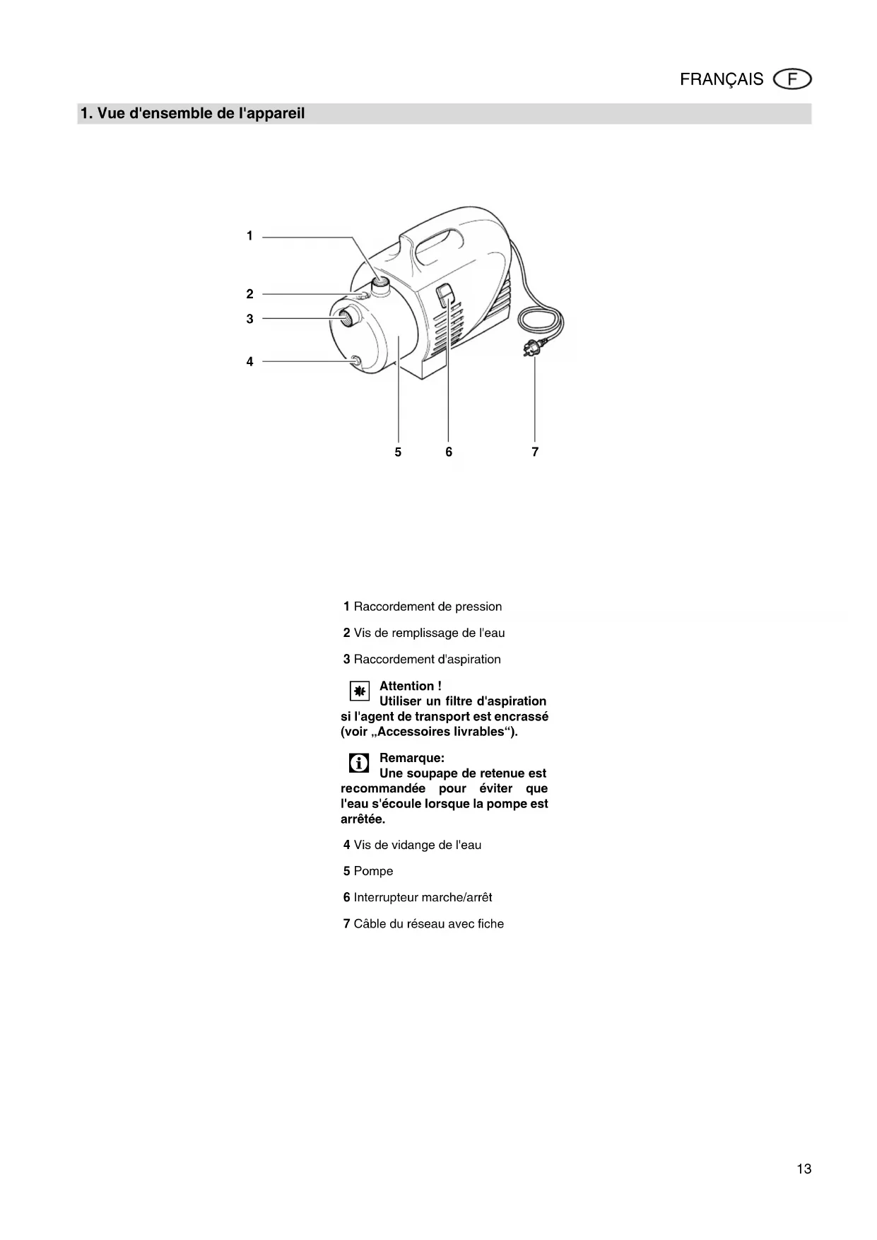 forme, mettre l'appareil hors circuit. La pompe et la conduite d'aspiration doi- vent être raccordées et remplies (voir „Avant la mise en service“).