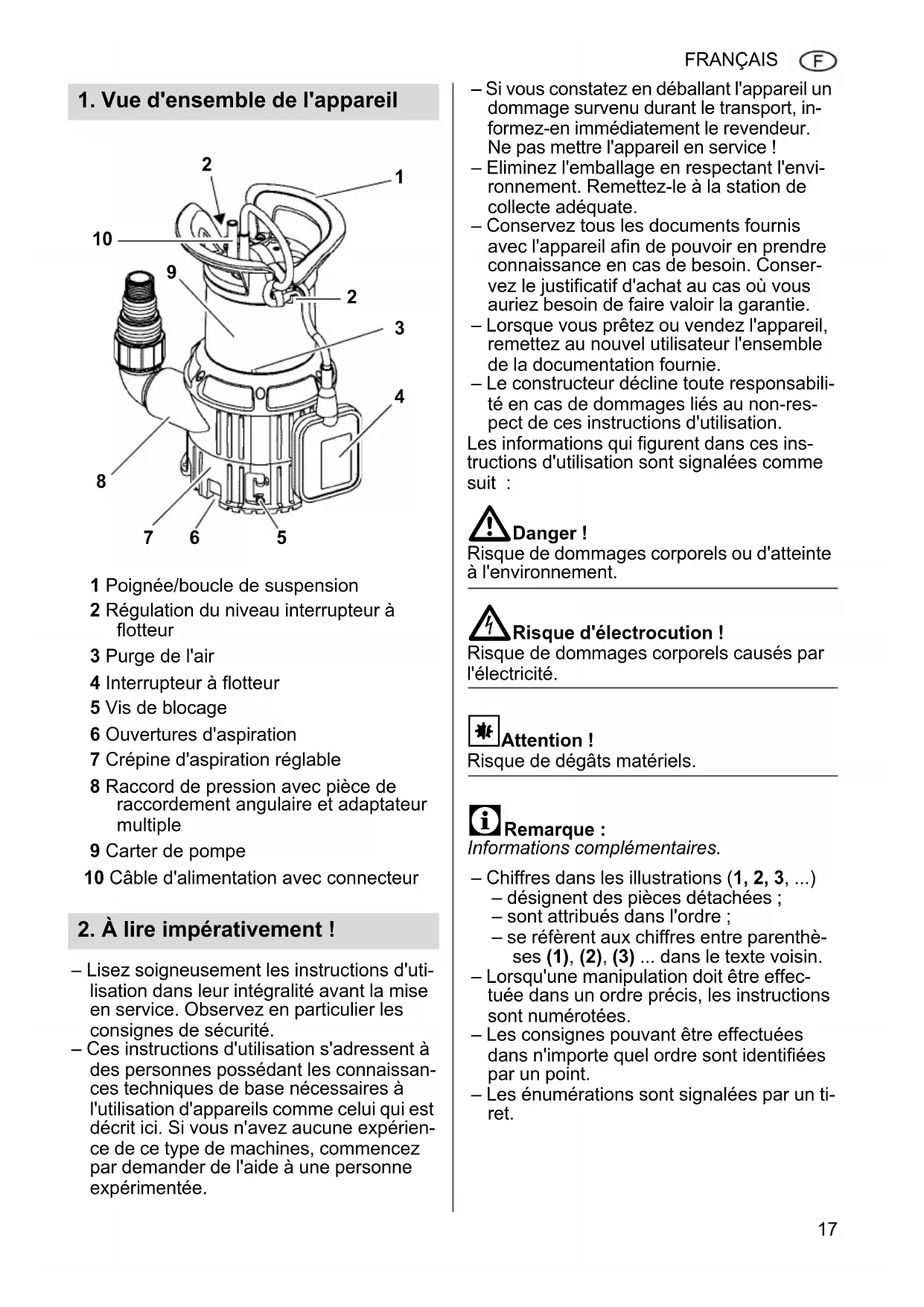 FRANÇAIS – Lisez soigneusement les instructions d'uti- lisation dans leur intégralité avant la mise en service. Observez en particulier les consignes de sécurité. – Ces instructions d'utilisation s'adressent à des personnes possédant les connaissan- ces techniques de base nécessaires à l'utilisation d'appareils comme celui qui est décrit ici. Si vous n'avez aucune expérien- ce de ce type de machines, commencez par demander de l'aide à une personne expérimentée. – Si vous constatez en déballant l'appareil un dommage survenu durant le transport, in- formez-en immédiatement le revendeur. Ne pas mettre l'appareil en service ! – Eliminez l'emballage en respectant l'envi- ronnement. Remettez-le à la station de collecte adéquate. – Conservez tous les documents fournis avec l'appareil afin de pouvoir en prendre connaissance en cas de besoin. Conser- vez le justificatif d'achat au cas où vous auriez besoin de faire valoir la garantie. – Lorsque vous prêtez ou vendez l'appareil, remettez au nouvel utilisateur l'ensemble de la documentation fournie. – Le constructeur décline toute responsabili- té en cas de dommages liés au non-res- pect de ces instructions d'utilisation. Les informations qui figurent dans ces ins- tructions d'utilisation sont signalées comme suit : ADanger ! Risque de dommages corporels ou d'atteinte à l'environnement. BRisque d'électrocution ! Risque de dommages corporels causés par l'électricité. A Attention ! Risque de dégâts matériels. 3Remarque : Informations complémentaires. – Chiffres dans les illustrations (1, 2, 3, ...) – désignent des pièces détachées ; – sont attribués dans l'ordre ; – se réfèrent aux chiffres entre parenthè- ses (1), (2), (3) ... dans le texte voisin. – Lorsqu'une manipulation doit être effec- tuée dans un ordre précis, les instructions sont numérotées. – Les consignes pouvant être effectuées dans n'importe quel ordre sont identifiées par un point. – Les énumérations sont signalées par un ti- ret.