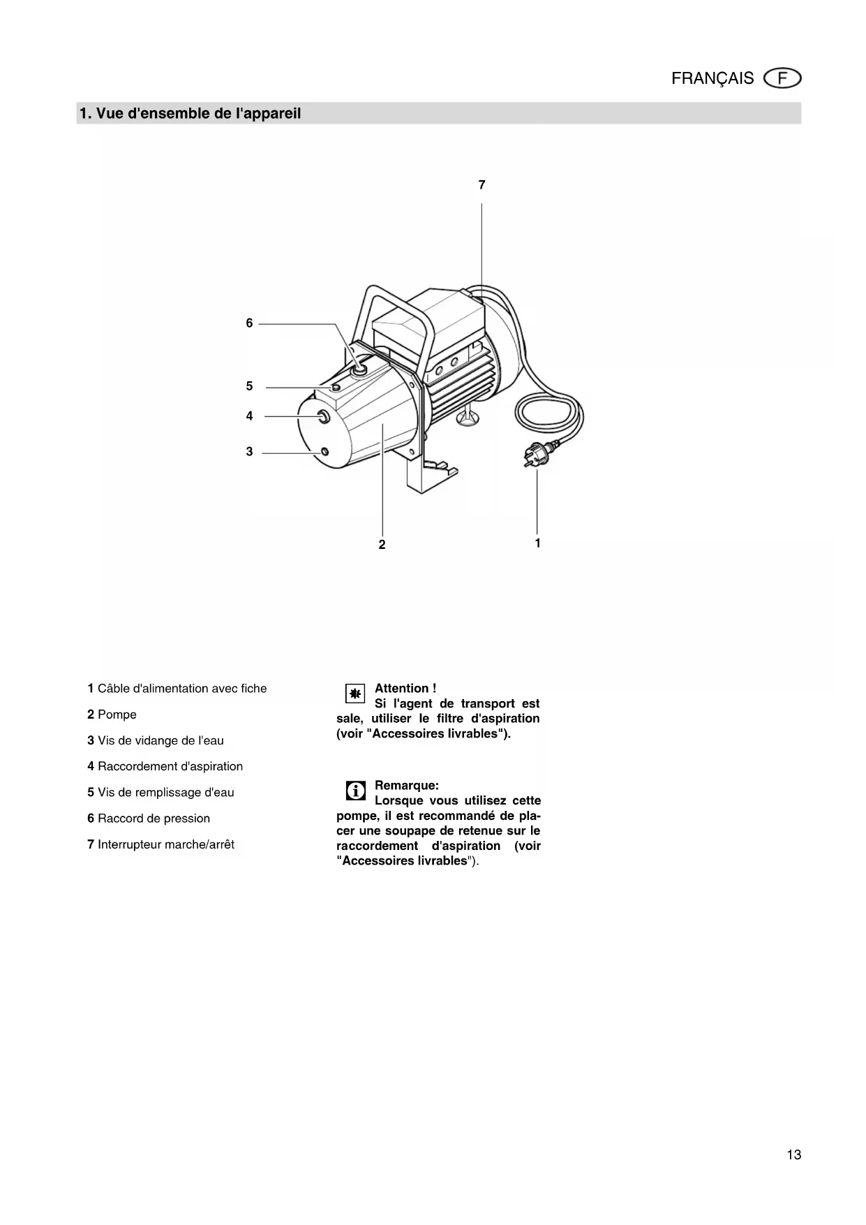 prescriptions L'appareil ne doit pas être utilisé pour la fourniture d'eau potable ou le transport de denrées alimentaires. Ne pas pomper de matières explosives, combustibles, agressives ou présentant un danger pour la santé. L'appareil ne convient pas à une utilisa- tion industrielle ou professionnelle. Il est interdit de procéder à des modifica- tions arbitraires de l'appareil et d'utiliser