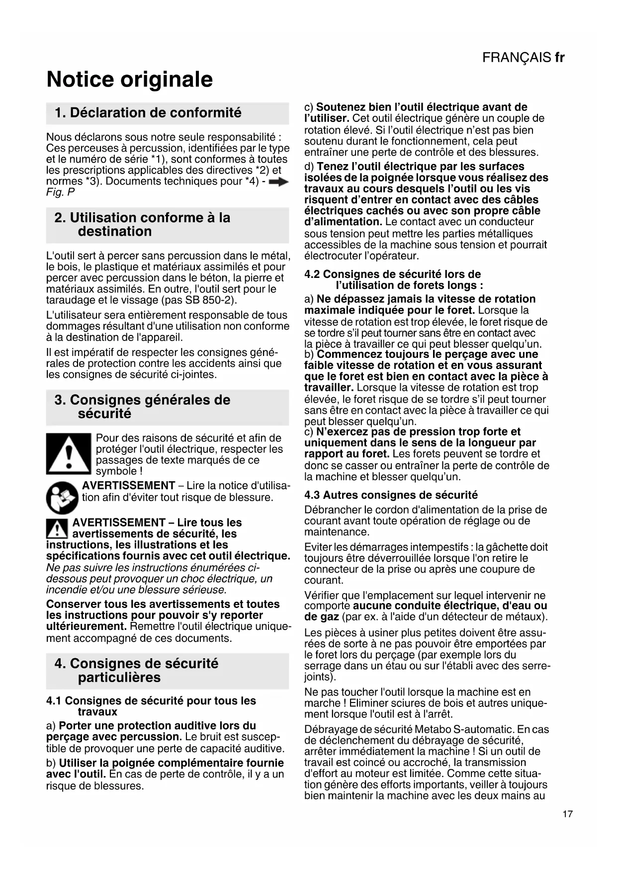 ig. P L'outil sert à percer sans percussion dans le métal, le bois, le plastique et matériaux assimilés et pour percer avec percussion dans le béton, la pierre et matériaux assimilés. En outre, l'outil sert pour le taraudage et le vissage (pas SB 850-2). L'utilisateur sera entièrement responsable de tous dommages résultant d'une utilisation non conforme à la destination de l'appareil. Il est impératif de respecter les consignes géné- rales de protection contre les accidents ainsi que les consignes de sécurité ci-jointes. Pour des raisons de sécurité et afin de protéger l'outil électrique, respecter les passages de texte marqués de ce symbole ! AVERTISSEMENT – Lire la notice d'utilisa- tion afin d'éviter tout risque de blessure. AVERTISSEMENT – Lire tous les avertissements de sécurité, les instructions, les illustrations et les spécifications fournis avec cet outil électrique. Ne pas suivre les instructions énumérées ci- dessous peut provoquer un choc électrique, un incendie et/ou une blessure sérieuse. Conserver tous les avertissements et toutes les instructions pour pouvoir s'y reporter ultérieurement. Remettre l'outil électrique unique- ment accompagné de ces documents.