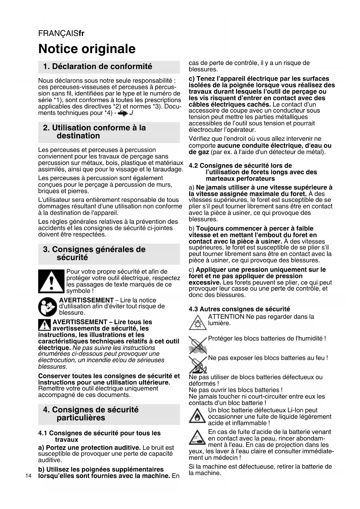 Nous déclarons sous notre seule responsabilité : ces perceuses-visseuses et perceuses à percus- sion sans fil, identifiées par le type et le numéro de série *1), sont conformes à toutes les prescriptions applicables des directives *2) et normes *3). Docu- ments techniques pour *4) - fig. J Les perceuses et perceuses à percussion conviennent pour les travaux de perçage sans percussion sur métaux, bois, plastique et matériaux assimilés, ainsi que pour le vissage et le taraudage. Les perceuses à percussion sont également conçues pour le perçage à percussion de murs, briques et pierres. L'utilisateur sera entièrement responsable de tous dommages résultant d'une utilisation non conforme à la destination de l'appareil. Les règles générales relatives à la prévention des accidents et les consignes de sécurité ci-jointes doivent être respectées. Pour votre propre sécurité et afin de protéger votre outil électrique, respectez les passages de texte marqués de ce symbole ! AVERTISSEMENT – Lire la notice d'utilisation afin d'éviter tout risque de blessure. AVERTISSEMENT – Lire tous les avertissements de sécurité, les instructions, les illustrations et les caractéristiques techniques relatifs à cet outil électrique. Ne pas suivre les instructions énumérées ci-dessous peut provoquer une électrocution, un incendie et/ou de sérieuses blessures. Conserver toutes les consignes de sécurité et instructions pour une utilisation ultérieure. Remettre votre outil électrique uniquement accompagné de ces documents.