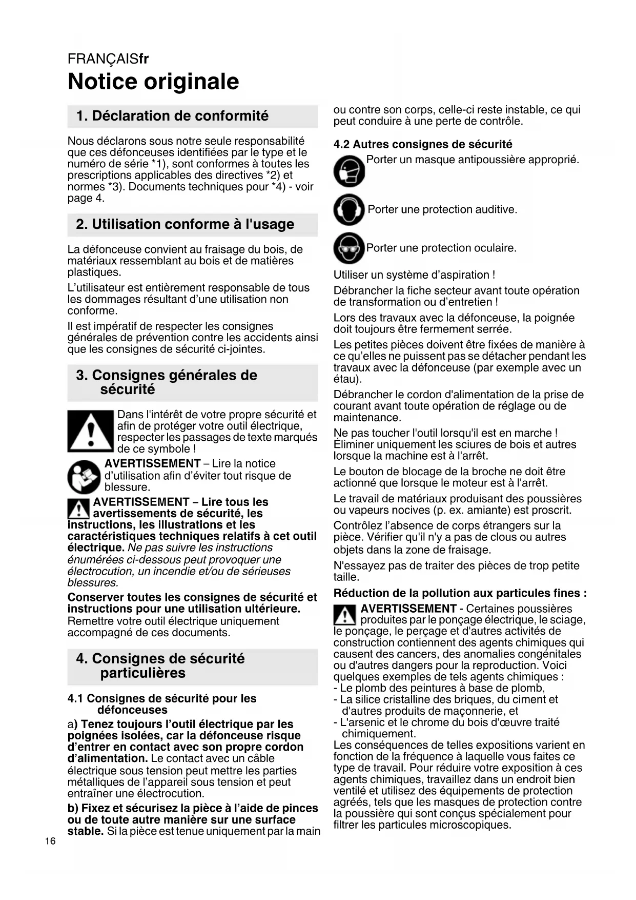 Notice originale Nous déclarons sous notre seule responsabilité que ces défonceuses identifiées par le type et le numéro de série *1), sont conformes à toutes les prescriptions applicables des directives *2) et normes *3). Documents techniques pour *4) - voir page 4. La défonceuse convient au fraisage du bois, de matériaux ressemblant au bois et de matières plastiques. L’utilisateur est entièrement responsable de tous les dommages résultant d’une utilisation non conforme. Il est impératif de respecter les consignes générales de prévention contre les accidents ainsi que les consignes de sécurité ci-jointes. Dans l'intérêt de votre propre sécurité et afin de protéger votre outil électrique, respecter les passages de texte marqués de ce symbole ! AVERTISSEMENT – Lire la notice d’utilisation afin d’éviter tout risque de blessure. AVERTISSEMENT – Lire tous les avertissements de sécurité, les instructions, les illustrations et les caractéristiques techniques relatifs à cet outil électrique. Ne pas suivre les instructions énumérées ci-dessous peut provoquer une électrocution, un incendie et/ou de sérieuses blessures. Conserver toutes les consignes de sécurité et instructions pour une utilisation ultérieure. Remettre votre outil électrique uniquement accompagné de ces documents.
