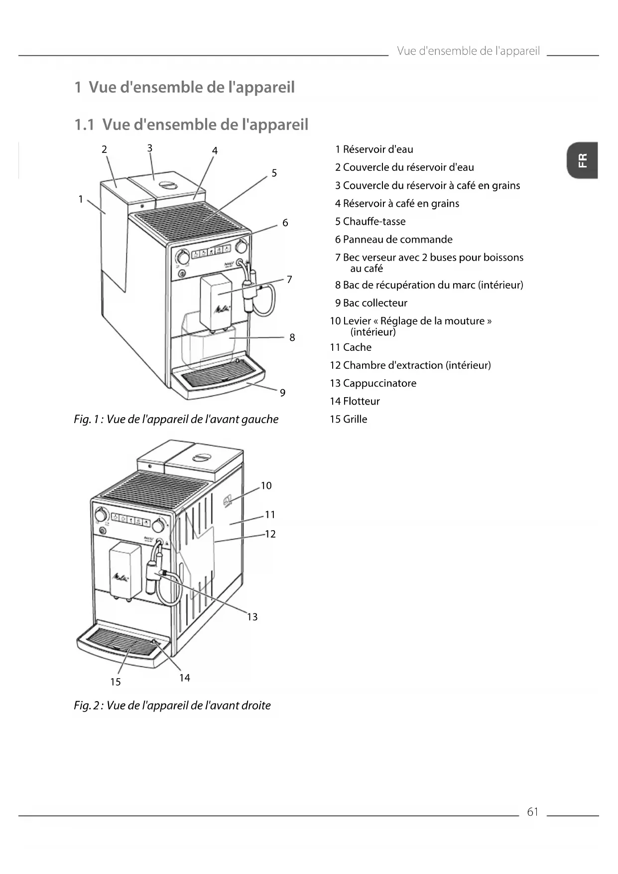 Fig. 2 : Vue de l'appareil de l'avant droite 1 Réservoir d'eau 2 Couvercle du réservoir d'eau 3 Couvercle du réservoir à café en grains 4 Réservoir à café en grains 5 Chaue-tasse 6 Panneau de commande 7 Bec verseur avec 2buses pour boissons au café 8 Bac de récupération du marc (intérieur) 9 Bac collecteur 10 Levier «Réglage de la mouture» (intérieur) 11 Cache 12 Chambre d'extraction (intérieur) 13 Cappuccinatore 14 Flotteur 15 GrilleVue d'ensemble de l'appareil