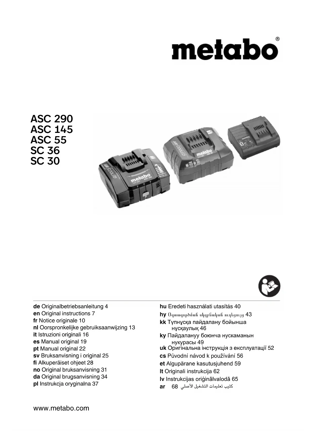 Notice originale Nous déclarons sous notre seule responsabilité, que ces chargeurs, identifiés par le type et le numéro de série *1), sont conformes à toutes les prescriptions applicables des directives *2) et normes *3). Documents techniques pour *4) - voir page 3. Les chargeurs sont uniquement prévus pour recharger des batteries originales de Metabo et du CAS (Cordless Alliance System). Cet appareil ne doit pas être utilisé par des personnes présentant des capacités physiques, sensorielles ou mentales réduites ou manquant d'expérience et/ou de connaissances, sauf si elles sont surveillées par une personne responsable de leur sécurité ou qu'elles reçoivent des instructions sur l'utilisation de l'appareil. Le chargeur ASC 290 convient pour recharger des batteries Li-Ion (12 V - 36 V, 1,3 Ah - 10 Ah, 3 - 10 cellules). Cet appareil convient pour recharger des appareils électriques avec un port USB-C (comme des smartphones, des lecteurs MP3, des tablettes, etc.) - pas de transfert de données. Le chargeur ASC 145 convient pour recharger des batteries Li-Ion (12 V - 36 V, 1,3 Ah - 10 Ah,