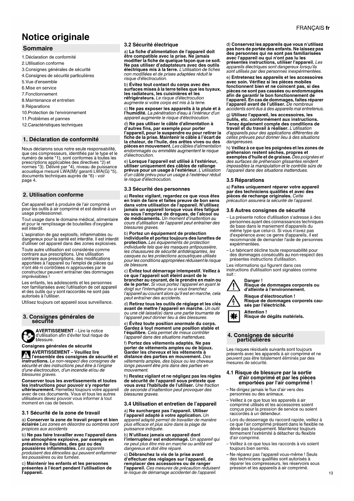 - Utilisation conforme 3. Consignes générales de sécurité 4. Consignes de sécurité particulières