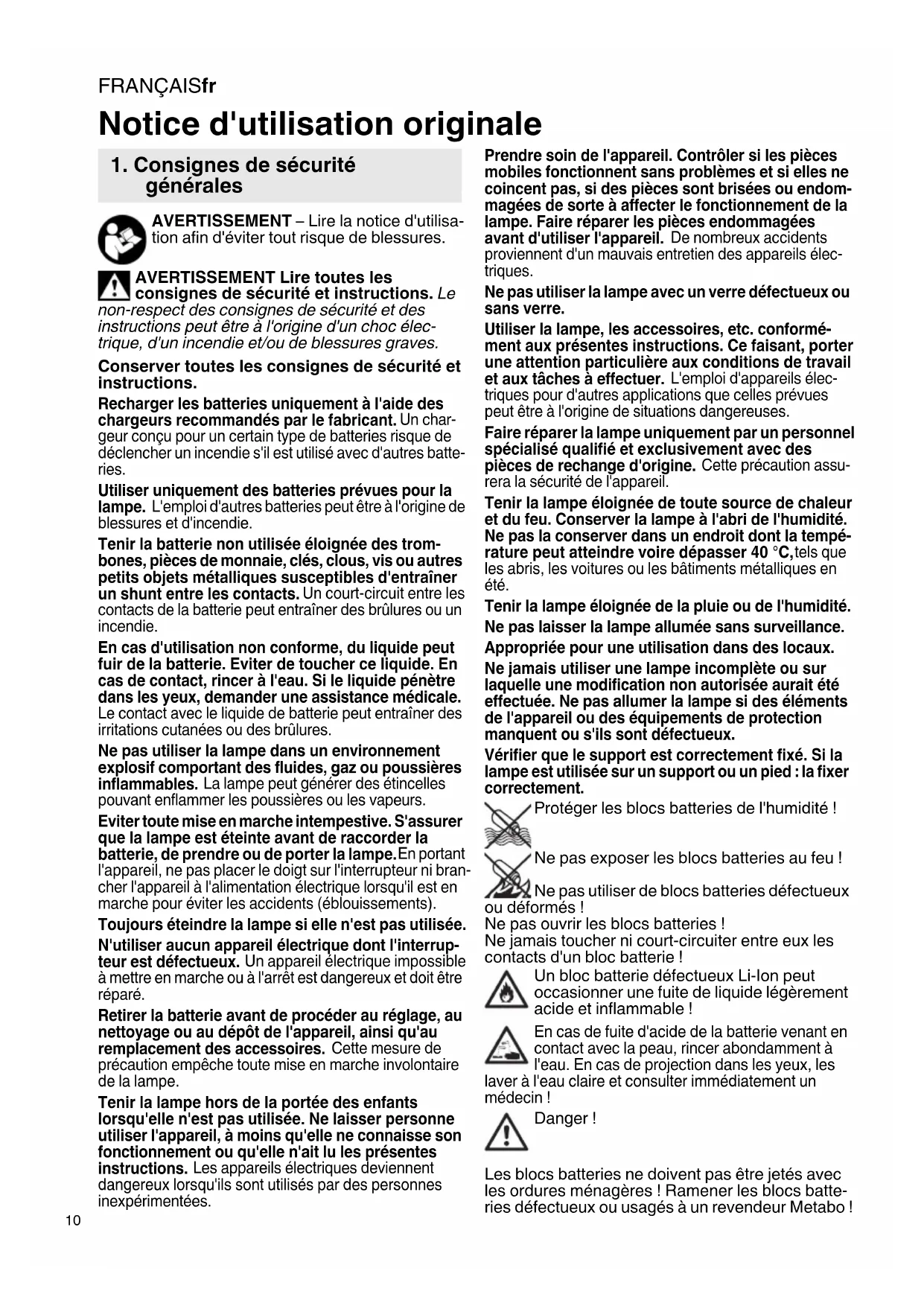 AVERTISSEMENT – Lire la notice d'utilisa- tion afin d'éviter tout risque de blessures. AVERTISSEMENT Lire toutes les consignes de sécurité et instructions. Le non-respect des consignes de sécurité et des instructions peut être à l'origine d'un choc élec- trique, d'un incendie et/ou de blessures graves. Conserver toutes les consignes de sécurité et instructions. Recharger les batteries uniquement à l'aide des chargeurs recommandés par le fabricant. Un char- geur conçu pour un certain type de batteries risque de déclencher un incendie s'il est utilisé avec d'autres batte- ries. Utiliser uniquement des batteries prévues pour la lampe. L'emploi d'autres batteries peut être à l'origine de blessures et d'incendie. Tenir la batterie non utilisée éloignée des trom- bones, pièces de monnaie, clés, clous, vis ou autres petits objets métalliques susceptibles d'entraîner un shunt entre les contacts. Un court-circuit entre les contacts de la batterie peut entraîner des brûlures ou un incendie. En cas d'utilisation non conforme, du liquide peut fuir de la batterie. Eviter de toucher ce liquide. En cas de contact, rincer à l'eau. Si le liquide pénètre dans les yeux, demander une assistance médicale. Le contact avec le liquide de batterie peut entraîner des irritations cutanées ou des brûlures. Ne pas utiliser la lampe dans un environnement explosif comportant des fluides, gaz ou poussières inflammables. La lampe peut générer des étincelles pouvant enflammer les poussières ou les vapeurs. Eviter toute mise en marche intempestive. S'assurer que la lampe est éteinte avant de raccorder la batterie, de prendre ou de porter la lampe. En portant l'appareil, ne pas placer le doigt sur l'interrupteur ni bran- cher l'appareil à l'alimentation électrique lorsqu'il est en marche pour éviter les accidents (éblouissements). Toujours éteindre la lampe si elle n'est pas utilisée. N'utiliser aucun appareil électrique dont l'interrup- teur est défectueux. Un appareil électrique impossible à mettre en marche ou à l'arrêt est dangereux et doit être réparé. Retirer la batterie avant de procéder au réglage, au nettoyage ou au dépôt de l'appareil, ainsi qu'au remplacement des accessoires. Cette mesure de précaution empêche toute mise en marche involontaire de la lampe. Tenir la lampe hors de la portée des enfants lorsqu'elle n'est pas utilisée. Ne laisser personne utiliser l'appareil, à moins qu'elle ne connaisse son fonctionnement ou qu'elle n'ait lu les présentes instructions. Les appareils électriques deviennent dangereux lorsqu'ils sont utilisés par des personnes inexpérimentées. Prendre soin de l'appareil. Contrôler si les pièces mobiles fonctionnent sans problèmes et si elles ne coincent pas, si des pièces sont brisées ou endom- magées de sorte à affecter le fonctionnement de la lampe. Faire réparer les pièces endommagées avant d'utiliser l'appareil. De nombreux accidents proviennent d'un mauvais entretien des appareils élec- triques. Ne pas utiliser la lampe avec un verre défectueux ou sans verre. Utiliser la lampe, les accessoires, etc. conformé- ment aux présentes instructions. Ce faisant, porter une attention particulière aux conditions de travail et aux tâches à effectuer. L'emploi d'appareils élec- triques pour d'autres applications que celles prévues peut être à l'origine de situations dangereuses. Faire réparer la lampe uniquement par un personnel spécialisé qualifié et exclusivement avec des pièces de rechange d'origine. Cette précaution assu- rera la sécurité de l'appareil. Tenir la lampe éloignée de toute source de chaleur et du feu. Conserver la lampe à l'abri de l'humidité. Ne pas la conserver dans un endroit dont la tempé- rature peut atteindre voire dépasser 40 °C, tels que les abris, les voitures ou les bâtiments métalliques en été. Tenir la lampe éloignée de la pluie ou de l'humidité. Ne pas laisser la lampe allumée sans surveillance. Appropriée pour une utilisation dans des locaux. Ne jamais utiliser une lampe incomplète ou sur laquelle une modification non autorisée aurait été effectuée. Ne pas allumer la lampe si des éléments de l'appareil ou des équipements de protection manquent ou s'ils sont défectueux. Vérifier que le support est correctement fixé. Si la lampe est utilisée sur un support ou un pied : la fixer correctement. Protéger les blocs batteries de l'humidité ! Ne pas exposer les blocs batteries au feu ! Ne pas utiliser de blocs batteries défectueux ou déformés ! Ne pas ouvrir les blocs batteries ! Ne jamais toucher ni court-circuiter entre eux les contacts d'un bloc batterie ! Un bloc batterie défectueux Li-Ion peut occasionner une fuite de liquide légèrement acide et inflammable ! En cas de fuite d'acide de la batterie venant en contact avec la peau, rincer abondamment à l'eau. En cas de projection dans les yeux, les laver à l'eau claire et consulter immédiatement un médecin ! Danger ! Les blocs batteries ne doivent pas être jetés avec les ordures ménagères ! Ramener les blocs batte- ries défectueux ou usagés à un revendeur Metabo ! Notice d'utilisation originale