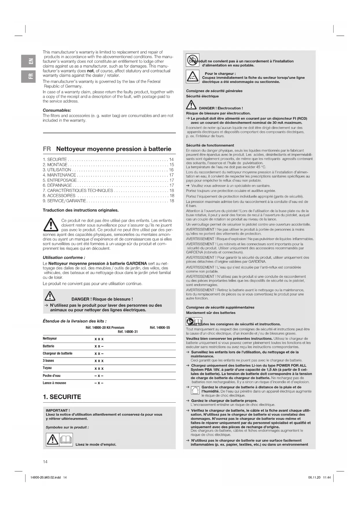 Traduction des instructions originales. Ce produit ne doit pas être utilisé par des enfants. Les enfants doivent rester sous surveillance pour s’assurer qu’ils ne jouent pas avec le produit. Ce produit ne peut être utilisé par des per- sonnes ayant des capacités physiques, sensorielles ou mentales amoin- dries ou ayant un manque d’expérience et de connaissances que si elles sont surveillées ou ont été formées à un usage sûr du produit et com- prennent les risques qui en découlent. Utilisation conforme: Le Nettoyeur moyenne pression à batterie GARDENA sert au net- toyage des dalles de sol, des meubles / outils de jardin, des vélos, des véhicules, des bateaux et au nettoyage doux dans le jardin privé familial ou de loisir. Le produit ne convient pas pour une utilisation continue. DANGER! Risque de blessure! v N’utilisez pas le produit pour laver des personnes ou des animaux ou pour nettoyer des lignes électriques. Étendue de la livraison des kits : Réf. 14800-20 Kit Premium Réf. 14800-31 Réf. 14800-55 Nettoyeur x x x Batterie x x – Chargeur de batterie x x – 3 buses x x x Tuyau x x x Poche d’eau – x – Lance à mousse – x – Le produit ne convient pas à un raccordement à l’installation d’alimentation en eau potable. Pour le chargeur: Coupez immédiatement la fiche du secteur lorsqu’une ligne électrique a été endommagée ou sectionnée. Consignes de sécurité générales Sécurité électrique DANGER! Électrocution ! Risque de blessure par électrocution. v Le produit doit être alimenté en courant par un disjoncteur FI (RCD) avec un courant de déclenchement nominal de 30 mA maximum. Il convient de noter qu’aucun liquide ne doit être dirigé directement sur des appareils électriques et dispositifs comportant des composants électriques, p.ex. l’intérieur de fours. Sécurité de fonctionnement En raison du danger physique, seuls les liquides mentionnés par le fabricant peuvent être épandus avec le produit. Les acides, désinfectants et imperméabili- sants sont également proscrits, de même que les nettoyants agressifs contenant des solvants, l’essence et l’huile de pulvérisation. La température de l’eau ne doit pas excéder 45 °C. Lors du raccordement du nettoyeur moyenne pression à l’installation d’alimen- tation en eau, il convient de respecter les prescriptions sanitaires spécifiques au pays pour empêcher le reflux d’eau non potable. v Veuillez vous adresser à un spécialiste en sanitaire. Portez toujours une protection oculaire et auditive agréée. Portez l’équipement de protection individuelle approprié (gants de sécurité). La pression maximale admise lors du raccordement à la conduite d’eau est de 6bars. Attention à l’ouverture du pistolet ! Lors de l’utilisation de la buse plate ou de la buse rotative, il peut y avoir des forces de recul à l’ouverture du pistolet, auquel cas un couple de rotation se produit au niveau de la lance. Un verrouillage permet de sécuriser le pistolet contre une ouverture accidentelle. AVERTISSEMENT! Ne pas utiliser le produit à portée de personnes à moins qu’elles ne portent des vêtements de protection. AVERTISSEMENT! Risque d’explosion ! Ne pas pulvériser de liquides inflammables. AVERTISSEMENT! Les robinets et les connecteurs sont importants pour la sécurité du produit. Utiliser uniquement des accessoires recommandés par GARDENA (robinets et connecteurs). AVERTISSEMENT! Pour garantir la sécurité du produit, utiliser uniquement des pièces détachées d’origine validées par GARDENA. AVERTISSEMENT! L’eau qui s’est écoulée par l’anti-reflux est considérée comme non potable. AVERTISSEMENT! N’utilisez pas le produit si une conduite de raccordement ou des pièces importantes telles que les dispositifs de sécurité ou le pistolet, sont endommagées. AVERTISSEMENT! Retirez la batterie avant le nettoyage ou la maintenance, lors du remplacement de pièces ou si vous convertissez le produit pour une autre fonction. Consignes de sécurité supplémentaires Maniement sûr des batteries Lisez toutes les consignes de sécurité et instructions. Tout manquement au respect des consignes de sécurité et instructions peut être la cause d’un choc électrique, d’un incendie et / ou de blessures graves. Veuillez bien conserver les présentes instructions. Utilisez le chargeur de batterie uniquement si vous pouvez cerner pleinement toutes les fonctions et les exécuter sans restrictions ou avez reçu les instructions correspondantes. v Surveillez les enfants lors de l’utilisation, du nettoyage et de la maintenance. Ceci garantit que les enfants ne jouent pas avec le chargeur de batterie. v Chargez uniquement des batteries Li-ion du type POWER FOR ALL System PBA 18V. à partir d’une capacité de 1,5 Ah (à partir de 5 cel- lules de batterie). La tension de batterie doit correspondre à la tension de charge de batterie du chargeur de batterie. Ne rechargez pas de batteries non rechargeables. Il y a sinon un risque d’incendie et d’explosion.
