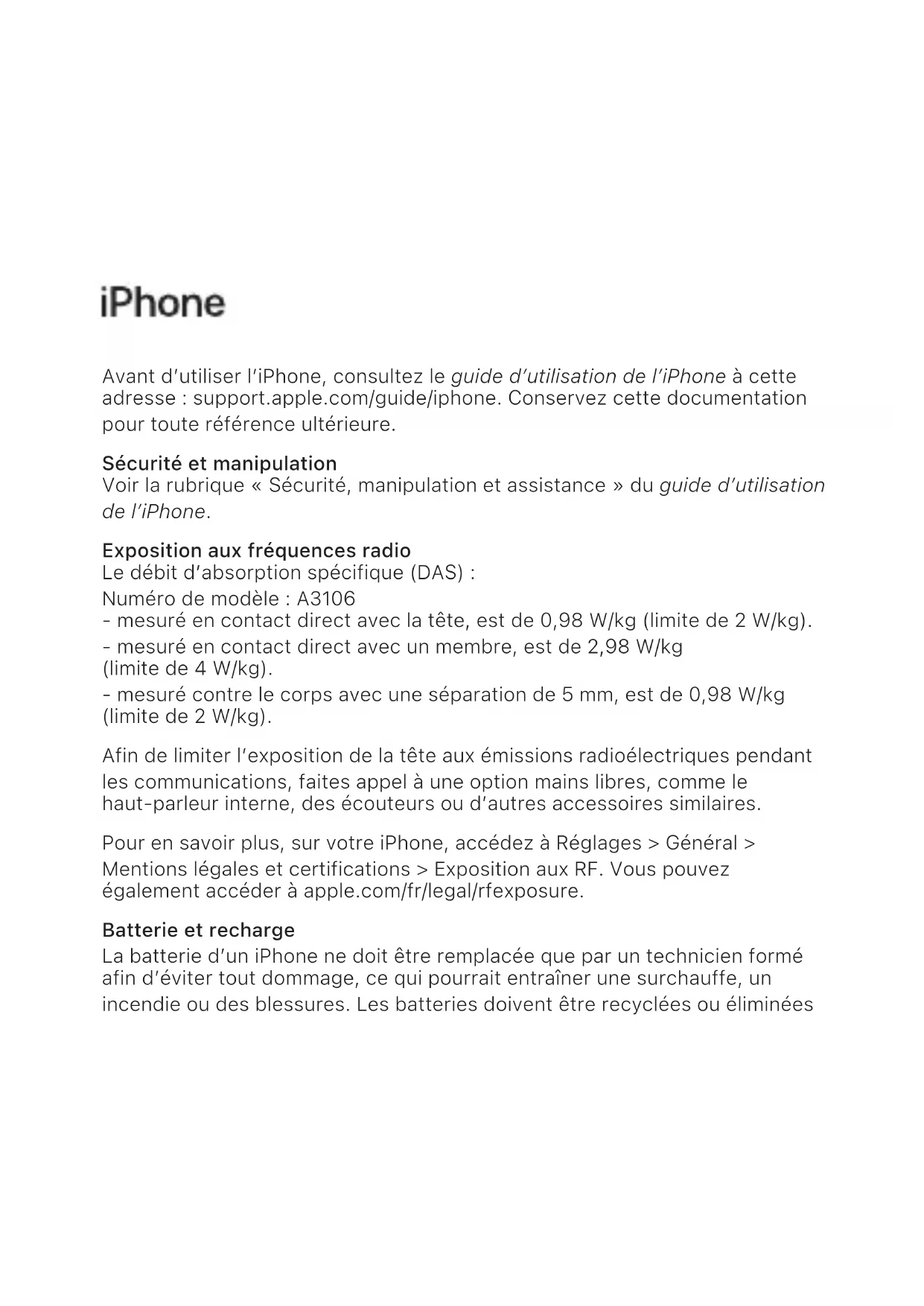 Avant d’utiliser l’iPhone, consultez le guide d’utilisation de l’iPhone à cette adresse: support.apple.com/guide/iphone. Conservez cette documentation pour toute référence ultérieure. Sécurité et manipulation Voir la rubrique «Sécurité, manipulation et assistance» du guide d’utilisation de l’iPhone. Exposition aux fréquences radio Le débit d’absorption spécifique (DAS) : Numéro de modèle : A3106 - mesuré en contact direct avec la tête, est de 0,98 W/kg (limite de 2W/kg). - mesuré en contact direct avec un membre, est de 2,98 W/kg (limite de 4 W/kg). - mesuré contre le corps avec une séparation de 5 mm, est de 0,98 W/kg (limite de 2 W/kg). Afin de limiter l’exposition de la tête aux émissions radioélectriques pendant les communications, faites appel à une option mains libres, comme le haut-parleur interne, des écouteurs ou d’autres accessoires similaires. Pour en savoir plus, sur votre iPhone, accédez à Réglages > Général > Mentions légales et certifications > Exposition aux RF. Vous pouvez également accéder à apple.com/fr/legal/rfexposure. Batterie et recharge La batterie d’un iPhone ne doit être remplacée que par un technicien formé afin d’éviter tout dommage, ce qui pourrait entraîner une surchauffe, un incendie ou des blessures. Les batteries doivent être recyclées ou éliminéesséparément des ordures ménagères, et conformément aux lois et réglementations environnementales du pays. Pour en savoir plus sur les batteries lithium-ion d’Apple et sur leur entretien et leur recyclage, consultez la page apple.com/fr/batteries/service-and-recycling. Pour en savoir plus sur la recharge, consultez la rubrique «Informations de sécurité importantes» du guide d’utilisation de l’iPhone. Lasers Le capteur de proximité, le système de caméra TrueDepth et le scanner LiDAR contiennent un ou plusieurs lasers. Il est possible de désactiver ces systèmes laser pour des raisons de sécurité si l’appareil est endommagé ou s’il ne fonctionne pas correctement. Si vous recevez une notification sur votre iPhone que le système laser est désactivé, vous devez toujours le faireréparer par Apple ou un centre de services agréé. Toute réparation inadéquate, modification ou utilisation de composants Apple non authentiques dans les systèmes laser peut empêcher les mécanismes de sécurité de fonctionner correctement et peut entraîner une exposition dangereuse et des blessures oculaires ou cutanées. Compatibilité avec les appareils auditifs (HAC) Consultez la page support.apple.com/fr-fr/HT202186, ou reportez-vous à la rubrique «Appareils auditifs» du guide d’utilisation de l’iPhone. Prévention des pertes auditives Pour éviter les pertes auditives, baissez le volume et utilisez vos écouteurs avec modération. Vous trouverez de plus amples détails sur le son et l’audition sur la page apple.com/fr/sound et dans la rubrique «Informations importantes concernant la sécurité» du guide d’utilisation de l’iPhone. Interférences avec les dispositifs médicaux L’iPhone contient des aimants, ainsi que des composants et/ou des radios pouvant interférer avec des appareils médicaux. Voir la rubrique «Informationsimportantes concernant la sécurité» du guide d’utilisation de l’iPhone. Certification Des informations sur les certifications et la réglementation sont disponibles sur l’appareil. Accédez à Réglages> Général> Mentions légales et certifications. Pour en savoir plus sur la réglementation, consultez la rubrique «Sécurité, manipulation et assistance» du guide d’utilisation de l’iPhone. Conformité aux normes FCC et ISDECanada Cet appareil est conforme à la partie15 des règles de la FCC et aux normes RSS pour les dispositifs exempts de licence d’ISDECanada. Son fonctionnement est soumis aux deux conditions suivantes: (1) cet appareil ne doit pas causer d’interférences dangereuses et (2) cet appareil doit accepter toute interférence reçue, y compris des interférences pouvant entraîner un mauvais fonctionnement. Conformité pour l’UE et le R.-U. AppleInc. déclare par la présente que cet appareil sans fil est conforme aux exigences stipulées dans la Directive 2014/53/EU et dans les réglementations relatives aux équipements radio de 2017. Une copie de la déclaration de conformité est disponible à l’adresse apple.com/euro/compliance. Le représentant d’Apple dans l’UE est Apple Distribution International Ltd., Hollyhill Industrial Estate, Cork, Irlande. Le représentant d’Apple au Royaume-Uni est Apple UK Ltd., 2 Furzeground Way, Stockley Park, Middlesex, UB11 1BB.Restriction d’utilisation Fréquence Puissance maximale GSM 900 < 35.0dBm GSM 1800 < 32.0dBm 3G (kõik sagedusribad) < 25.7dBm LTE (1, 3, 7, 8, 20, 28, 38, 40, 42) < 25.7dBm LTE/5GNR (41, 77, 78) < 28.7dBm