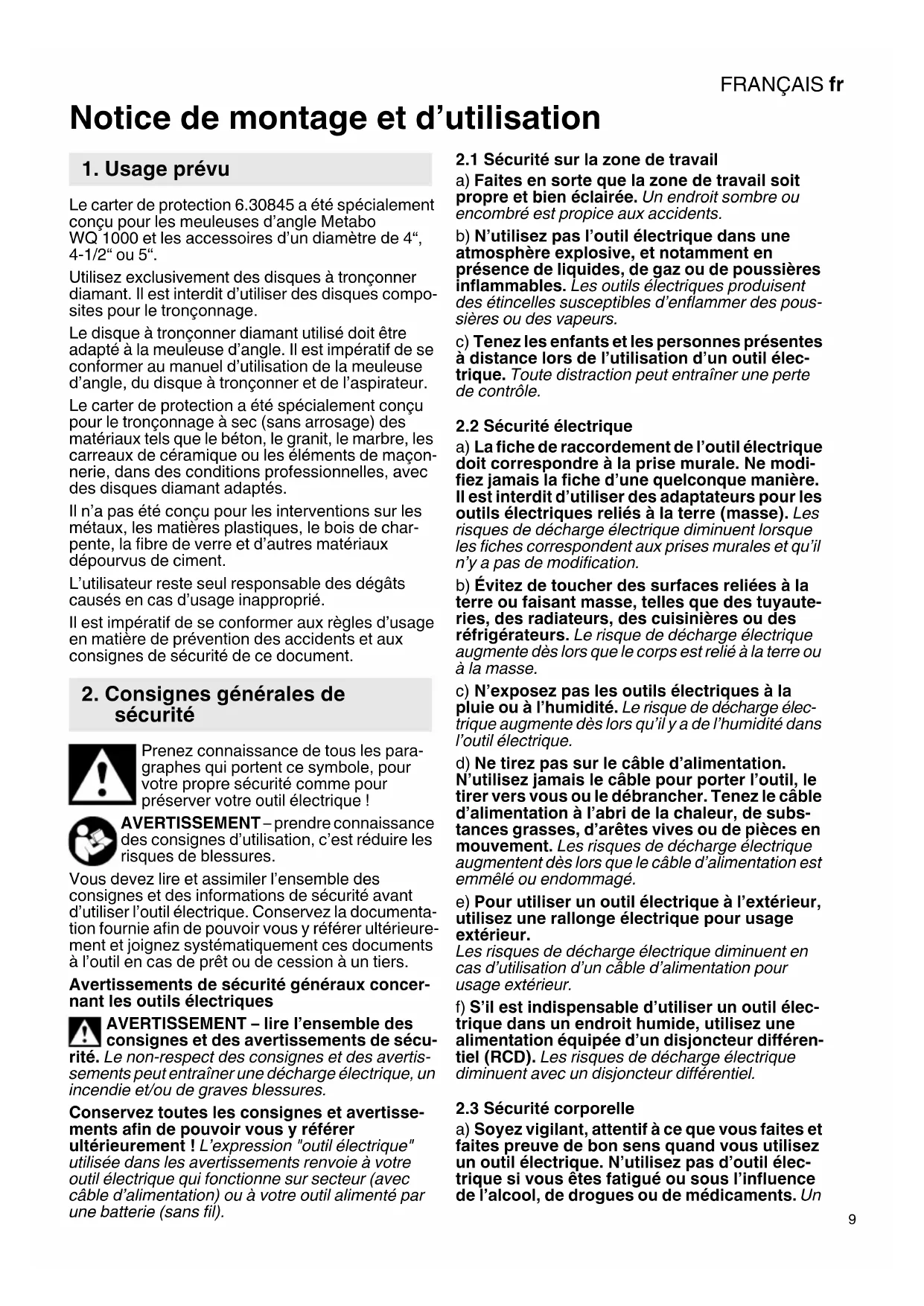 Notice de montage et d’utilisation Le carter de protection 6.30845 a été spécialement conçu pour les meuleuses d’angle Metabo WQ 1000 et les accessoires d’un diamètre de 4“, 4-1/2“ ou 5“. Utilisez exclusivement des disques à tronçonner diamant. Il est interdit d’utiliser des disques compo- sites pour le tronçonnage. Le disque à tronçonner diamant utilisé doit être adapté à la meuleuse d’angle. Il est impératif de se conformer au manuel d’utilisation de la meuleuse d’angle, du disque à tronçonner et de l’aspirateur. Le carter de protection a été spécialement conçu pour le tronçonnage à sec (sans arrosage) des matériaux tels que le béton, le granit, le marbre, les carreaux de céramique ou les éléments de maçon- nerie, dans des conditions professionnelles, avec des disques diamant adaptés. Il n’a pas été conçu pour les interventions sur les métaux, les matières plastiques, le bois de char- pente, la fibre de verre et d’autres matériaux dépourvus de ciment. L’utilisateur reste seul responsable des dégâts causés en cas d’usage inapproprié. Il est impératif de se conformer aux règles d’usage en matière de prévention des accidents et aux consignes de sécurité de ce document. Prenez connaissance de tous les para- graphes qui portent ce symbole, pour votre propre sécurité comme pour préserver votre outil électrique ! AVERTISSEMENT – prendre connaissance des consignes d’utilisation, c’est réduire les risques de blessures. Vous devez lire et assimiler l’ensemble des consignes et des informations de sécurité avant d’utiliser l’outil électrique. Conservez la documenta- tion fournie afin de pouvoir vous y référer ultérieure- ment et joignez systématiquement ces documents à l’outil en cas de prêt ou de cession à un tiers. Avertissements de sécurité généraux concer- nant les outils électriques AVERTISSEMENT – lire l’ensemble des consignes et des avertissements de sécu- rité. Le non-respect des consignes et des avertis- sements peut entraîner une décharge électrique, un incendie et/ou de graves blessures. Conservez toutes les consignes et avertisse- ments afin de pouvoir vous y référer ultérieurement ! L’expression "outil électrique" utilisée dans les avertissements renvoie à votre outil électrique qui fonctionne sur secteur (avec câble d’alimentation) ou à votre outil alimenté par une batterie (sans fil).