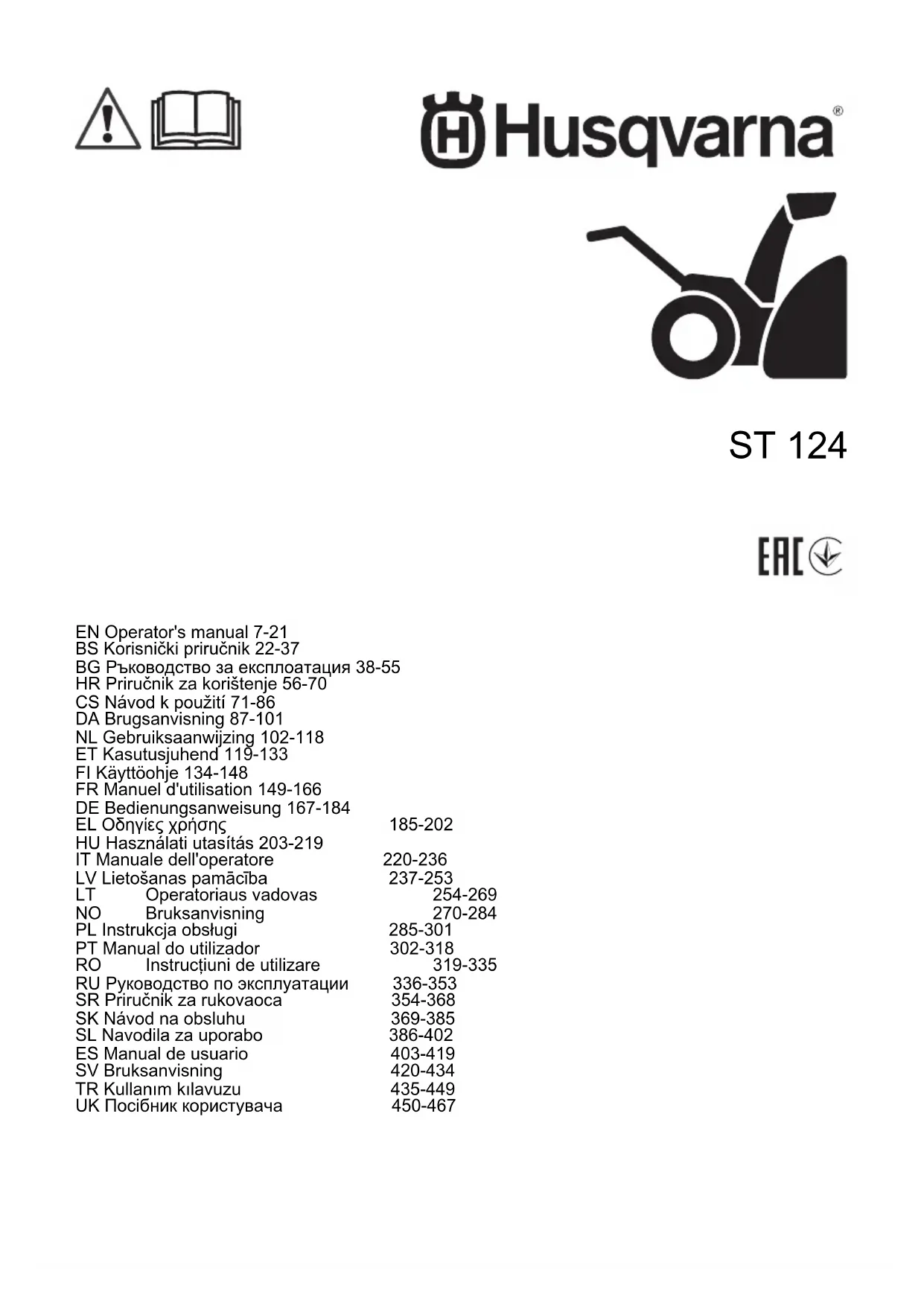 Description du produit Le produit est une souffleuse utilisée pour retirer la neige du sol. Utilisation prévue Ce produit peut être utilisé pour retirer la neige des champs, des routes, des allées et des trottoirs. Ne l'utilisez pas sur des pentes de plus de 15°. N'utilisez pas ce produit dans des zones où il y a beaucoup de débris, de saletés et de pierres qui dépassent. Symbols on the product Remarque: If the decals on the product are damaged, contact the distributor to replace them. (Fig. 2) Warning. (Fig. 3) Read the operator's manual. (Fig. 4) (Fig. 5) Hot surface. (Fig. 6) Risk of fire. (Fig. 7) Choke. (Fig. 8) Pull starter rope handle. (Fig. 9) Do not breathe in the exhaust fumes from the engine. (Fig. 10) Do not put any part of the body into the chute deflector or the auger housing when the augers rotate. (Fig. 11) Stop the engine before you remove snow from the chute deflector. Use the clean-out tool to remove snow, do not do it by hand. (Fig. 12) (Fig. 11) Keep hands away from the chute deflector. (Fig. 13) Objects can be ejected from the product. (Fig. 14) Keep bystanders away from the product when operating. (Fig. 15) Remove key before maintenance. (Fig. 16) Push in the on/off key to the RUN position. (Fig. 17) Turn the fuel switch to the ON position. (Fig. 18) Push the primer. (Fig. 19) Risk of falling. 1272 - 005 - 16.06.2020 149(Fig. 20) Move slowly rearward. (Fig. 21) Use approved protective gloves. (Fig. 22) Use a protective helmet. Use approved hearing protection. Use approved eye protection. (Fig. 23) Noise emissions to the environment according to European Directive 2000/14/EC and New South Wales legislation “Protection of the Environment Operations (Noise Control) Regulation 2017”. Noise emission data can be found on the machine label and in the Technical data chapter. (Fig. 24) European machinery directive for safety. Remarque: Other symbols/decals on the product refer to certification requirements for some markets. Émissions Euro V