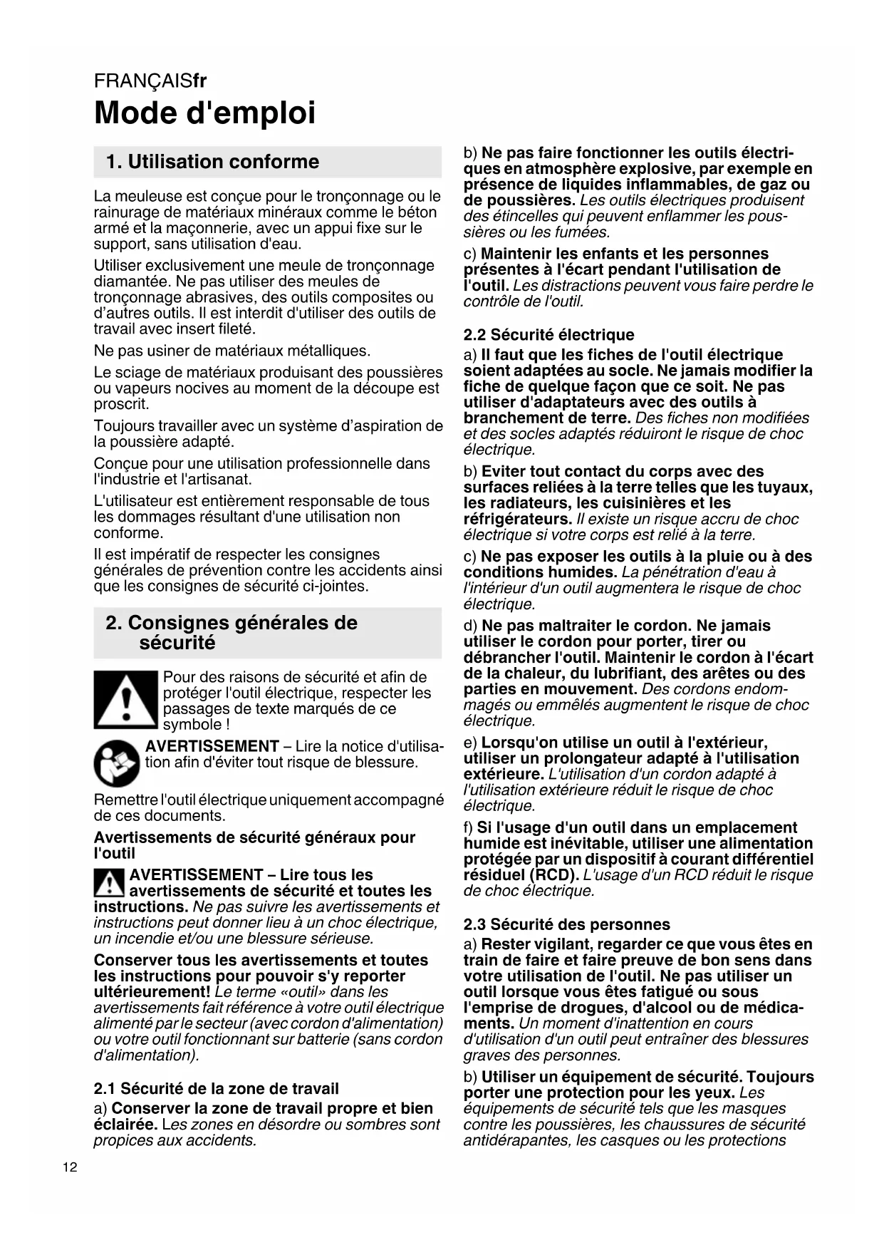 Mode d'emploi La meuleuse est conçue pour le tronçonnage ou le rainurage de matériaux minéraux comme le béton armé et la maçonnerie, avec un appui fixe sur le support, sans utilisation d'eau. Utiliser exclusivement une meule de tronçonnage diamantée. Ne pas utiliser des meules de tronçonnage abrasives, des outils composites ou d’autres outils. Il est interdit d'utiliser des outils de travail avec insert fileté. Ne pas usiner de matériaux métalliques. Le sciage de matériaux produisant des poussières ou vapeurs nocives au moment de la découpe est proscrit. Toujours travailler avec un système d’aspiration de la poussière adapté. Conçue pour une utilisation professionnelle dans l'industrie et l'artisanat. L'utilisateur est entièrement responsable de tous les dommages résultant d'une utilisation non conforme. Il est impératif de respecter les consignes générales de prévention contre les accidents ainsi que les consignes de sécurité ci-jointes. Pour des raisons de sécurité et afin de protéger l'outil électrique, respecter les passages de texte marqués de ce symbole ! AVERTISSEMENT – Lire la notice d'utilisa- tion afin d'éviter tout risque de blessure. Remettre l'outil électrique uniquement accompagné de ces documents. Avertissements de sécurité généraux pour l'outil AVERTISSEMENT – Lire tous les avertissements de sécurité et toutes les instructions. Ne pas suivre les avertissements et instructions peut donner lieu à un choc électrique, un incendie et/ou une blessure sérieuse. Conserver tous les avertissements et toutes les instructions pour pouvoir s'y reporter ultérieurement! Le terme «outil» dans les avertissements fait référence à votre outil électrique alimenté par le secteur (avec cordon d'alimentation) ou votre outil fonctionnant sur batterie (sans cordon d'alimentation).