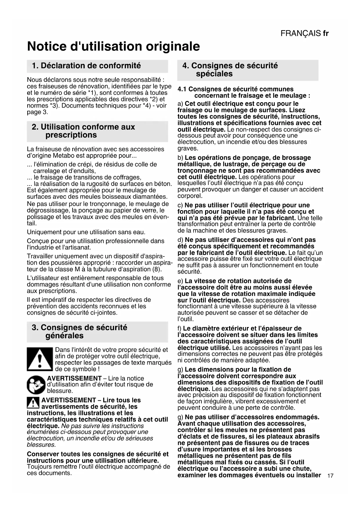 Notice d'utilisation originale Nous déclarons sous notre seule responsabilité : ces fraiseuses de rénovation, identifiées par le type et le numéro de série *1), sont conformes à toutes les prescriptions applicables des directives *2) et normes *3). Documents techniques pour *4) - voir page 3. La fraiseuse de rénovation avec ses accessoires d’origine Metabo est appropriée pour... ... l'élimination de crépi, de résidus de colle de carrelage et d'enduits, ... le fraisage de transitions de coffrages, ... la réalisation de la rugosité de surfaces en béton. Est également appropriée pour le meulage de surfaces avec des meules boisseaux diamantées. Ne pas utiliser pour le tronçonnage, le meulage de dégrossissage, la ponçage au papier de verre, le polissage et les travaux avec des meules en éven- tail. Uniquement pour une utilisation sans eau. Conçue pour une utilisation professionnelle dans l'industrie et l'artisanat. Travailler uniquement avec un dispositif d'aspira- tion des poussières approprié : raccorder un aspira- teur de la classe M à la tubulure d'aspiration (8). L'utilisateur est entièrement responsable de tous dommages résultant d'une utilisation non conforme aux prescriptions. Il est impératif de respecter les directives de prévention des accidents reconnues et les consignes de sécurité ci-jointes. Dans l'intérêt de votre propre sécurité et afin de protéger votre outil électrique, respecter les passages de texte marqués de ce symbole ! AVERTISSEMENT – Lire la notice d’utilisation afin d’éviter tout risque de blessure. AVERTISSEMENT – Lire tous les avertissements de sécurité, les instructions, les illustrations et les caractéristiques techniques relatifs à cet outil électrique. Ne pas suivre les instructions énumérées ci-dessous peut provoquer une électrocution, un incendie et/ou de sérieuses blessures. Conserver toutes les consignes de sécurité et instructions pour une utilisation ultérieure. Toujours remettre l’outil électrique accompagné de ces documents.
