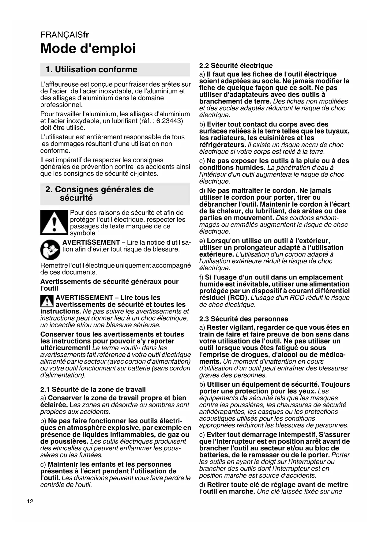 Mode d'emploi L'affleureuse est conçue pour fraiser des arêtes sur de l'acier, de l'acier inoxydable, de l'aluminium et des alliages d'aluminium dans le domaine professionnel. Pour travailler l'aluminium, les alliages d'aluminium et l'acier inoxydable, un lubrifiant (réf. : 6.23443) doit être utilisé. L'utilisateur est entièrement responsable de tous les dommages résultant d'une utilisation non conforme. Il est impératif de respecter les consignes générales de prévention contre les accidents ainsi que les consignes de sécurité ci-jointes. Pour des raisons de sécurité et afin de protéger l'outil électrique, respecter les passages de texte marqués de ce symbole ! AVERTISSEMENT – Lire la notice d'utilisa- tion afin d'éviter tout risque de blessure. Remettre l'outil électrique uniquement accompagné de ces documents. Avertissements de sécurité généraux pour l'outil AVERTISSEMENT – Lire tous les avertissements de sécurité et toutes les instructions. Ne pas suivre les avertissements et instructions peut donner lieu à un choc électrique, un incendie et/ou une blessure sérieuse. Conserver tous les avertissements et toutes les instructions pour pouvoir s'y reporter ultérieurement! Le terme «outil» dans les avertissements fait référence à votre outil électrique alimenté par le secteur (avec cordon d'alimentation) ou votre outil fonctionnant sur batterie (sans cordon d'alimentation).