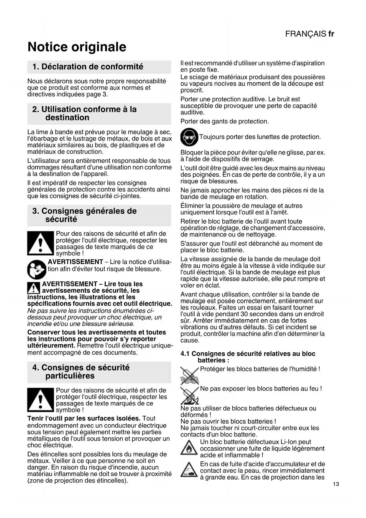 Notice originale Nous déclarons sous notre propre responsabilité que ce produit est conforme aux normes et directives indiquées page 3. La lime à bande est prévue pour le meulage à sec, l'ébarbage et le lustrage de métaux, de bois et aux matériaux similaires au bois, de plastiques et de matériaux de construction. L'utilisateur sera entièrement responsable de tous dommages résultant d'une utilisation non conforme à la destination de l'appareil. Il est impératif de respecter les consignes générales de protection contre les accidents ainsi que les consignes de sécurité ci-jointes. Pour des raisons de sécurité et afin de protéger l'outil électrique, respecter les passages de texte marqués de ce symbole ! AVERTISSEMENT – Lire la notice d'utilisa- tion afin d'éviter tout risque de blessure. AVERTISSEMENT – Lire tous les avertissements de sécurité, les instructions, les illustrations et les spécifications fournis avec cet outil électrique. Ne pas suivre les instructions énumérées ci- dessous peut provoquer un choc électrique, un incendie et/ou une blessure sérieuse. Conserver tous les avertissements et toutes les instructions pour pouvoir s'y reporter ultérieurement. Remettre l'outil électrique unique- ment accompagné de ces documents. Pour des raisons de sécurité et afin de protéger l'outil électrique, respecter les passages de texte marqués de ce symbole ! Tenir l'outil par les surfaces isolées. Tout endommagement avec un conducteur électrique sous tension peut également mettre les parties métalliques de l'outil sous tension et provoquer un choc électrique. Des étincelles sont possibles lors du meulage de métaux. Veiller à ce que personne ne soit en danger. En raison du risque d'incendie, aucun matériau inflammable ne doit se trouver à proximité (zone de projection des étincelles). Il est recommandé d'utiliser un système d'aspiration en poste fixe. Le sciage de matériaux produisant des poussières ou vapeurs nocives au moment de la découpe est proscrit. Porter une protection auditive. Le bruit est susceptible de provoquer une perte de capacité auditive. Porter des gants de protection. Toujours porter des lunettes de protection. Bloquer la pièce pour éviter qu'elle ne glisse, par ex. à l'aide de dispositifs de serrage. L'outil doit être guidé avec les deux mains au niveau des poignées. En cas de perte de contrôle, il y a un risque de blessures. Ne jamais approcher les mains des pièces ni de la bande de meulage en rotation. Éliminer la poussière de meulage et autres uniquement lorsque l'outil est à l'arrêt. Retirer le bloc batterie de l'outil avant toute opération de réglage, de changement d'accessoire, de maintenance ou de nettoyage. S'assurer que l'outil est débranché au moment de placer le bloc batterie. La vitesse assignée de la bande de meulage doit être au moins égale à la vitesse à vide indiquée sur l'outil électrique. Si la bande de meulage est plus rapide que la vitesse autorisée, elle peut rompre et voler en éclat. Avant chaque utilisation, contrôler si la bande de meulage est posée correctement, entièrement sur les rouleaux. Faites un essai en faisant tourner l'outil à vide pendant 30 secondes dans un endroit sûr. Arrêter immédiatement en cas de fortes vibrations ou d'autres défauts. Si cet incident se produit, contrôler la machine afin d'en déterminer la cause.