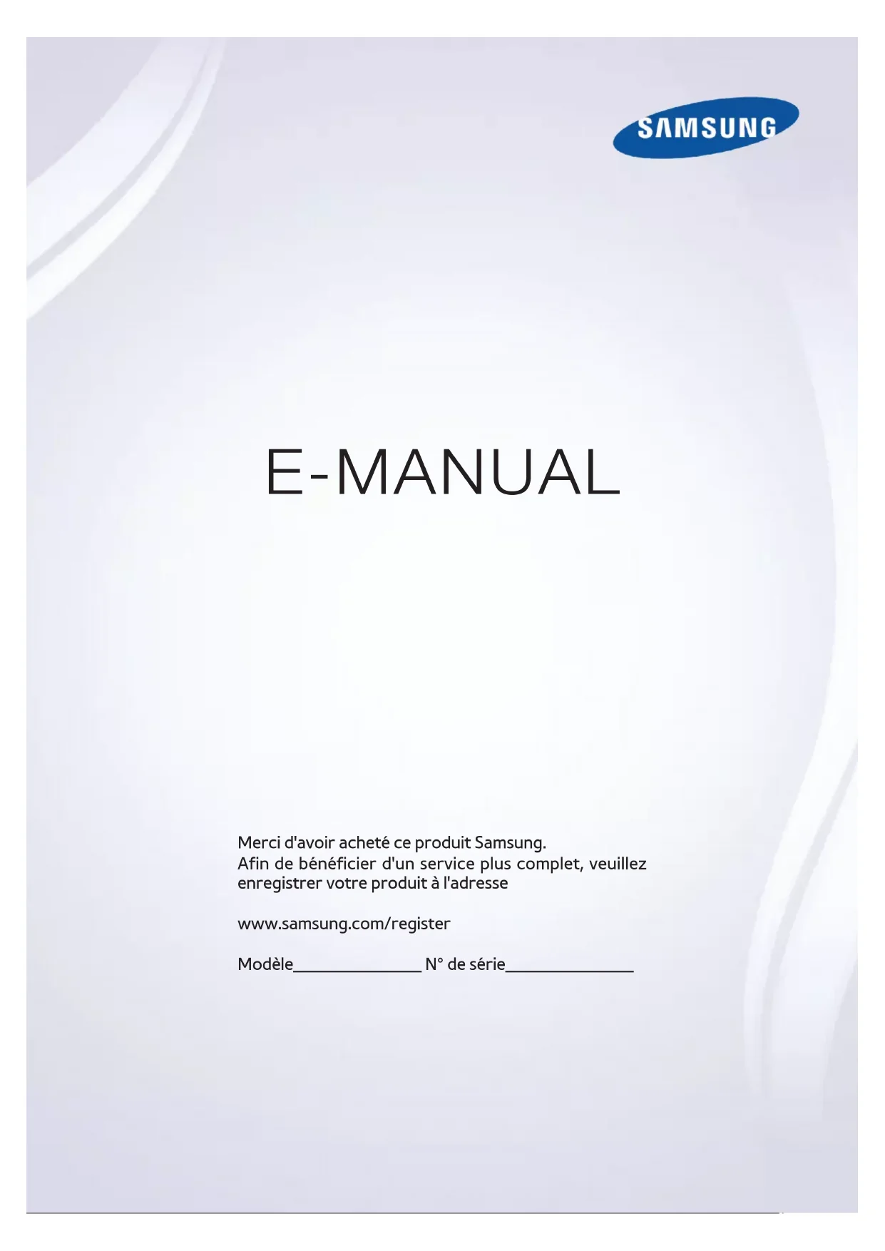 E-MANUAL Merci d'avoir acheté ce produit Samsung. Afin de bénéficier d'un service plus complet, veuillez enregistrer votre produit à l'adresse www.samsung.com/register Modèle______________ N° de série______________Contenu Guide de démarrage Utilisation de la Smart TV Utilisation de la Commande vocale Utilisation de la Commande par mouv. Utilisation du Samsung Smart Control Utilisation du Mode Foot Utilisation du mode Multi-Link Screen Modification de chaînes Connexion de l'antenne et de périphériques externes Connexion - Avec antenne Connexion de périphériques vidéo 15 Connexion - HDMI 16 Connexion - Composant 17 Connexion - Entrée externe 18 Connexion - SCART Utilisation des haut-parleurs externes pour écouter la télévision 19 Connexion - HDMI (ARC) 20 Connexion - Audio numérique (Optique) 21 Connexion - Casque 22 Connexion - Sortie audio Connexion à un ordinateur 24 Connexion - Port HDMI 25 Connexion - Port HDMI (DVI) 26 Connexion - Samsung Link 26 Connexion - Réseau domestique (DLNA) Connexion à l'aide d'un périphérique mobile 28 Ecran du périphérique mobile sur le téléviseur (Réplication de l'écran) 29 Connexion de périphériques mobiles sans routeur sans fil (Wi-Fi Direct) 29 Connexion - Samsung Link 30 Connexion - Réseau domestique (DLNA) 30 Connexion via Smart View 2.0 31 Nom du téléviseur sur le réseau Sélection du signal d'entrée Utilisation d'une télécommande et de périphériques Insertion des piles dans le Samsung Smart Control 32 Lorsque cette icône d'alarme s'affiche à l'écran... Pairage du Samsung Smart Control 33 Reconnexion du Samsung Smart Control Utilisation du Samsung Smart Control 34 Fonctions des boutons 37 Utilisation du téléviseur en déplaçant le Samsung Smart Control 38 Utilisation du téléviseur avec le Touchpad 40 Affichage de la télécommande à l'écran (télécommande virtuelle) Commande des périphériques externes à l'aide de la télécommande du téléviseur (Config. télécommande universelle) 42 Configuration de la télécommande universelle 43 Commande des périphériques externes à l'aide de la télécommande du téléviseur Commande du téléviseur à l'aide d'un clavier 45 Connexion d'un clavier 46 Utilisation du clavier Commande du téléviseur à l'aide d'une souris 47 Connexion d'une souris 48 Utilisation de la souris Saisie de texte à l'aide d'un clavier QWERTY 49 Utilisation des autres fonctions IIConnexion Internet Mise en place d'une connexion câblée à Internet 50 Connexion d'un câble LAN 51 Connexion automatique à un réseau Internet câblé 51 Connexion manuelle à un réseau Internet câblé Mise en place d'une connexion sans fil à Internet 53 Connexion automatique à un réseau Internet sans fil 54 Connexion manuelle à un réseau Internet sans fil 55 Connexion à un réseau Internet sans fil avec WPS Résolution des problèmes de connectivité Internet 56 Résolution des problèmes de connectivité Internet câblé 57 Résolution des problèmes de connectivité Internet sans fil Réseau mobile 58 Nom de modèle et services de télécommunications pris en charge Vérification de l'état de la connexion Internet Fonctions Smart Plusieurs fonctions sur un seul écran 60 Lancement du mode Multi-Link Screen 60 Utilisation du mode Multi-Link Screen 60 Sélection d'une fonctionnalité 60 Changement de chaîne/Réglage du volume Smart Hub 61 Test des connexions Smart Hub 62 Ouverture de Barre d'accès rapide 63 Accès à l'écran Panneau 63 Utilisation du Didacticiel Smart Hub 63 Réinitialisation de Smart Hub Utilisation de Smart Hub avec Compte Samsung 64 Création d'un Compte Samsung 66 Connexion au Compte Samsung 67 Liaison de mes comptes Samsung et d'application 68 Modification et ajout d'informations à un Compte Samsung 68 Suppression de tous les comptes Samsung du téléviseur Utilisation du panneau Jeux 69 Utilisation des fonctions du menu contextuel 69 Installation et exécution d'un jeu 71 Gestion des jeux téléchargés ou achetés Utilisation du panneau SAMSUNG APPS 73 Utilisation des fonctions du menu contextuel 74 Installation d'une application 75 Applications par défaut 75 Utilisation de Web Browser 78 Réorganisation des applications dans l'écran SAMSUNG APPS 79 Suppression d'une application du téléviseur 79 Notation/évaluation d'une application 80 Mise à jour d'une application 80 Fonctionnalités SAMSUNG APPS Utilisation du panneau Mes Programmes 84 Utilisation des fonctions du menu contextuel 84 Affichage d'informations détaillées sur le programme 85 Configuration des Param. Sur la TV Utilisation du panneau MON VIDEO CLUB 87 Utilisation des fonctions du menu contextuel 88 Visionnage d'un film/programme télévisé 88 Restriction du visionnage du contenu acheté 89 Notation et partage d'un contenu acheté Lecture de vidéos, de photos et de musique (MULTIMEDIA) 91 Lecture de contenu multimédia à partir d'un périphérique USB 92 Lecture de contenu multimédia enregistré sur un ordinateur/ périphérique mobile 94 Lecture de contenu multimédia à partir d'un Service cloud 95 Boutons et fonctions disponibles pendant le visionnage de photos 96 Boutons et fonctions disponibles pendant le visionnage de vidéos 98 Boutons et fonctions disponibles pendant la lecture de musique 99 Fonctions de l'écran Liste de contenu multimédia Commande du téléviseur par la voix 100 Activation du Commande vocale 102 Utilisation interactive de la fonction Interaction vocale Commande du téléviseur à l'aide de gestes 103 Test de la luminosité ambiante à l'aide de la caméra du téléviseur 104 Activation de la fonction Commande par mouv. 107 Présentation de l'écran Commande par mouv. Connexion à l'aide de la Reconnaissance faciale 110 Enregistrement de votre visage sur votre Compte Samsung 111 Définition de la méthode de connexion sur Reconnaissance II IIIfaciale 111 Connexion au Compte Samsung par reconnaissance faciale Fonctions Regarder la télévision et Enregistrer In