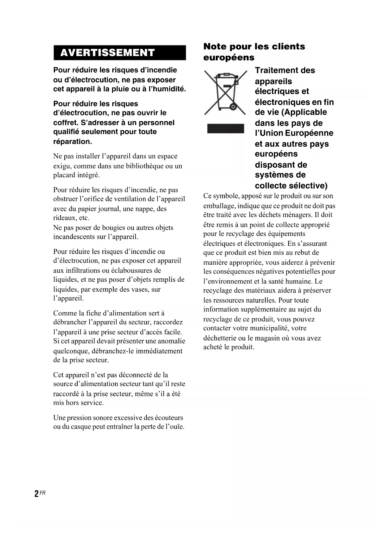 Pour réduire les risques d’incendie ou d’électrocution, ne pas exposer cet appareil à la pluie ou à l’humidité. Pour réduire les risques d’électrocution, ne pas ouvrir le coffret. S’adresser à un personnel qualifié seulement pour toute réparation. Ne pas installer l’appareil dans un espace exigu, comme dans une bibliothèque ou un placard intégré. Pour réduire les risques d’incendie, ne pas obstruer l’orifice de ventilation de l’appareil avec du papier journal, une nappe, des rideaux, etc. Ne pas poser de bougies ou autres objets incandescents sur l’appareil. Pour réduire les risques d’incendie ou d’électrocution, ne pas exposer cet appareil aux infiltrations ou éclaboussures de liquides, et ne pas poser d’objets remplis de liquides, par exemple des vases, sur l’appareil. Comme la fiche d’alimentation sert à débrancher l’appareil du secteur, raccordez l’appareil à une prise secteur d’accès facile. Si cet appareil devait présenter une anomalie quelconque, débranchez-le immédiatement de la prise secteur. Cet appareil n’est pas déconnecté de la source d’alimentation secteur tant qu’il reste raccordé à la prise secteur, même s’il a été mis hors service. Une pression sonore excessive des écouteurs ou du casque peut entraîner la perte de l’ouïe. Note pour les clients européens Traitement des appareils électriques et électroniques en fin de vie (Applicable dans les pays de l’Union Européenne et aux autres pays européens disposant de systèmes de collecte sélective) Ce symbole, apposé sur le produit ou sur son emballage, indique que ce produit ne doit pas être traité avec les déchets ménagers. Il doit être remis à un point de collecte approprié pour le recyclage des équipements électriques et électroniques. En s’assurant que ce produit est bien mis au rebut de manière appropriée, vous aiderez à prévenir les conséquences négatives potentielles pour l’environnement et la santé humaine. Le recyclage des matériaux aidera à préserver les ressources naturelles. Pour toute information supplémentaire au sujet du recyclage de ce produit, vous pouvez contacter votre municipalité, votre déchetterie ou le magasin où vous avez acheté le produit. AVERTISSEMENT3
