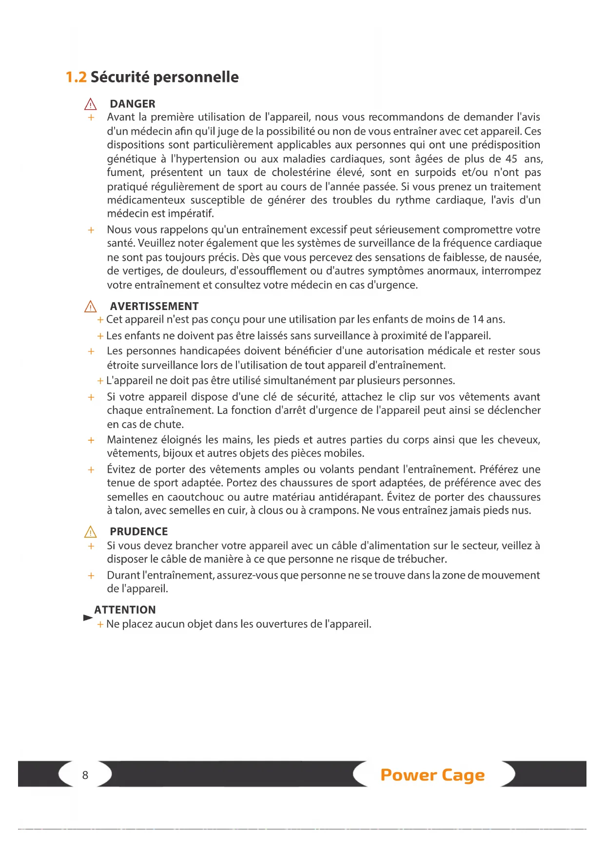 ⚠ DANGER + Avant la première utilisation de l'appareil, nous vous recommandons de demander l'avis d'un médecin an qu'il juge de la possibilité ou non de vous entraîner avec cet appareil. Ces dispositions sont particulièrement applicables aux personnes qui ont une prédisposition génétique à l'hypertension ou aux maladies cardiaques, sont âgées de plus de 45 ans, fument, présentent un taux de cholestérine élevé, sont en surpoids et/ou n'ont pas pratiqué régulièrement de sport au cours de l'année passée. Si vous prenez un traitement médicamenteux susceptible de générer des troubles du rythme cardiaque, l'avis d'un médecin est impératif. + Nous vous rappelons qu'un entraînement excessif peut sérieusement compromettre votre santé. Veuillez noter également que les systèmes de surveillance de la fréquence cardiaque ne sont pas toujours précis. Dès que vous percevez des sensations de faiblesse, de nausée, de vertiges, de douleurs, d'essouement ou d'autres symptômes anormaux, interrompez votre entraînement et consultez votre médecin en cas d'urgence. ⚠ AVERTISSEMENT + Cet appareil n'est pas conçu pour une utilisation par les enfants de moins de 14ans. + Les enfants ne doivent pas être laissés sans surveillance à proximité de l'appareil. + Les personnes handicapées doivent bénécier d'une autorisation médicale et rester sous étroite surveillance lors de l'utilisation de tout appareil d'entraînement. + L'appareil ne doit pas être utilisé simultanément par plusieurs personnes. + Si votre appareil dispose d'une clé de sécurité, attachez le clip sur vos vêtements avant chaque entraînement. La fonction d'arrêt d'urgence de l'appareil peut ainsi se déclencher en cas de chute. + Maintenez éloignés les mains, les pieds et autres parties du corps ainsi que les cheveux, vêtements, bijoux et autres objets des pièces mobiles. + Évitez de porter des vêtements amples ou volants pendant l'entraînement. Préférez une tenue de sport adaptée. Portez des chaussures de sport adaptées, de préférence avec des semelles en caoutchouc ou autre matériau antidérapant. Évitez de porter des chaussures à talon, avec semelles en cuir, à clous ou à crampons. Ne vous entraînez jamais pieds nus. ⚠ PRUDENCE + Si vous devez brancher votre appareil avec un câble d'alimentation sur le secteur, veillez à disposer le câble de manière à ce que personne ne risque de trébucher. + Durant l'entraînement, assurez-vous que personne ne se trouve dans la zone de mouvement de l'appareil. ࣑ ATTENTION + Ne placez aucun objet dans les ouvertures de l'appareil.9