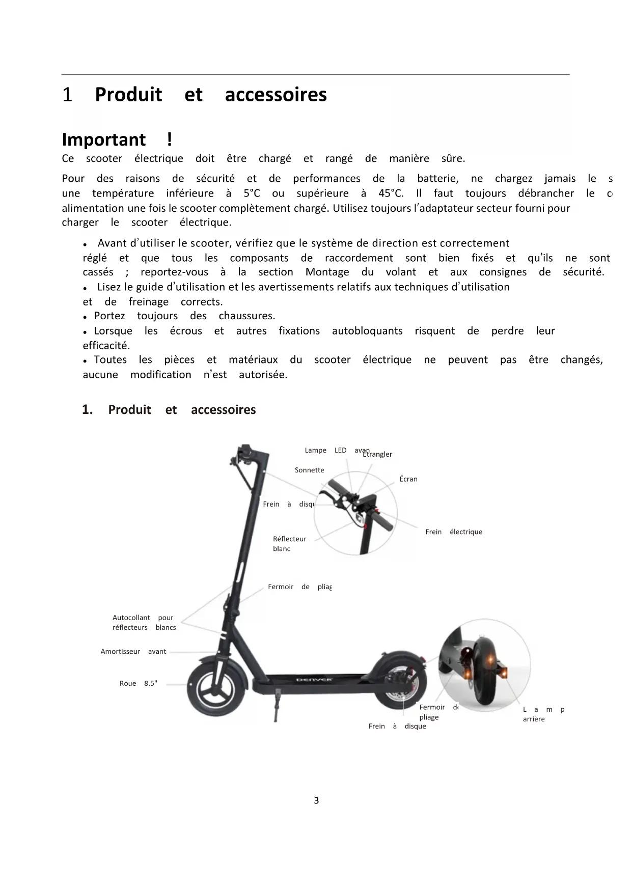 - Guide d’utilisation SEL-10500 facebook.com/denverelectronics Avant d'utiliser ce produit, lisez toutes les instructions pour un assemblage et des opérations sans risque. Le guide d’ utilisation comprend des informations sur les fonctions et l’utilisation du scooter électrique. Avant d’utiliser ce scooter électrique, vous devez vous familiariser avec son utilisation afin de le garder dans le meilleur état possible.Cet appareil peut être utilisé par des enfants de 14 ans et plus et des personnes ayant des capacités physiques, sensorielles ou mentales réduites, ou ne disposant pas de l’expérience et de connaissances si elles sont supervisées ou ont été formées sur son utilisation d'une manière sure, et sont conscientes des risques encourus.Les enfants en bas âge ne doivent pas jouer avec l’appareil. Le nettoyage et la maintenance de l’utilisateur ne doivent pas être effectués par les enfants sans supervision. Version 1.02 Table des matières 1 Produit et accessoires p. 3