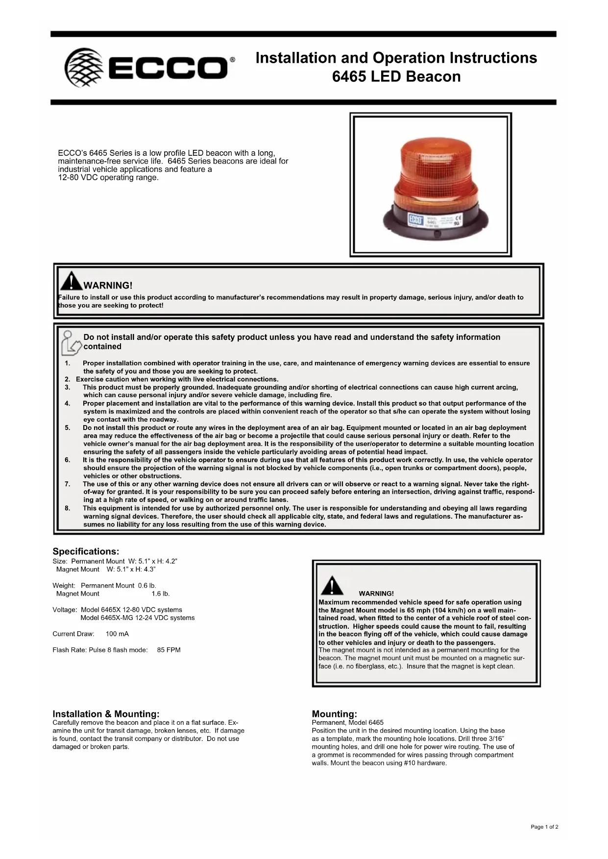 AVERTISSEMENT! Le non-respect des recommandations d’installation ou d’utilisation du fabricant peut entraîner des matériels, de graves blessures et/ou votre mort et celle de ceux que vous cherchez à protéger! Caractéristiques techniques : Dimensions : Montage dénitif l : 5,1 po. x H : 4.2" Montage magnétique l : 5,1 po. x H : 4.3" Poids : Montage dénitif 0,6 lb. Montage magnétique 1,6 lb.Tension : Systèmes du modèle 6465X, 12 à 80 VCC Systèmes du modèle 6465X-MG, 12 à 24 VCCAppel de courant : 100 mA Fréquence d’éclat : Mode de Pulse 8 : 85 FPM AVERTISSEMENT! La vitesse maximale recommandée du véhicule pour un fonctionnement sûr avec le modèle de montage magnétique est de 65 mph (104 km/h) sur une route bien entretenue, lorsque l’unité est placée au centre d’un toit de véhicule en acier. Si vous roulez à des vitesses élevées, la balise pourrait se détacher du véhicule et endommager d’autres véhicules, et blesser voire tuer les passagers.Le montage magnétique n’est pas destiné à être un montage permanent de la balise. L’unité à montage magnétique doit être montée sur une surface magnétique (pas de bres de verre, etc.). Assurez-vous de garder l’aimant propre.