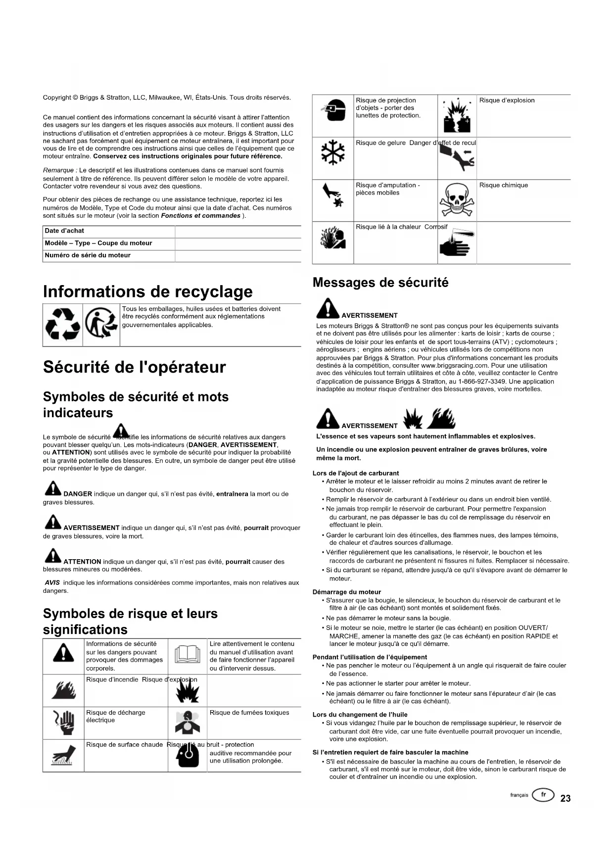 almacenamiento de los equipos, o instalación incorrecta del motor. El servicio de garantía solo está disponible a través de los distribuidores de servicio autorizados de Briggs&Stratton. Ubique a su distribuidor de servicio autorizado más cercano en nuestro mapa localizador de distribuidores en el sitio BRIGGSandSTRATTON.COM o llamando al 1-800-233-3723 (en EE.UU.). 80004537 (Rev.F)23 Copyright © Briggs & Stratton, LLC, Milwaukee, WI, États-Unis. Tous droits réservés. Ce manuel contient des informations concernant la sécurité visant à attirer l’attention des usagers sur les dangers et les risques associés aux moteurs. Il contient aussi des instructions d’utilisation et d’entretien appropriées à ce moteur. Briggs & Stratton, LLC ne sachant pas forcément quel équipement ce moteur entraînera, il est important pour vous de lire et de comprendre ces instructions ainsi que celles de l’équipement que ce moteur entraîne. Conservez ces instructions originales pour future référence. Remarque :Le descriptif et les illustrations contenues dans ce manuel sont fournis seulement à titre de référence. Ils peuvent différer selon le modèle de votre appareil. Contacter votre revendeur si vous avez des questions. Pour obtenir des pièces de rechange ou une assistance technique, reportez ici les numéros de Modèle, Type et Code du moteur ainsi que la date d’achat. Ces numéros sont situés sur le moteur (voir la section Fonctions et commandes ). Date d’achat Modèle– Type– Coupe du moteur Numéro de série du moteur Informations de recyclage Tous les emballages, huiles usées et batteries doivent être recyclés conformément aux réglementations gouvernementales applicables. Sécurité de l'opérateur Symboles de sécurité et mots indicateurs Le symbole de sécurité identifie les informations de sécurité relatives aux dangers pouvant blesser quelqu’un. Les mots-indicateurs (DANGER,AVERTISSEMENT, ouATTENTION) sont utilisés avec le symbole de sécurité pour indiquer la probabilité et la gravité potentielle des blessures. En outre, un symbole de danger peut être utilisé pour représenter le type de danger. DANGERindique un danger qui, s’il n’est pas évité,entraînerala mort ou de graves blessures. AVERTISSEMENTindique un danger qui, s’il n’est pas évité,pourraitprovoquer de graves blessures, voire la mort. ATTENTIONindique un danger qui, s’il n’est pas évité,pourraitcauser des blessures mineures ou modérées. AVISindique les informations considérées comme importantes, mais non relatives aux dangers. Symboles de risque et leurs significations Informations de sécurité sur les dangers pouvant provoquer des dommages corporels. Lire attentivement le contenu du manuel d’utilisation avant de faire fonctionner l’appareil ou d’intervenir dessus. Risque d’incendie Risque d’explosion Risque de décharge électrique Risque de fumées toxiques Risque de surface chaude Risque lié au bruit - protection auditive recommandée pour une utilisation prolongée. Risque de projection d’objets - porter des lunettes de protection. Risque d’explosion Risque de gelure Danger d’effet de recul Risque d’amputation - pièces mobiles Risque chimique Risque lié à la chaleur Corrosif Messages de sécurité AVERTISSEMENT Les moteurs Briggs & Stratton® ne sont pas conçus pour les équipements suivants et ne doivent pas être utilisés pour les alimenter: karts de loisir; karts de course; véhicules de loisir pour les enfants et de sport tous-terrains (ATV); cyclomoteurs; aéroglisseurs; engins aériens; ou véhicules utilisés lors de compétitions non approuvées par Briggs & Stratton. Pour plus d'informations concernant les produits destinés à la compétition, consulter www.briggsracing.com. Pour une utilisation avec des véhicules tout terrain utilitaires et côte à côte, veuillez contacter le Centre d’application de puissance Briggs & Stratton, au 1-866-927-3349. Une application inadaptée au moteur risque d'entraîner des blessures graves, voire mortelles. AVERTISSEMENT L'essence et ses vapeurs sont hautement inflammables et explosives. Un incendie ou une explosion peuvent entraîner de graves brûlures, voire même la mort. Lors de l'ajout de carburant