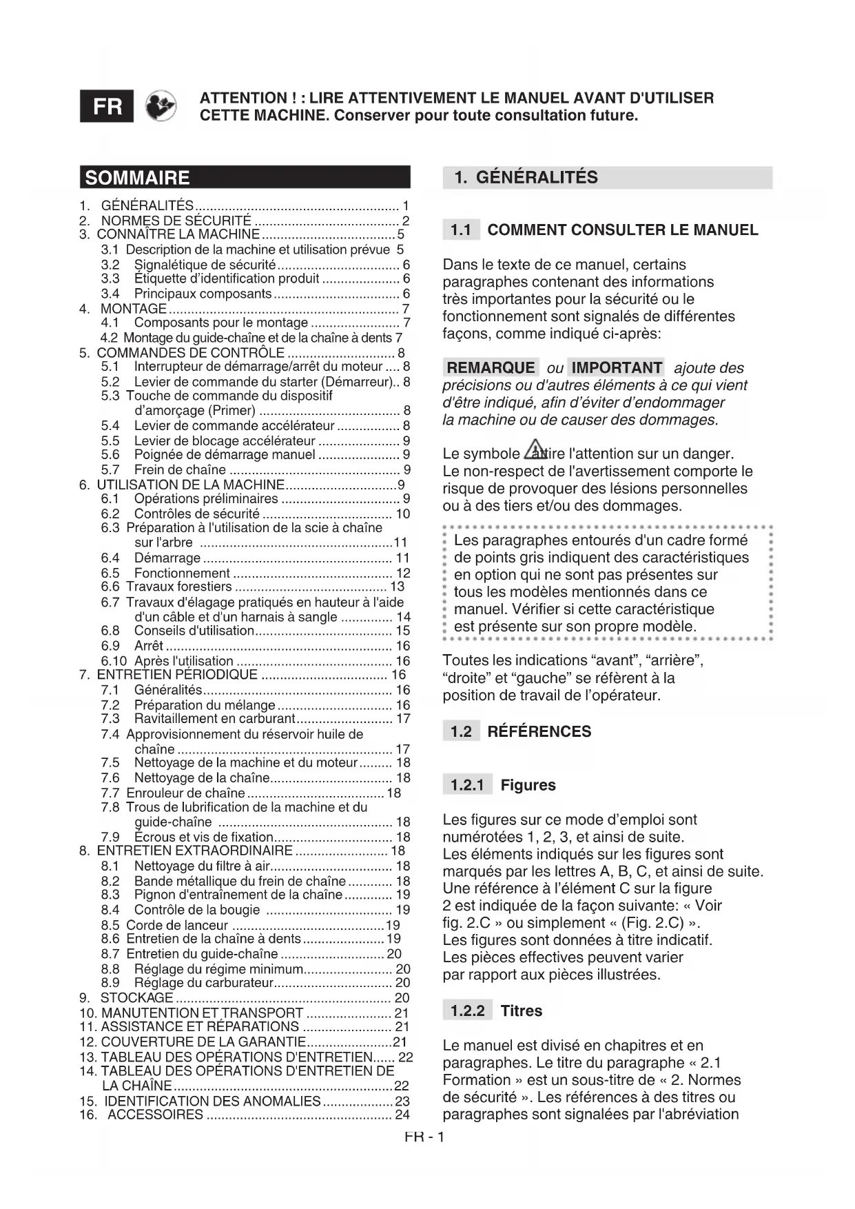 Le manuel est divisé en chapitres et en paragraphes. Le titre du paragraphe « 2.1 Formation » est un sous-titre de « 2. Normes de sécurité ». Les références à des titres ou paragraphes sont signalées par l'abréviation ATTENTION ! : LIRE ATTENTIVEMENT LE MANUEL AVANT D'UTILISER CETTE MACHINE. Conserver pour toute consultation future.