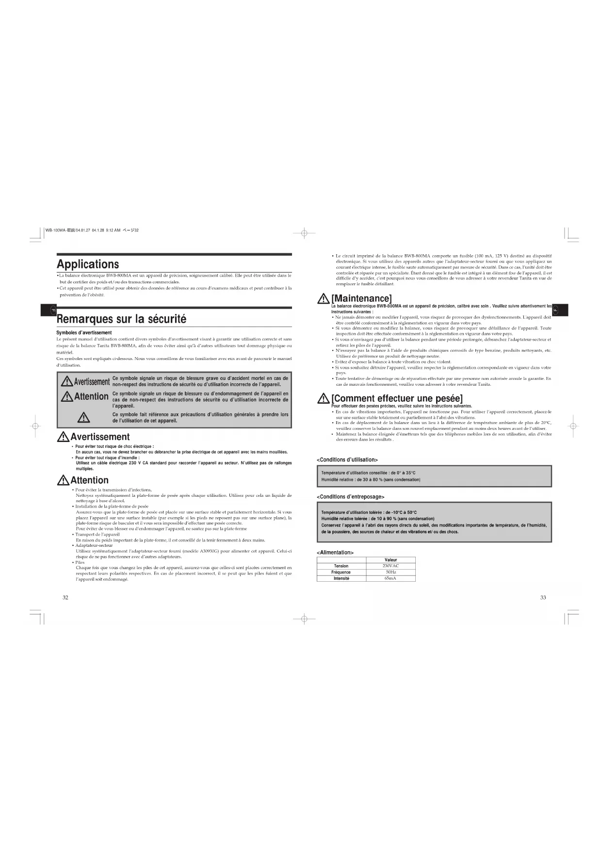 MODE D'EMPLOI WB110MA TANITA