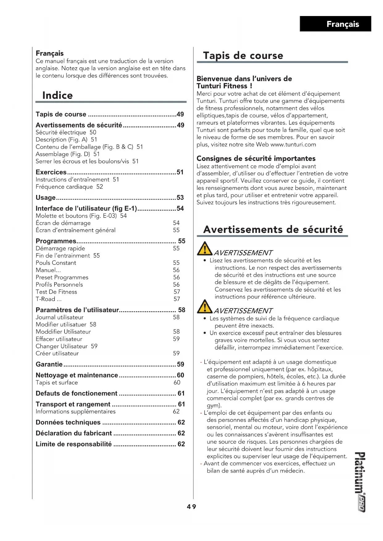 - Les systèmes de suivi de la fréquence cardiaque peuvent être inexacts. • Un exercice excessif peut entraîner des blessures graves voire mortelles. Si vous vous sentez défaillir, interrompez immédiatement l’exercice. - L’équipement est adapté à un usage domestique et professionnel uniquement (par ex. hôpitaux, caserne de pompiers, hôtels, écoles, etc.). La durée d’utilisation maximum est limitée à 6 heures par jour. L’équipement n’est pas adapté à un usage commercial complet (par ex. grands centres de gym). - L’emploi de cet équipement par des enfants ou des personnes affectés d’un handicap physique, sensoriel, mental ou moteur, voire dont l’expérience ou les connaissances s’avèrent insuffisantes est une source de risques. Les personnes chargées de leur sécurité doivent leur fournir des instructions explicites ou superviser leur usage de l’équipement. - Avant de commencer vos exercices, effectuez un bilan de santé auprès d’un médecin. Français Ce manuel français est une traduction de la version anglaise. Notez que la version anglaise est en tête dans le contenu lorsque des différences sont trouvées. Indice Tapis de course ................................................49 Avertissements de sécurité ............................. 49 Sécurité électrique 50Description (Fig. A) 51Contenu de l’emballage (Fig. B & C) 51Assemblage (Fig. D) 51Serrer les écrous et les boulons/vis 51 Exercices ........................................................... 51 Instructions d’entraînement 51Fréquence cardiaque 52 Usage ................................................................. 53 Interface de l’utilisateur (g E-1) ..................... 54 Molette et boutons (Fig. E-03) 54Écran de démarrage 54Écran d’entraînement général 55 Programmes...................................................... 55 Démarrage rapide 55Fin de l’entrainment 55Pouls Constant 55Manuel ... 56Preset Programmes 56Prols Personnels 56Test De Fitness 57T-Road ... 57 Paramètres de l’utilisateur............................... 58 Journal utilisateur 58Modier utilisatuer 58Moddier Utilisateur 58Effacer utilisateur 59Changer Utilisateur 59Créer utilisateur 59 Garantie ............................................................. 59 Nettoyage et maintenance ............................... 60 Tapis et surface 60 Defauts de fonctionement ............................... 61 Transport et rangement ................................... 61 Informations supplémentaires 62 Données techniques ........................................ 62 Déclaration du fabricant .................................. 62 Limite de responsabilité .................................. 6250 Français - Si vous êtes pris de nausées ou de vertiges ou sentez d’autres symptômes normaux pendant l’entraînement, interrompez immédiatement la session et consultez votre médecin. - Afin d’éviter toutes douleurs et tensions musculaires, commencez vos séances par des échauffements et terminez-les par une récupération. N’oubliez pas de vous étirer après vos exercices. - L’équipement est uniquement adapté à un usage intérieur. L’équipement ne convient pas à un usage extérieur. - Utilisez l’équipement uniquement dans des environnements correctement ventilés. N’utilisez pas l’équipement dans des endroits exposés aux courants d’air afin de ne pas vous enrhumer. - Utilisez l’équipement uniquement à une température ambiante entre 10 °C et 35 °C. Rangez l’équipement uniquement à une température ambiante entre 5 °C et 45 °C. - N’utilisez et ne rangez pas l’équipement dans un environnement humide. L’humidité de l’air ne doit jamais dépasser 80 %. - Utilisez l’équipement uniquement pour son usage prévu. N’utilisez pas l’équipement pour d’autres usages que ceux décrits dans le manuel. - N’utilisez pas l’équipement si l’une de ses pièces est endommagée ou défectueuse. Si une pièce est endommagée ou défectueuse, contactez votre revendeur. - Maintenez vos mains, vos pieds et les autres parties de votre corps à l’écart des pièces mobiles. - Maintenez votre chevelure à l’écart des pièces mobiles. - Portez des vêtements et des chaussures adaptés. - Maintenez les vêtements, bijoux et autres objets à l’écart des pièces mobiles. - Assurez-vous qu’une seule personne utilise l’équipement à la fois. L’équipement e doit pas être utilisé par des personnes pesant plus de 165 kg (363 lbs). - N’ouvrez pas l’équipement sans consulter votre revendeur. Sécurité électrique (Uniquement pour les équipements à alimentation électrique) - Avant usage, assurez-vous toujours que la tension secteur est identique à celle de la plaque signalétique de l’équipement. - N’utilisez pas de rallonge. - Maintenez le câble secteur à l’écart de la chaleur, de l’huile et des bords coupants. - N’altérez et ne modifiez aucunement le câble secteur ou la fiche secteur. - N’utilisez pas l’équipement si le câble secteur ou la fiche secteur est endommagé ou défectueux. Si le câble secteur ou la fiche secteur est endommagé ou défectueux, contactez votre revendeur. - Déroulez toujours complètement le câble secteur. - Ne passez pas le câble secteur sous l’équipement. Ne passez pas le câble secteur sous un tapis. Ne placez aucun objet sur le câble secteur. - Assurez-vous que le câble secteur ne pend pas sur le bord d’une table. Assurez-vous que le câble secteur ne peut pas être happé par accident ou faire trébucher. - Ne laissez pas l’équipement sans surveillance si la fiche secteur est insérée dans la prise murale. - Ne tirez pas sur le câble secteur pour retirer la fiche secteur de la prise murale. - Retirez la fiche secteur de la prise murale lorsque l’équipement n’est pas utilisé, avant l’assemblage et le démontage et avant le nettoyage et la maintenance. AVERTISSEMENT