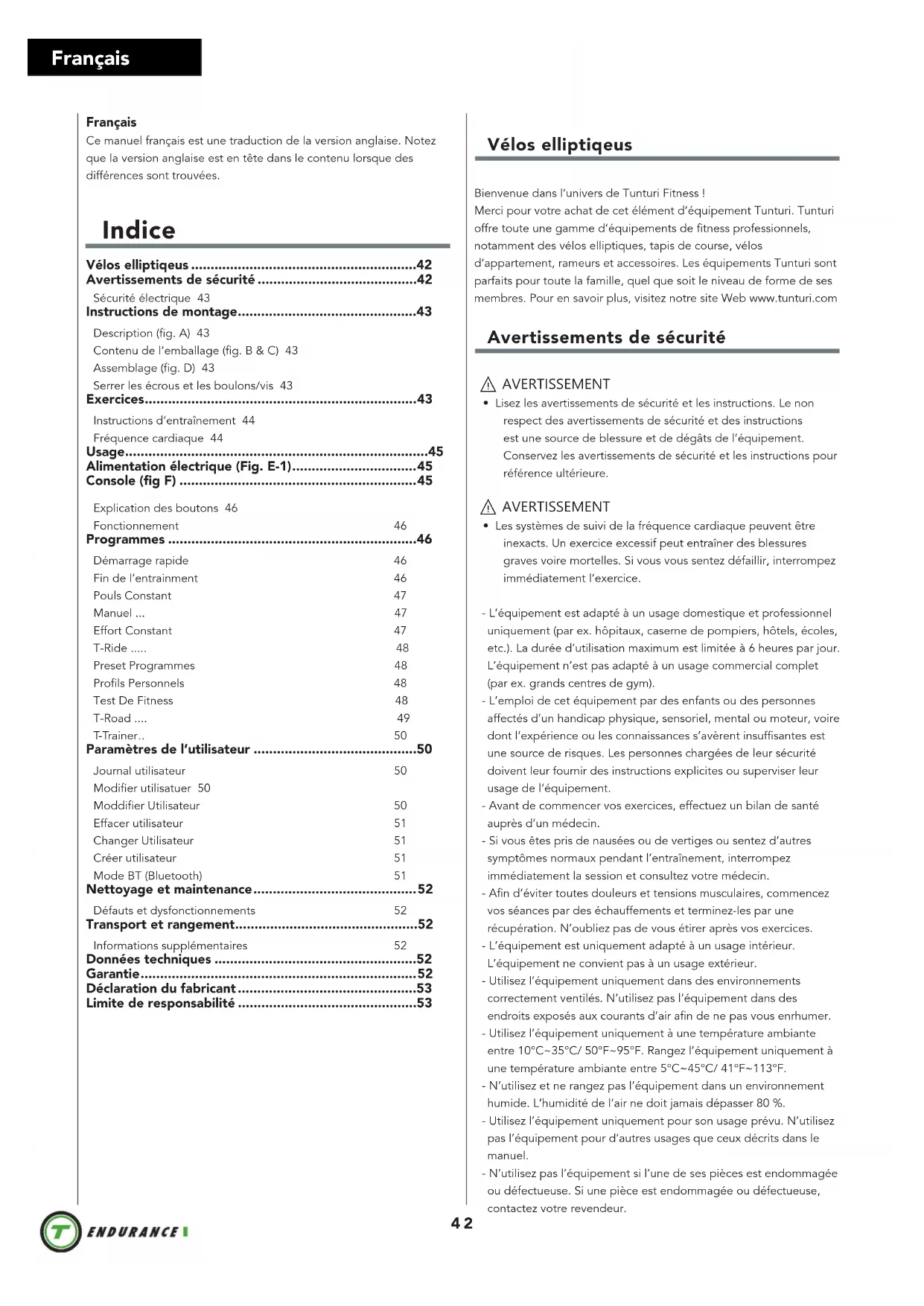 - Les systèmes de suivi de la fréquence cardiaque peuvent être inexacts. Un exercice excessif peut entraîner des blessures graves voire mortelles. Si vous vous sentez défaillir, interrompez immédiatement l’exercice. - L’équipement est adapté à un usage domestique et professionnel uniquement (par ex. hôpitaux, caserne de pompiers, hôtels, écoles, etc.). La durée d’utilisation maximum est limitée à 6 heures par jour. L’équipement n’est pas adapté à un usage commercial complet (par ex. grands centres de gym). - L’emploi de cet équipement par des enfants ou des personnes affectés d’un handicap physique, sensoriel, mental ou moteur, voire dont l’expérience ou les connaissances s’avèrent insuffisantes est une source de risques. Les personnes chargées de leur sécurité doivent leur fournir des instructions explicites ou superviser leur usage de l’équipement. - Avant de commencer vos exercices, effectuez un bilan de santé auprès d’un médecin. - Si vous êtes pris de nausées ou de vertiges ou sentez d’autres symptômes normaux pendant l’entraînement, interrompez immédiatement la session et consultez votre médecin. - Afin d’éviter toutes douleurs et tensions musculaires, commencez vos séances par des échauffements et terminez-les par une récupération. N’oubliez pas de vous étirer après vos exercices. - L’équipement est uniquement adapté à un usage intérieur. L’équipement ne convient pas à un usage extérieur. - Utilisez l’équipement uniquement dans des environnements correctement ventilés. N’utilisez pas l’équipement dans des endroits exposés aux courants d’air afin de ne pas vous enrhumer. - Utilisez l’équipement uniquement à une température ambiante entre 10°C~35°C/ 50°F~95°F. Rangez l’équipement uniquement à une température ambiante entre 5°C~45°C/ 41°F~113°F. - N’utilisez et ne rangez pas l’équipement dans un environnement humide. L’humidité de l’air ne doit jamais dépasser 80 %. - Utilisez l’équipement uniquement pour son usage prévu. N’utilisez pas l’équipement pour d’autres usages que ceux décrits dans le manuel. - N’utilisez pas l’équipement si l’une de ses pièces est endommagée ou défectueuse. Si une pièce est endommagée ou défectueuse, contactez votre revendeur.FrançaisCe manuel français est une traduction de la version anglaise. Notez que la version anglaise est en tête dans le contenu lorsque des différences sont trouvées. Indice Vélos elliptiqeus ..........................................................42Avertissements de sécurité .........................................42Sécurité électrique 43Instructions de montage ..............................................43Description (g. A) 43Contenu de l’emballage (g. B & C) 43Assemblage (g. D) 43Serrer les écrous et les boulons/vis 43 Exercices ...................................................................... 43 Instructions d’entraînement 44Fréquence cardiaque 44Usage ..............................................................................45 Alimentation électrique (Fig. E-1) ................................ 45 Console (g F) .............................................................45 Explication des boutons 46Fonctionnement 46Programmes ................................................................46Démarrage rapide 46Fin de l’entrainment 46Pouls Constant 47Manuel ... 47Effort Constant 47T-Ride ..... 48Preset Programmes 48Prols Personnels 48Test De Fitness 48T-Road .... 49 T-Trainer . . 50 Paramètres de l’utilisateur ..........................................50Journal utilisateur 50Modier utilisatuer 50Moddier Utilisateur 50Effacer utilisateur 51Changer Utilisateur 51Créer utilisateur 51Mode BT (Bluetooth) 51Nettoyage et maintenance .......................................... 52Défauts et dysfonctionnements 52Transport et rangement ...............................................52Informations supplémentaires 52Données techniques ....................................................52 Garantie ....................................................................... 52 Déclaration du fabricant ..............................................53Limite de responsabilité ..............................................5343 Français - Maintenez vos mains, vos pieds et les autres parties de votre corps à l’écart des pièces mobiles. - Maintenez votre chevelure à l’écart des pièces mobiles. - Portez des vêtements et des chaussures adaptés. - Maintenez les vêtements, bijoux et autres objets à l’écart des pièces mobiles. - Assurez-vous qu’une seule personne utilise l’équipement à la fois. L’équipement e doit pas être utilisé par des personnes pesant plus de 135 kg (300 lbs). - N’ouvrez pas l’équipement sans consulter votre revendeur. Sécurité électrique (Uniquement pour les équipements à alimentation électrique) - Avant usage, assurez-vous toujours que la tension secteur est identique à celle de la plaque signalétique de l’équipement. - N’utilisez pas de rallonge. - Maintenez le câble secteur à l’écart de la chaleur, de l’huile et des bords coupants. - N’altérez et ne modifiez aucunement le câble secteur ou la fiche secteur. - N’utilisez pas l’équipement si le câble secteur ou la fiche secteur est endommagé ou défectueux. Si le câble secteur ou la fiche secteur est endommagé ou défectueux, contactez votre revendeur. - Déroulez toujours complètement le câble secteur. - Ne passez pas le câble secteur sous l’équipement. Ne passez pas le câble secteur sous un tapis. Ne placez aucun objet sur le câble secteur. - Assurez-vous que le câble secteur ne pend pas sur le bord d’une table. Assurez-vous que le câble secteur ne peut pas être happé par accident ou faire trébucher. - Ne laissez pas l’équipement sans surveillance si la fiche secteur est insérée dans la prise murale. - Ne tirez p