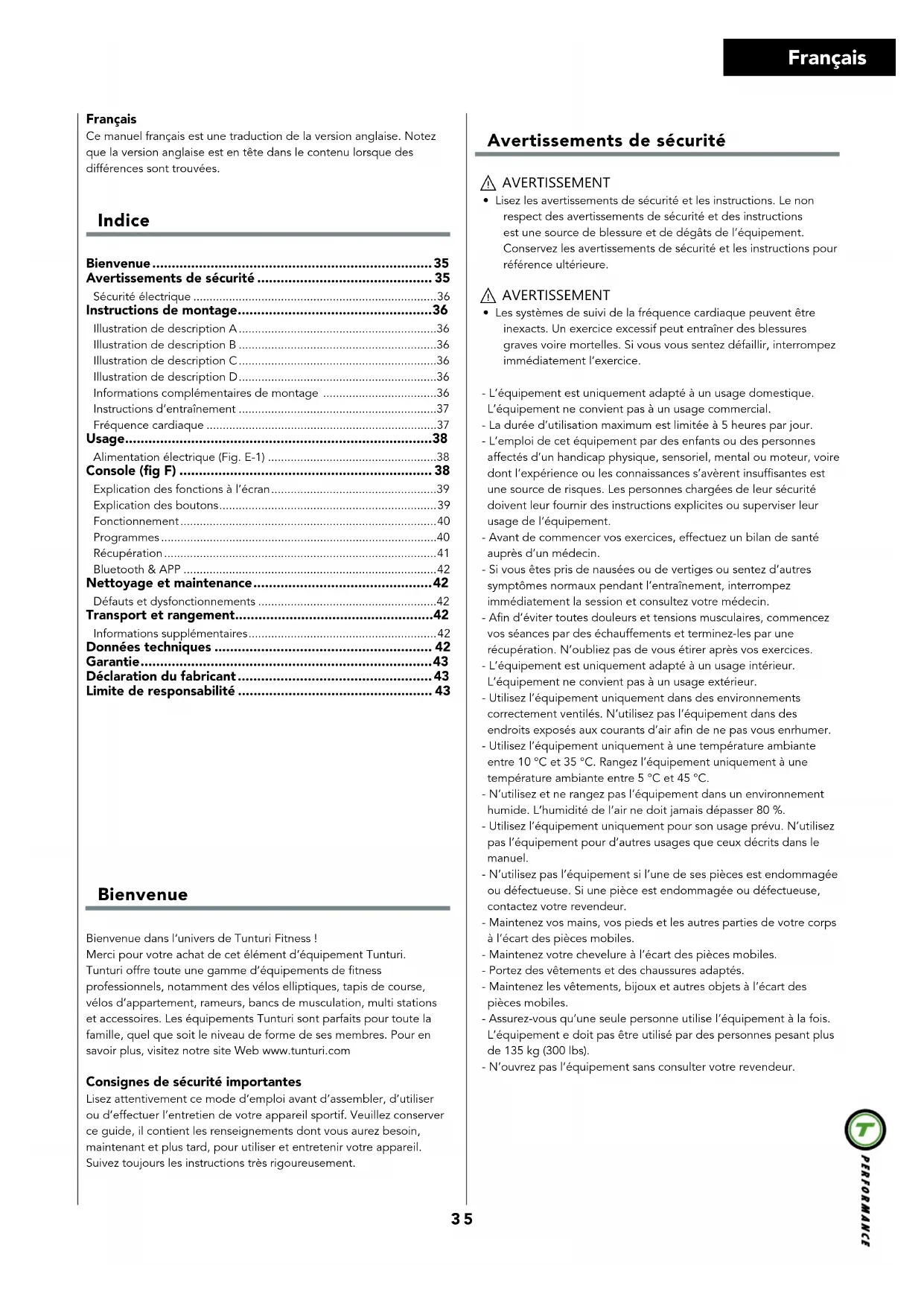 Spannung 230 AC Garantie Eigentümer-garantie für Tunturi fitnessgeräte Garantiebedingungen Der Käufer ist berechtigt die den Handel mit Konsumgütern betreffenden gesetzlichen Rechte gemäß der nationalen Gesetzgebung in Anwendung zu bringen Diese Rechte werden durch die Garantie nicht eingeschränkt Bedingungen zu ersetzen Die Eigentümer-Garantie gilt nur dann, wenn das Gerät in einer für entsprechende Geräte der Tunturi New Fitness BV zugelassenen Anwendungsumgebung verwendet wird Die für das Gerät zugelassene Anwendungsumgebung wird in der Bedienungsanleitung des Geräts genannt Garantiedauer Die Garantie gilt ab Kaufdatum Die Garantiedauer kann sich je nach Land unterscheiden Bitte wenden Sie sich an Ihren zuständigen Händler, um die Garantiedauer zu erfahren Garantieumfang Unter keinen Umständen haften die Tunturi New Fitness BV oder der Tunturi-Vertragshändler für dem Käufer möglicherweise zugefügte indirekte Schäden wie Gebrauchsbeeinträchtigung oder Einkommensverlust oder anderen wirtschaftlichen Folgeschäden34 Deutsch Einschränküngen der garantie Die Garantie deckt durch Herstellung oder Material hervorgerufene Fehler des Fitnessgeräts in dessen ursprünglicher Zusammensetzung Unter Voraussetzung, dass die Aufbau-, Pflege- und Gebrauchsanweisungen von Tunturi befolgt wurden, erstreckt sich die Garantie auf solche Fehler, die bei normaler und einem dem Gerät beiliegenden Anleitungsbuch entsprechender Benutzung auftreten können Die Tunturi New Fitness BV und der Tunturi-Vertragshändler haften nicht für Fehler, die durch Faktoren außerhalb ihrer Einflussmöglichkeiten hervorgerufen wurden Die Garantie gilt nur für den ursprünglichen Eigentümer und nur in den Ländern, in denen es einen von der Tunturi New Fitness BV autorisierten Importeur gibt Die Garantie gilt nicht für solche Fitnessgeräte oder Teile, an denen ohne Zustimmung der Tunturi New Fitness BV Veränderungen vorgenommen worden sind Die Garantie betrifft auch nicht solche Schäden, die durch natürlichen Verschleiß, fehlerhaften Gebrauch, Benutzung unter für das Gerät nicht vorgesehenen Umständen, Korrosion, Verladung oder Transport hervorgerufen wurden Ersatzleistungen aufgrund von Geräuschen, die beim Einsatz des Geräts auftreten, sind von der Garantie ausgeschlossen, sofern diese Geräusche den Gebrauch des Geräts nicht wesentlich beeinträchtigen und nicht durch einen Gerätefehler bedingt sind Die Garantie beinhaltet keine Wartungsmaßnahmen, wie Reinigung, Schmieren oder normales Kontrollieren der Teile, auch nicht solche Aufbaumaßnahmen, die der Kunde selbst ausführen kann und die kein spezielles Auseinander- oder Zusammenbauen des Fitnessgeräts erfordern Zu solchen Maßnahmen gehört beispielsweise das Austauschen von Cockpits, Pedalen oder anderer entsprechender einfacher Teile Andere als die durch einen autorisierten Tunturi- Vertreter ausgeführten Garantieleistungen werden nicht ersetzt Durch unsachgemäße, dh nicht der Bedienungsanleitung entsprechenden, Bedienung, verfällt jedweder Garantieanspruch Herstellererklärung Tunturi New Fitness BV erklärt hiermit, dass das Produkt folgenden Normen und Richtlinien entspricht: EN 957 (HB), 2014/30/EU Das Produkt trägt daher das CE-Kennzeichen 04-2020 Tunturi New Fitness BV Purmerweg 1 1311 XE Almere The Netherlands Haftungsausschluss © 2020 Tunturi New Fitness BV Alle Rechte vorbehalten - Produkt und Handbuch können geändert werden - Die technischen Daten können ohne Vorankündigung geändert werden - Auf unserer Website finden Sie die neueste Version des Benutzerhandbuchs35 Français Bienvenue Bienvenue dans l‘univers de Tunturi Fitness !Merci pour votre achat de cet élément d‘équipement Tunturi Tunturi offre toute une gamme d‘équipements de fitness professionnels, notamment des vélos elliptiques, tapis de course, vélos d‘appartement, rameurs, bancs de musculation, multi stations et accessoires Les équipements Tunturi sont parfaits pour toute la famille, quel que soit le niveau de forme de ses membres Pour en savoir plus, visitez notre site Web wwwtunturicom Consignes de sécurité importantes Lisez attentivement ce mode d’emploi avant d’assembler, d’utiliser ou d’effectuer l’entretien de votre appareil sportif Veuillez conserver ce guide, il contient les renseignements dont vous aurez besoin, maintenant et plus tard, pour utiliser et entretenir votre appareil Suivez toujours les instructions très rigoureusement Bienvenue 35 Avertissements de sécurité 35 Sécurité électrique 36 Instructions de montage 36 Illustration de description A 36Illustration de description B 36Illustration de description C 36Illustration de description D 36Informations complémentaires de montage 36Instructions d’entraînement 37Fréquence cardiaque 37 Usage 38 Alimentation électrique (Fig E-1) 38 Console (g F) 38 Explication des fonctions à l’écran 39 Explication des boutons 39 Fonctionnement 40 Programmes 40 Récupération 41 Bluetooth & APP 42 Nettoyage et maintenance 42 Défauts et dysfonctionnements 42 Transport et rangement 42 Informations supplémentaires 42 Données techniques 42 Garantie 43 Déclaration du fabricant 43 Limite de responsabilité 43 Français Ce manuel français est une traduction de la version anglaise Notez que la version anglaise est en tête dans le contenu lorsque des différences sont trouvées Indice Avertissements de sécurité ⚠ AVERTISSEMENT
