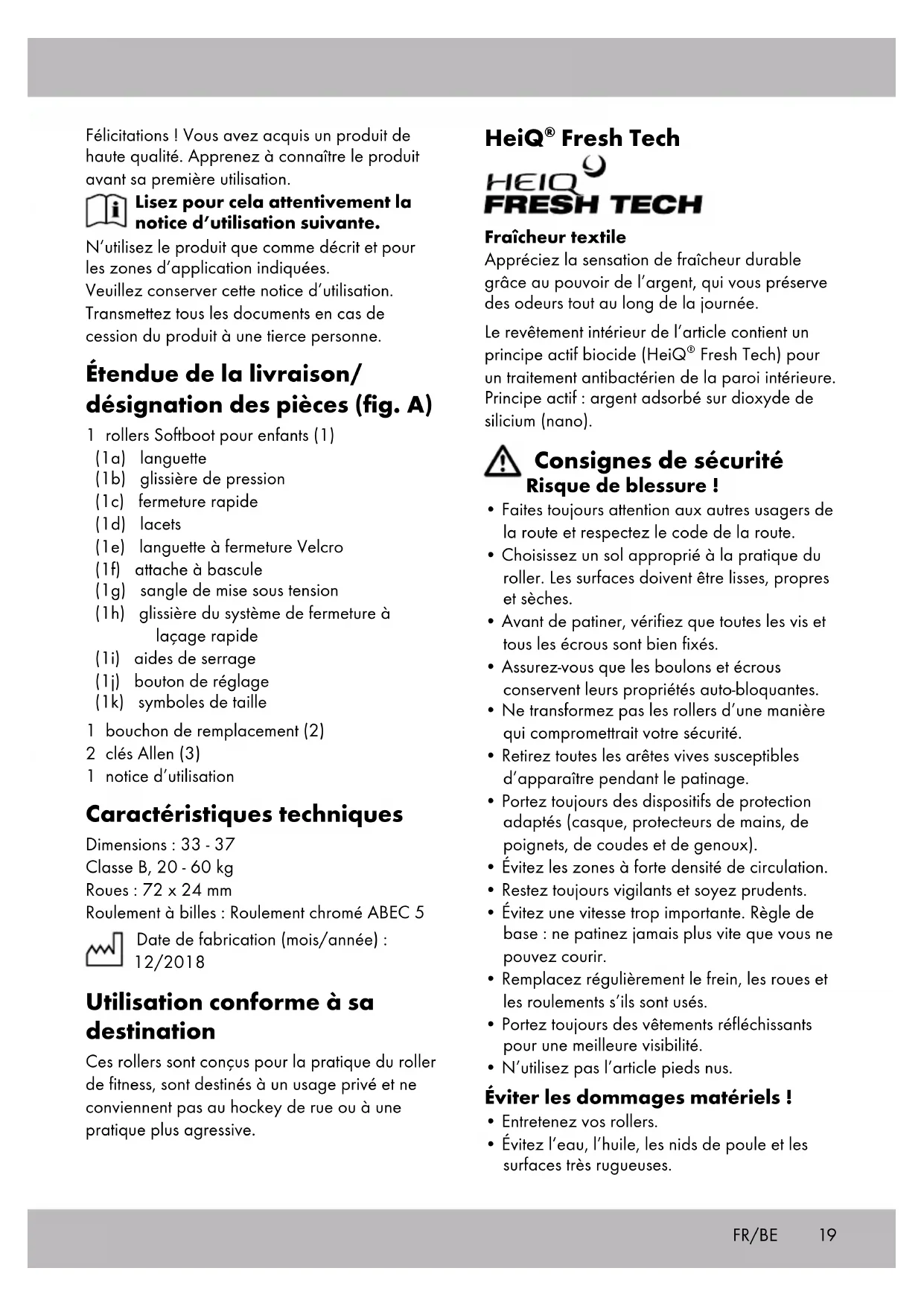 - Évitez l’eau, l’huile, les nids de poule et les surfaces très rugueuses. Félicitations ! Vous avez acquis un produit de haute qualité. Apprenez à connaître le produit avant sa première utilisation. Lisez pour cela attentivement la notice d’utilisation suivante. N’utilisez le produit que comme décrit et pour les zones d’application indiquées. Veuillez conserver cette notice d’utilisation. Transmettez tous les documents en cas de cession du produit à une tierce personne. Étendue de la livraison/ désignation des pièces (fig. A) 1 rollers Softboot pour enfants (1) (1a) languette (1b) glissière de pression (1c) fermeture rapide (1d) lacets (1e) languette à fermeture Velcro (1f) attache à bascule (1g) sangle de mise sous tension (1h) glissière du système de fermeture à laçage rapide (1i) aides de serrage (1j) bouton de réglage (1k) symboles de taille 1 bouchon de remplacement (2) 2 clés Allen (3) 1 notice d’utilisation Caractéristiques techniques Dimensions : 33 - 37 Classe B, 20 - 60 kg Roues : 72 x 24 mm Roulement à billes : Roulement chromé ABEC 5 Date de fabrication (mois/année) : 12/2018 Utilisation conforme à sa destination Ces rollers sont conçus pour la pratique du roller de fitness, sont destinés à un usage privé et ne conviennent pas au hockey de rue ou à une pratique plus agressive. FR/BE20 Frein de talon (fig. C) : si vos rollers sont équipés de freins, pensez à les utiliser. Soulevez légèrement la pointe du patin sur lequel le frein est monté et appuyez sur le frein au sol. Déplacez légèrement votre poids vers l’avant et pliez les genoux. L’effet de frei- nage peut être amélioré si vous pliez davantage vos genoux et déplacez votre poids vers l’avant tout en augmentant la pression sur votre patin frein. Frein en T (fig. D) : si vos rollers ne sont pas équipés de freins ou si vous avez démonté le frein, nous recommandons l’utilisation de la technologie « T-Stop-Techno- logy » - mais elle ne s’adresse qu’aux patineurs avancés ! En utilisant la technique « T-Stop », vous déplacez votre poids total sur un seul pied. Placez l’autre pied derrière le premier et placez-le derrière lui à angle droit. Ensuite, déplacez votre poids de l’avant vers l’intérieur des rouleaux de votre patin arrière et freinez avec une pression croissante. Réglage de la taille (fig. E) Appuyez sur le bouton de réglage (1j) vers le bas et déplacez la chaussure à la taille souhai- tée tout en maintenant le bouton de réglage enfoncé. La chaussure doit s’engager avec un « CLIC » perceptible. La flèche sur la chaussure indique la taille adéquate (1k) sur le cadre. Réglage de la largeur (fig. F) Desserrez la vis sur la face inférieure de l’article avec la longue clé Allen (3) fournie en la tour- nant dans le sens de la flèche. Ajustez la largeur à vos besoins personnels en déplaçant la chaussure. Resserrez ensuite la vis. Mettre l’équipement Préparation à l’équipement à partir de l’état de livraison Important ! Assurez-vous que vos rol- lers sont correctement positionnés. Conseils pour patiner Remarque : nous vous recommandons de patiner dans un skate park et de suivre un cours de rollers avec un moniteur. Première séance Position de départ : debout, les pieds écartés à largeur d’épaules, pliez légèrement vos genoux afin d’éviter toute chute vers l’arrière. Accélérer : en tant que débutant, commencez par de petits pas orteils orientés vers l’extérieur en diagonale vers l’avant. Rouler : si vous faites quelques pas consécutifs, vous au- rez assez d’élan pour placer les deux patins l’un à côté de l’autre et rouler. Fléchissez légèrement les genoux. Technique de chute Important ! Entraînez-vous d’abord à tomber sur une surface souple avec votre équipement de protection sans rollers. Essayez toujours de tomber vers l’avant, jamais vers l’arrière ! Laissez-vous tomber sur les genouillères. Ensuite, absorbez la chute avec les protecteurs de coudes et de mains. Écartez les doigts pour éviter de vous blesser. Contrôle des courbes À vitesse réduite : déplacer le poids comme sur un vélo. Déplacez votre poids sur le pied gauche pour un virage à gauche et sur le pied droit pour un virage à droite. À vitesse élevée : se déplacer comme pour le patinage (fig. B). Techniques de freinage Remarque : exercez-vous aux différentes techniques de freinage sur une surface plane, sans circulation ni piétons. Évitez les pentes jusqu’à ce que vous maîtrisiez les techniques de freinage. FR/BE21FR/BE