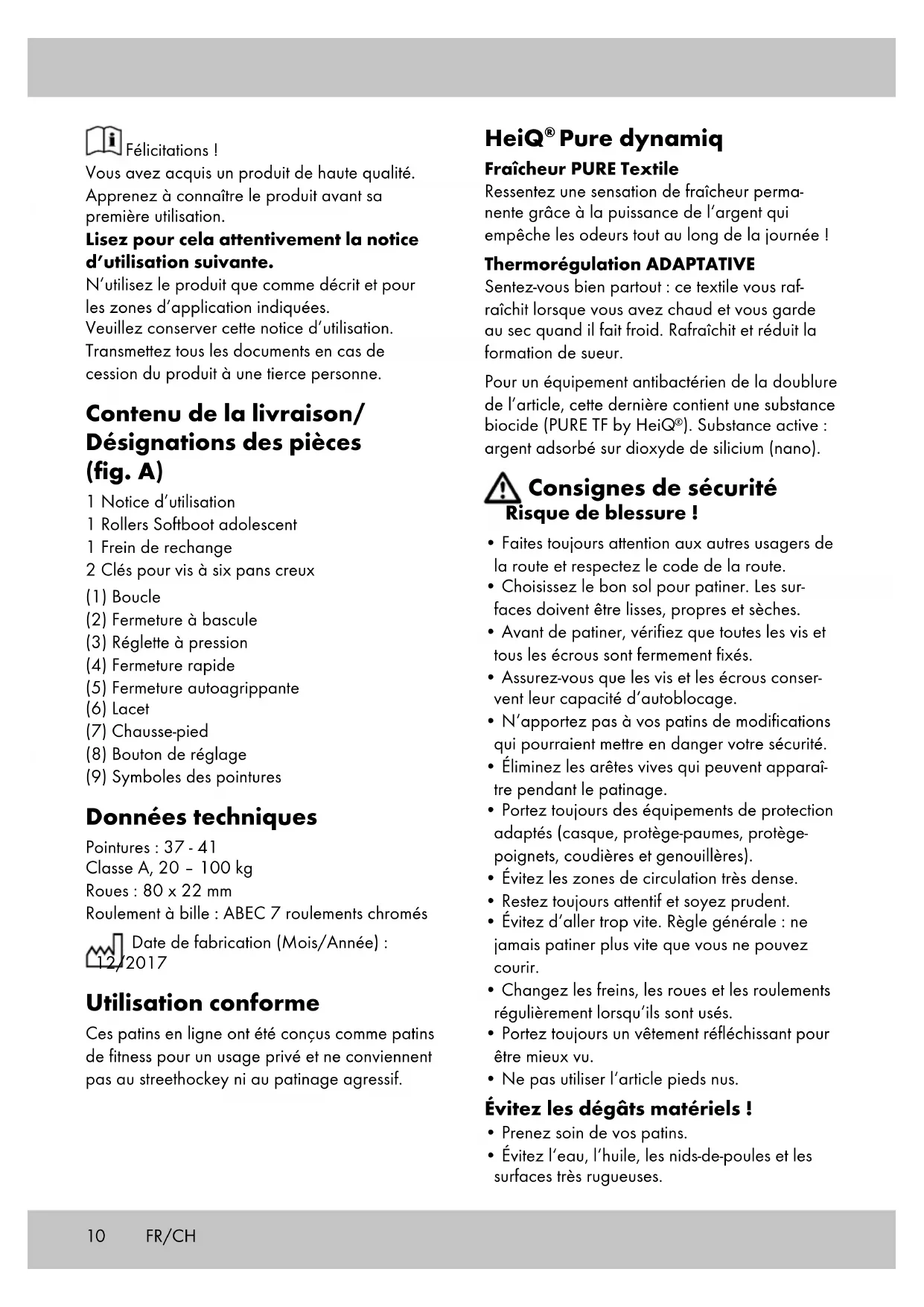 - Évitez l‘eau, l‘huile, les nids-de-poules et les surfaces très rugueuses. Félicitations ! Vous avez acquis un produit de haute qualité. Apprenez à connaître le produit avant sa première utilisation. Lisez pour cela attentivement la notice d’utilisation suivante. N’utilisez le produit que comme décrit et pour les zones d’application indiquées. Veuillez conserver cette notice d’utilisation. Transmettez tous les documents en cas de cession du produit à une tierce personne. Contenu de la livraison/ Désignations des pièces (fig. A) 1 Notice d’utilisation 1 Rollers Softboot adolescent 1 Frein de rechange 2 Clés pour vis à six pans creux (1) Boucle (2) Fermeture à bascule (3) Réglette à pression (4) Fermeture rapide (5) Fermeture autoagrippante (6) Lacet (7) Chausse-pied (8) Bouton de réglage (9) Symboles des pointures Données techniques Pointures : 37 - 41 Classe A, 20 – 100 kg Roues : 80 x 22 mm Roulement à bille : ABEC 7 roulements chromés Date de fabrication (Mois/Année) : 12/2017 Utilisation conforme Ces patins en ligne ont été conçus comme patins de fitness pour un usage privé et ne conviennent pas au streethockey ni au patinage agressif. FR/CH11FR/CH Freinage avec le talon (fig. C) : Si vos patins en lignes sont équipés de freins, pensez à les utiliser. Soulevez légèrement la pointe du patin sur lequel le frein est monté et appuyez avec le frein sur le sol. Déplacez votre poids légèrement vers l‘avant et pliez les genoux. L‘effet de freinage peut être renforcé si vous pliez plus les genoux et que vous déplacez votre poids plus vers l‘avant pendant que vous renforcez en même temps la pression sur votre patin freineur. Freinage en T (fig. D) : Si vos patins en ligne ne sont pas équipés de freins ou si vous avez démonté les freins, nous vous recommandons d‘utiliser la « technique d‘arrêt en T » qui n‘est toutefois adaptée qu‘aux patineurs avancés ! Lors de l‘utilisation de la « technique d‘arrêt en T », déplacez tout votre poids sur un pied. Maintenant, déplacez l‘autre pied derrière le premier et placez-le à angle droit derrière celui-ci. Ensuite, déplacez votre poids de devant sur le côté intérieur des roues de votre patin arrière et freinez avec une pression croissante. Réglage des pointures (fig. E) Appuyez sur le bouton de réglage (8) et réglez la chaussure, en maintenant le bouton de régla- ge enfoncé, sur la pointure souhaitée. La chaussure doit s‘encliqueter en faisant entendre un « clic ». La flèche sur la chaussure indique alors la pointure correspondante (9) sur le châssis. Réglage de la largeur (fig. F) Dévissez la vis sur le dessous de l‘article avec la longue clé six pans fournie en tournant dans le sens de la flèche. Ajustez la largeur en réglant la chaussure sur vos besoins individuels. Puis revissez la vis à fond. Conseils pour patiner Indication : Nous recommandons de patiner dans les skate-parks ou/et dans un cours de patinage avec professeur. Premier exercice Position de départ : Écartez les pieds de la largeur des épaules, de- scendez légèrement en flexion afin d‘empêcher une chute en arrière. Position de départ : En tant que débutant, commencez par des pe- tits pas, avec les pointes des pieds dirigées vers l‘extérieur, et le corps incliné vers l‘avant. Roues : Si vous faites quelques pas l‘un après l‘autre, vous aurez ensuite suffisamment d‘élan pour placer les deux patins côte à côte et patiner. Ce faisant, pliez légèrement les genoux. Technique de chute Important ! Entraînez-vous à chuter sur l‘équipement de protection tout d‘abord sans patins et sur une surface souple. Essayez tou- jours d‘amortir la chute en avant, jamais en ar- rière ! Laissez-vous tomber sur les genouillères. Amortissez la chute ensuite avec les coudières et les protège-paumes. Écartez alors les doigts pour éviter des blessures. Maîtriser les courbes À un rythme lent : Déplacement du poids comme pour la conduite du vélo. Pour une courbe à gauche, déplacez votre poids sur le pied gauche et inversement sur le pied droit pour une courbe à droite. À un rythme rapide : Pas croisés comme au patin à glace (fig. B). Techniques de freinage Indication : Entraînez-vous aux différentes tech- niques de freinage sur une surface plane, sans circulation et sans piétons. Évitez les pentes jusqu‘à ce que vous maîtrisiez les techniques de freinage.12 Si la distance entre le tampon de frein et le sol devient trop grand (>17 mm), le tampon de frein doit être remplacé.
