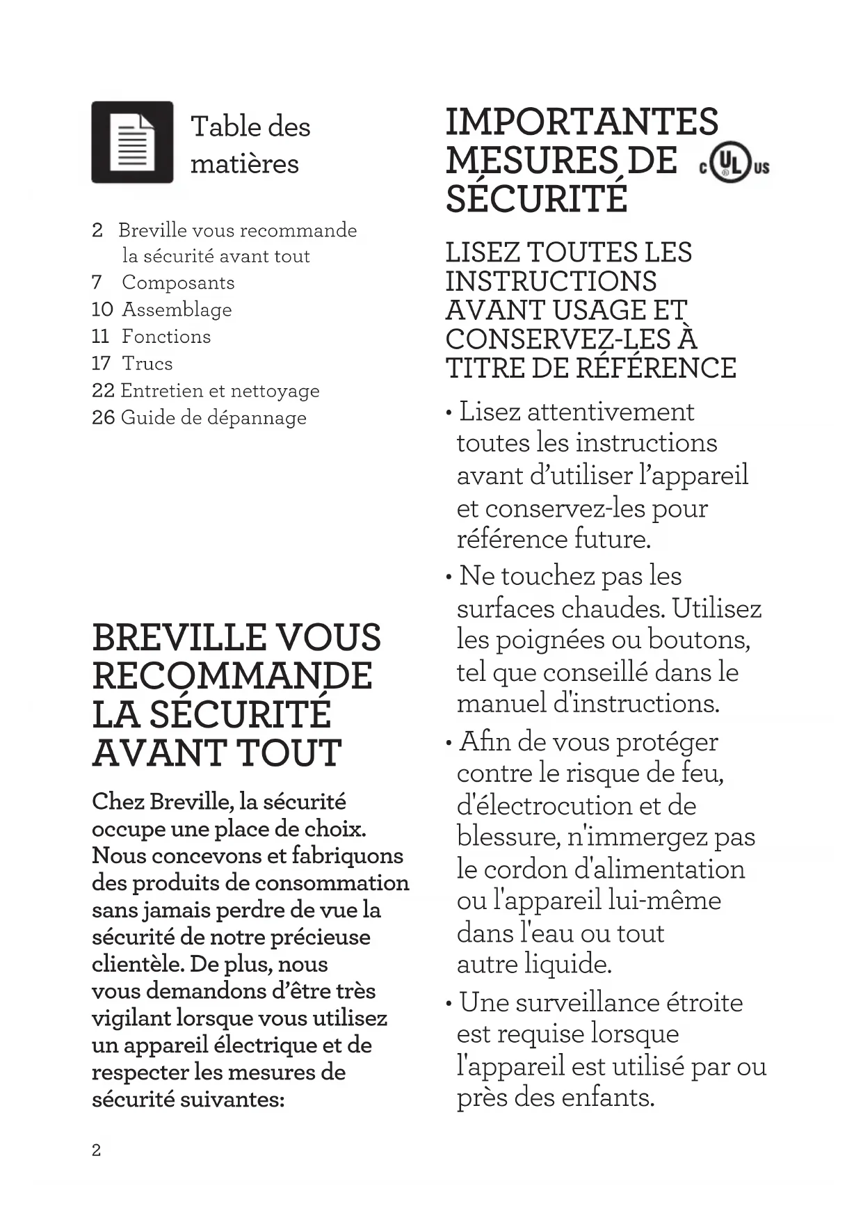 AVANT TOUT Chez Breville, la sécurité occupe une place de choix. Nous concevons et fabriquons des produits de consommation sans jamais perdre de vue la sécurité de notre précieuse clientèle. De plus, nous vous demandons d’être très vigilant lorsque vous utilisez un appareil électrique et de respecter les mesures de sécurité suivantes: IMPORTANTES MESURES DE SÉCURITÉ