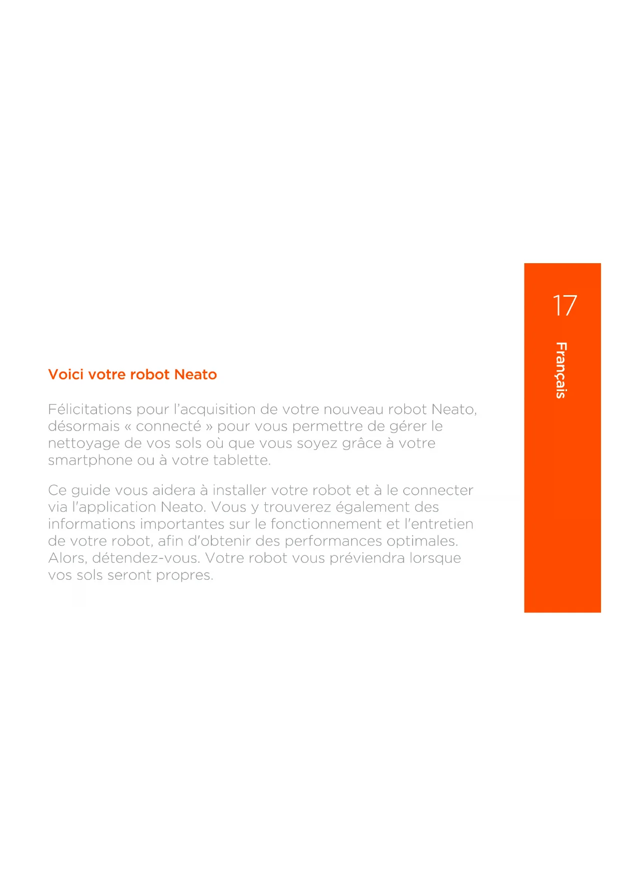 Voici votre robot Neato Félicitations pour l’acquisition de votre nouveau robot Neato, désormais « connecté » pour vous permettre de gérer le nettoyage de vos sols où que vous soyez grâce à votre smartphone ou à votre tablette. Ce guide vous aidera à installer votre robot et à le connecter via l'application Neato. Vous y trouverez également des informations importantes sur le fonctionnement et l'entretien de votre robot, afin d'obtenir des performances optimales. Alors, détendez-vous. Votre robot vous préviendra lorsque vos sols seront propres.4