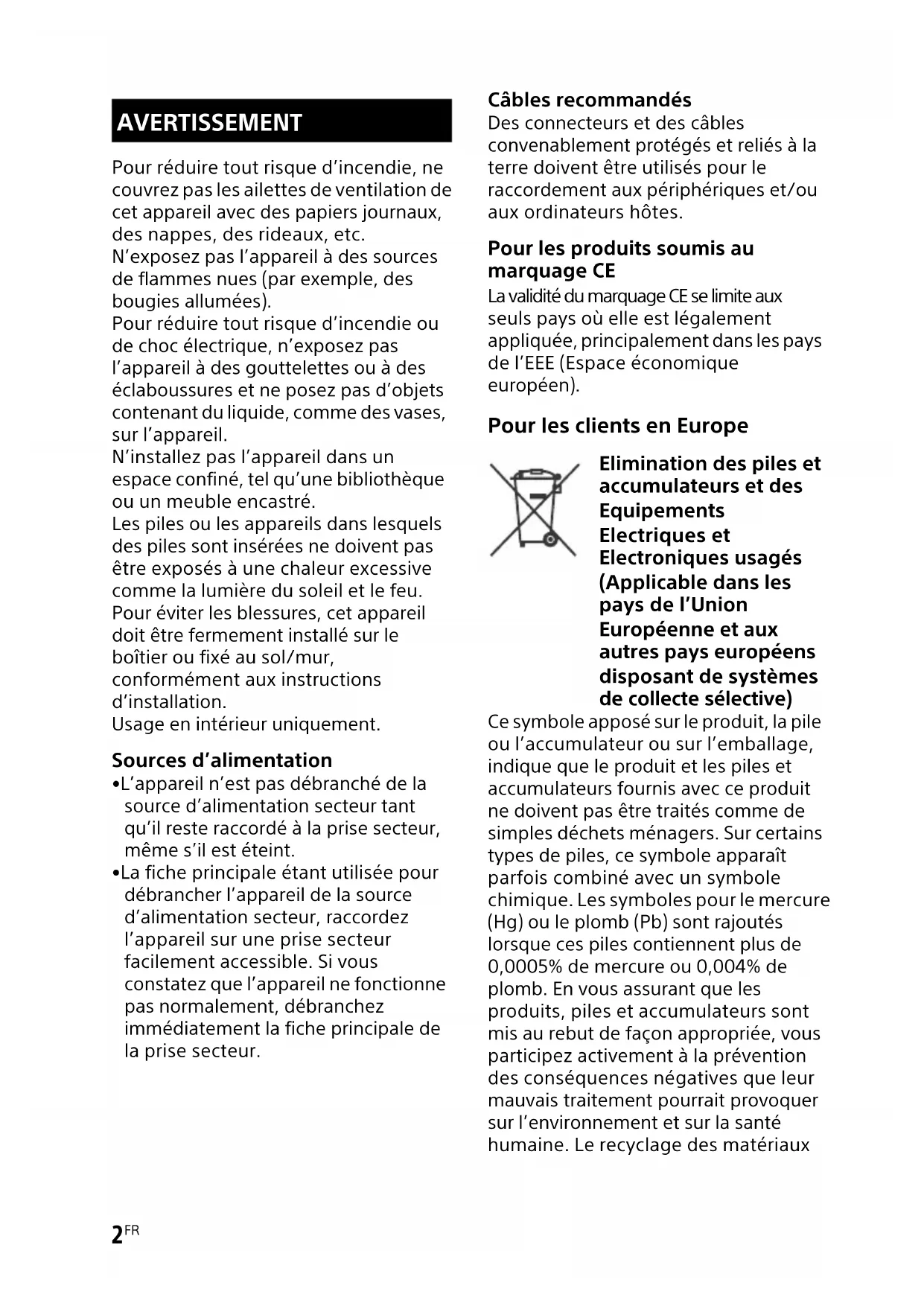 - La fiche principale étant utilisée pour débrancher l’appareil de la source d’alimentation secteur, raccordez l’appareil sur une prise secteur facilement accessible. Si vous constatez que l’appareil ne fonctionne pas normalement, débranchez immédiatement la fiche principale de la prise secteur. Câbles recommandés Des connecteurs et des câbles convenablement protégés et reliés à la terre doivent être utilisés pour le raccordement aux périphériques et/ou aux ordinateurs hôtes. Pour les produits soumis au marquage CE La validité du marquage CE se limite aux seuls pays où elle est légalement appliquée, principalement dans les pays de l’EEE (Espace économique européen). Pour les clients en Europe Elimination des piles et accumulateurs et des Equipements Electriques et Electroniques usagés (Applicable dans les pays de l’Union Européenne et aux autres pays européens disposant de systèmes de collecte sélective) Ce symbole apposé sur le produit, la pile ou l’accumulateur ou sur l’emballage, indique que le produit et les piles et accumulateurs fournis avec ce produit ne doivent pas être traités comme de simples déchets ménagers. Sur certains types de piles, ce symbole apparaît parfois combiné avec un symbole chimique. Les symboles pour le mercure (Hg) ou le plomb (Pb) sont rajoutés lorsque ces piles contiennent plus de 0,0005% de mercure ou 0,004% de plomb. En vous assurant que les produits, piles et accumulateurs sont mis au rebut de façon appropriée, vous participez activement à la prévention des conséquences négatives que leur mauvais traitement pourrait provoquer sur l’environnement et sur la santé humaine. Le recyclage des matériaux AVERTISSEMENT3