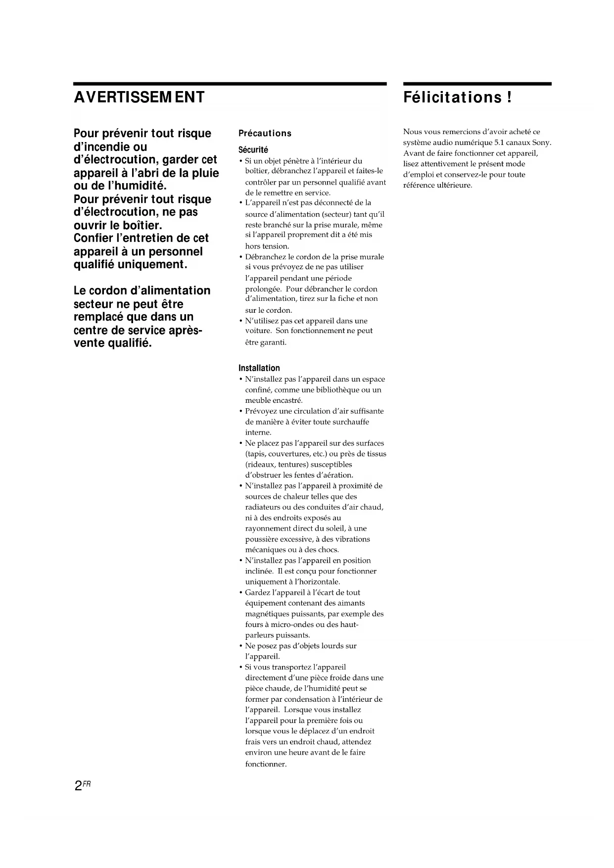 Félicitations ! Nous vous remercions d’avoir acheté cesystème audio numérique 5.1 canaux Sony.Avant de faire fonctionner cet appareil,lisez attentivement le présent moded’emploi et conservez-le pour touteréférence ultérieure. AVERTISSEMENT Pour prévenir tout risque d’incendie ou d’électrocution, garder cet appareil à l’abri de la pluie ou de l’humidité. Pour prévenir tout risque d’électrocution, ne pas ouvrir le boîtier. Confier l’entretien de cet appareil à un personnel qualifié uniquement. Le cordon d’alimentation secteur ne peut être remplacé que dans un centre de service après- vente qualifié. Précautions Sécurité