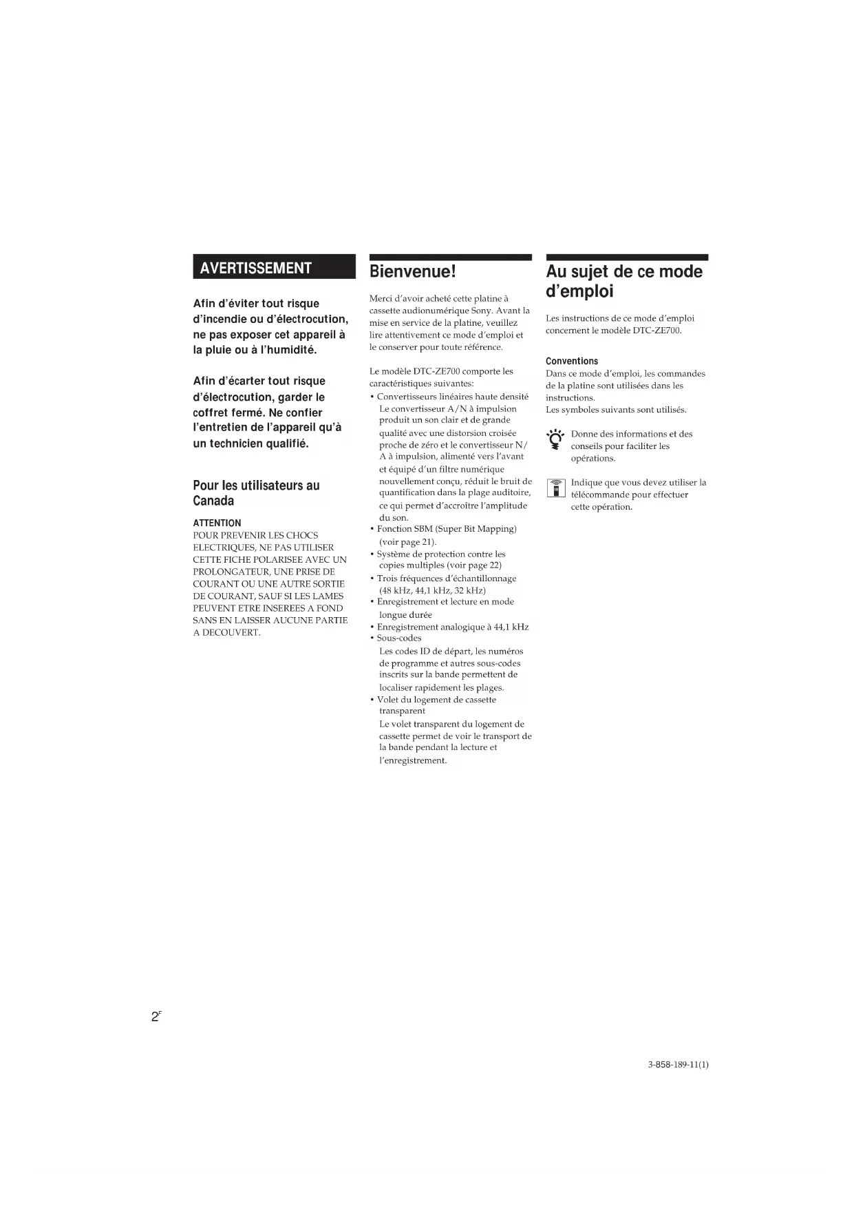 Table des matières Préparatifs Déballage 4 Raccordements 4 Enregistrement sur une cassette DAT 6 Lecture d'une cassette DAT 8 Enregistrement Ce que vous devez savoir avant de commencer à enregistrer 9 Réglage du niveau d'enregistrement pour l'enregistrement analogique 10 Localisation de la fin de l’enregistrement précédent (recherche de fin) 10 Réglage du mode d'enregistrement 11 Utilisation de la fonction SBM (Super Bit Mapping) 11 Création d'un passage en sourdine pendant l'enregistrement (silencieux d'enregistrement) 12 Enregistrement avec une minuterie (enregistrement programmé) 12 Lecture Utilisation de l'affichage 13 Localisation d'une plage (AMS*/accès direct) 14 Répétition de plages (lecture répétée) 14 Lecture avec une minuterie (lecture programmée) 15 Inscription de sous-codes Utilisation des sous-codes 15 Inscription de codes ID de départ pendant l'enregistrement 15 Inscription de codes ID de départ pendant la lecture 16 Changement de la position d'un code ID de départ préenregistré 17 Effacement de codes ID de départ 17 Renumérotation automatique des numéros de programme 18 Informations supplémentaires Précautions 18 Nettoyage 19 Messages sur l'affichage 19 Guide de dépannage 20 Spécifications 21 Fonction SBM (Super Bit Mapping) 21 Guide pour le système de protection contre les copies multiples 22 Index 24Préparatifs 3-858-189-11(1)