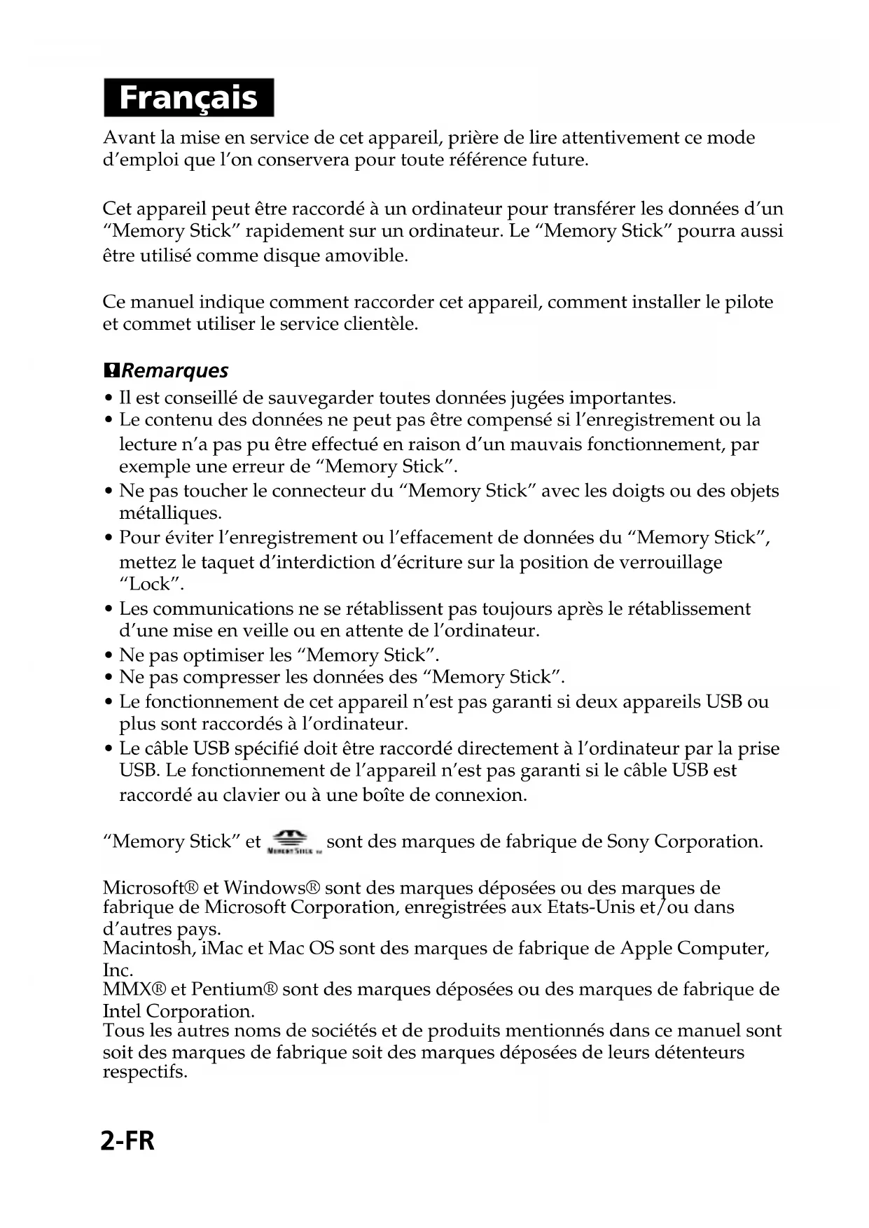 - Le câble USB spécifié doit être raccordé directement à l’ordinateur par la prise USB. Le fonctionnement de l’appareil n’est pas garanti si le câble USB est raccordé au clavier ou à une boîte de connexion. “Memory Stick” et sont des marques de fabrique de Sony Corporation. Microsoft® et Windows® sont des marques déposées ou des marques de fabrique de Microsoft Corporation, enregistrées aux Etats-Unis et/ou dans d’autres pays. Macintosh, iMac et Mac OS sont des marques de fabrique de Apple Computer, Inc. MMX® et Pentium® sont des marques déposées ou des marques de fabrique de Intel Corporation. Tous les autres noms de sociétés et de produits mentionnés dans ce manuel sont soit des marques de fabrique soit des marques déposées de leurs détenteurs respectifs.3-FR Table des matières A propos du formatage des “Memory Stick” Les “Memory Stick” sont formatés en usine dans un format spécial. Lorsque vous formatez des “Memory Stick”, il est conseillé de les formater sur l’appareil utilisé pour qu’ils soient compatibles. Précautions lors du formatage de “Memory Stick” sur un ordinateur Veuillez prendre les précautions suivantes lors du formatage de “Memory Stick” sur un ordinateur.