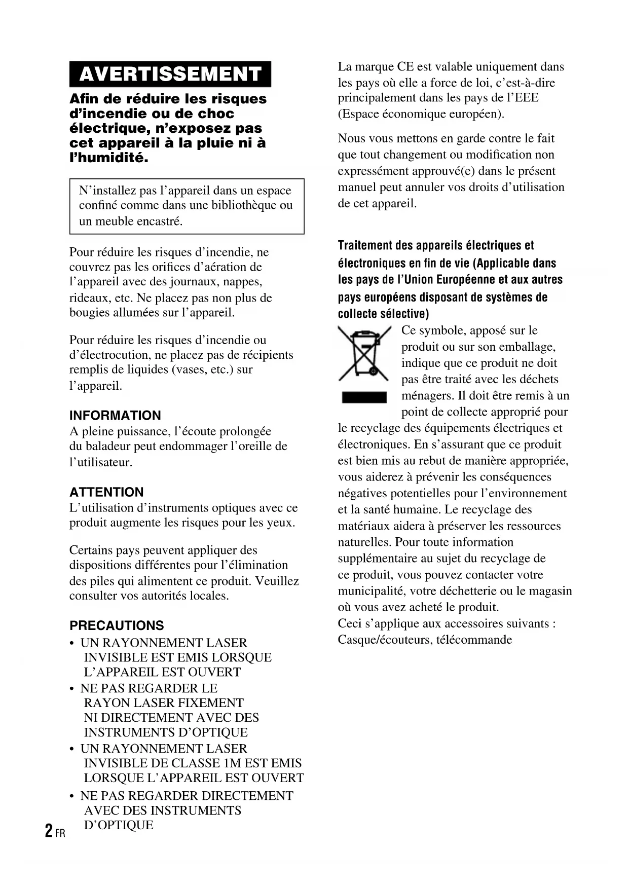 - D’OPTIQUE La marque CE est valable uniquement dans les pays où elle a force de loi, c’est-à-dire principalement dans les pays de l’EEE (Espace économique européen). Nous vous mettons en garde contre le fait que tout changement ou modification non expressément approuvé(e) dans le présent manuel peut annuler vos droits d’utilisation de cet appareil. Traitement des appareils électriques et électroniques en fin de vie (Applicable dans les pays de l’Union Européenne et aux autres pays européens disposant de systèmes de collecte sélective) Ce symbole, apposé sur le produit ou sur son emballage, indique que ce produit ne doit pas être traité avec les déchets ménagers. Il doit être remis à un point de collecte approprié pour le recyclage des équipements électriques et électroniques. En s’assurant que ce produit est bien mis au rebut de manière appropriée, vous aiderez à prévenir les conséquences négatives potentielles pour l’environnement et la santé humaine. Le recyclage des matériaux aidera à préserver les ressources naturelles. Pour toute information supplémentaire au sujet du recyclage de ce produit, vous pouvez contacter votre municipalité, votre déchetterie ou le magasin où vous avez acheté le produit. Ceci s’applique aux accessoires suivants : Casque/écouteurs, télécommande D-NF430/NF431.FR.2-663-956-21(1) 2 FRFR A propos des marques « WALKMAN » est une marque déposée par Sony Corporation pour représenter les produits stéréo dotés d’écouteurs. est une marque de Sony Corporation. SonicStage est une marque de Sony Corporation. ATRAC, ATRAC3, ATRAC3plus et ATRAC Advanced Lossless sont des marques de Sony Corporation. Table des matières Créez vos propres CD ATRAC p. 4