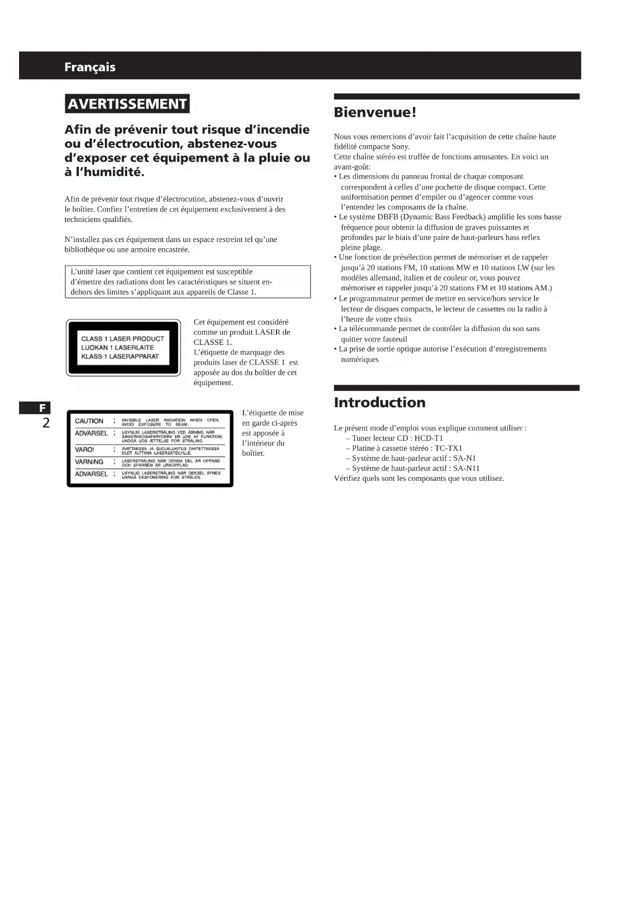 - La prise de sortie optique autorise l’exécution d’enregistrements numériques Introduction Le présent mode d’emploi vous explique comment utiliser : – Tuner lecteur CD : HCD-T1 – Platine à cassette stéréo : TC-TX1 – Système de haut-parleur actif : SA-N1 – Système de haut-parleur actif : SA-N11 Vérifiez quels sont les composants que vous utilisez.F
