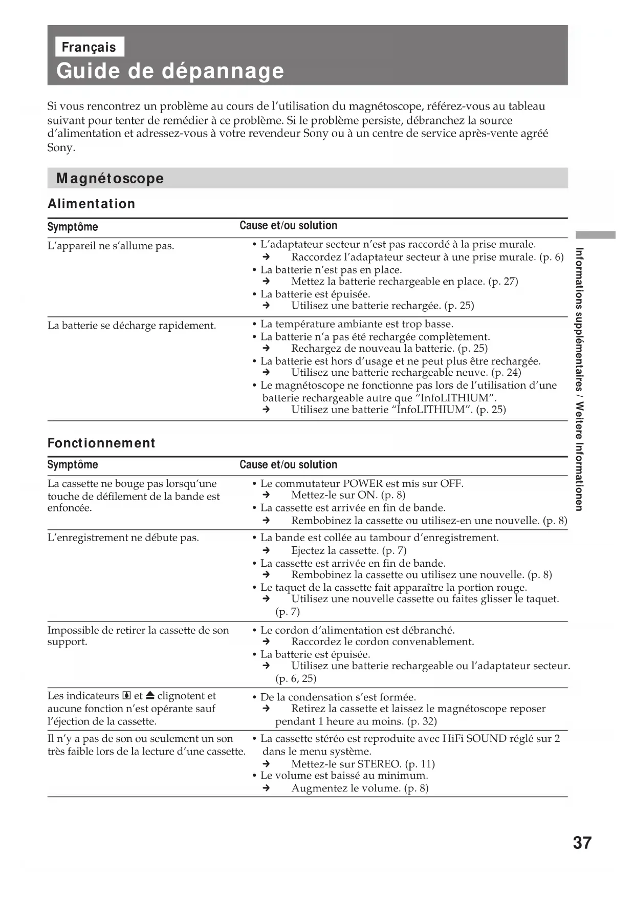 - Stellen Sie das Gerät nicht an einen Ort, an dem es folgenden Bedingungen ausgesetzt ist: - extremen Temperaturen - Staub oder Schmutz - hoher Luftfeuchtigkeit - Vibrationen Sollte am Gerät ein Problem auftreten, trennen Sie das Gerät von der Stromquelle, und wenden Sie sich an Ihren Sony-Händler. Wartungshinweise und Sicherheitsmaßnahmen36 Utilisation de votre magnétoscope à l’étranger Chaque pays possède ses propres systèmes d’électricité et de télévision couleur. Avant d’utiliser le magnétoscope dans un autre pays, vérifiez les points suivants. Sources d’alimentation Vous pouvez utiliser votre magnétoscope dans n’importe quel pays fournissant une tension comprise entre 100 V et 240 V CA, 50/60 Hz en utilisant l’adaptateur secteur fourni. Différence entre les systèmes de télévision couleur Votre magnétoscope est basé sur le système PAL. Si vous souhaitez visionner l’image sur un téléviseur, celui-ci doit également être basé sur le système PAL. Consultez la liste ci-dessous. Système PAL Allemagne, Australie, Autriche, Belgique, Chine, Danemark, Espagne, Finlande, Grande-Bretagne, Hongkong, Italie, Koweit, Malaisie, Norvège, Nouvelle-Zélande, Pays-Bas, Portugal, République slovaque, République tchèque, Singapour, Suède, Suisse, Thaïlande, etc. Système PAL-M Brésil Système PAL-N Argentine, Paraguay, Uruguay Système NTSC Amérique centrale, Bahamas, Bolivie, Canada, Chili, Colombie, Corée, Equateur, Etats-Unis, Jamaïque, Japon, Mexique, Pérou, Philippines, Surinam, Taïwan, Venezuela, etc. Système SECAM Bulgarie, France, Guyane, Hongrie, Irak, Iran, Monaco, Pologne, Russie, Ukraine, etc. Verwenden des Videorecorders im Ausland In den verschiedenen Ländern und Regionen gelten unterschiedliche Standards bei der Stromversorgung und unterschiedliche Farbfernsehsysteme. Wenn Sie Ihren Videorecorder im Ausland einsetzen wollen, überprüfen Sie zuvor folgendes: Stromversorgung Mit dem mitgelieferten Netzteil können Sie den Videorecorder in allen Ländern und Regionen verwenden, die eine Stromversorgung mit 100 V bis 240 V Wechselstrom und 50/60 Hz anbieten. Die Farbfernsehsysteme der verschiedenen Länder Dieser Videorecorder ist ein PAL-Gerät. Wenn die Wiedergabe auf dem Bildschirm eines Fernsehgeräts erfolgen soll, muß es sich um ein PAL-Gerät handeln. Sie finden die Fernsehsysteme in der folgenden Liste. Länder mit PAL-System Australien, Belgien, China, Dänemark, Deutschland, Finnland, Großbritannien, Holland, Hongkong, Italien, Kuwait, Malaysia, Neuseeland, Norwegen, Österreich, Portugal, Schweden, Schweiz, Singapur, Slowakische Republik, Spanien, Thailand, Tschechische Republik etc. Land mit PAL-M-System Brasilien Länder mit PAL-N-System Argentinien, Paraguay, Uruguay Länder mit NTSC-System Bahamas, Bolivien, Chile, Ekuador, Jamaica, Japan, Kanada, Kolumbien, Korea, Mexiko, mittelamerikanische Länder, Peru, Philippinen, Surinam, Taiwan, USA, Venezuela etc. Länder mit SECAM-System Bulgarien, Frankreich, Guyana, Irak, Iran, Monaco, Polen, Rußland, Ukraine, Ungarn etc.37 Informations supplémentaires / Weitere Informationen Français Guide de dépannage Cause et/ou solution