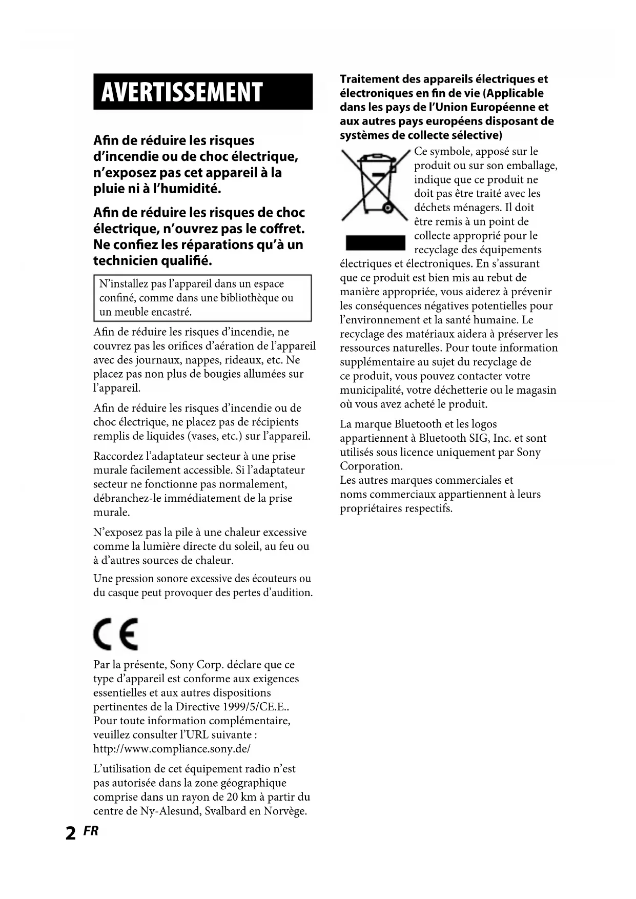WLA-NWB1K [FR] 3-196-849-22(1) AVERTISSEMENT An de réduire les risques d’incendie ou de choc électrique, n’exposez pas cet appareil à la pluie ni à l’humidité. An de réduire les risques de choc électrique, n’ouvrez pas le coret. Ne conez les réparations qu’à un technicien qualié. N’installez pas l’appareil dans un espace conné, comme dans une bibliothèque ou un meuble encastré. An de réduire les risques d’incendie, ne couvrez pas les orices d’aération de l’appareil avec des journaux, nappes, rideaux, etc. Ne placez pas non plus de bougies allumées sur l’appareil. An de réduire les risques d’incendie ou de choc électrique, ne placez pas de récipients remplis de liquides (vases, etc.) sur l’appareil. Raccordez l’adaptateur secteur à une prise murale facilement accessible. Si l’adaptateur secteur ne fonctionne pas normalement, débranchez-le immédiatement de la prise murale. N’exposez pas la pile à une chaleur excessive comme la lumière directe du soleil, au feu ou à d’autres sources de chaleur. Une pression sonore excessive des écouteurs ou du casque peut provoquer des pertes d’audition. Par la présente, Sony Corp. déclare que ce type d’appareil est conforme aux exigences essentielles et aux autres dispositions pertinentes de la Directive 1999/5/C... Pour toute information complémentaire, veuillez consulter l’URL suivante : http://www.compliance.sony.de/ L’utilisation de cet équipement radio n’est pas autorisée dans la zone géographique comprise dans un rayon de 20 km à partir du centre de Ny-Alesund, Svalbard en Norvège. Traitement des appareils électriques et électroniques en n de vie (Applicable dans les pays de l’Union Européenne et aux autres pays européens disposant de systèmes de collecte sélective) Ce symbole, apposé sur le produit ou sur son emballage, indique que ce produit ne doit pas être traité avec les déchets ménagers. Il doit être remis à un point de collecte approprié pour le recyclage des équipements électriques et électroniques. n s’assurant que ce produit est bien mis au rebut de manière appropriée, vous aiderez à prévenir les conséquences négatives potentielles pour l’environnement et la santé humaine. Le recyclage des matériaux aidera à préserver les ressources naturelles. Pour toute information supplémentaire au sujet du recyclage de ce produit, vous pouvez contacter votre municipalité, votre déchetterie ou le magasin où vous avez acheté le produit. La marque Bluetooth et les logos appartiennent à Bluetooth SIG, Inc. et sont utilisés sous licence uniquement par Sony Corporation. Les autres marques commerciales et noms commerciaux appartiennent à leurs propriétaires respectifs.WLA-NWB1K [FR] 3-196-849-22(1) WLA-NWB1K [FR] 3-196-849-22(1)