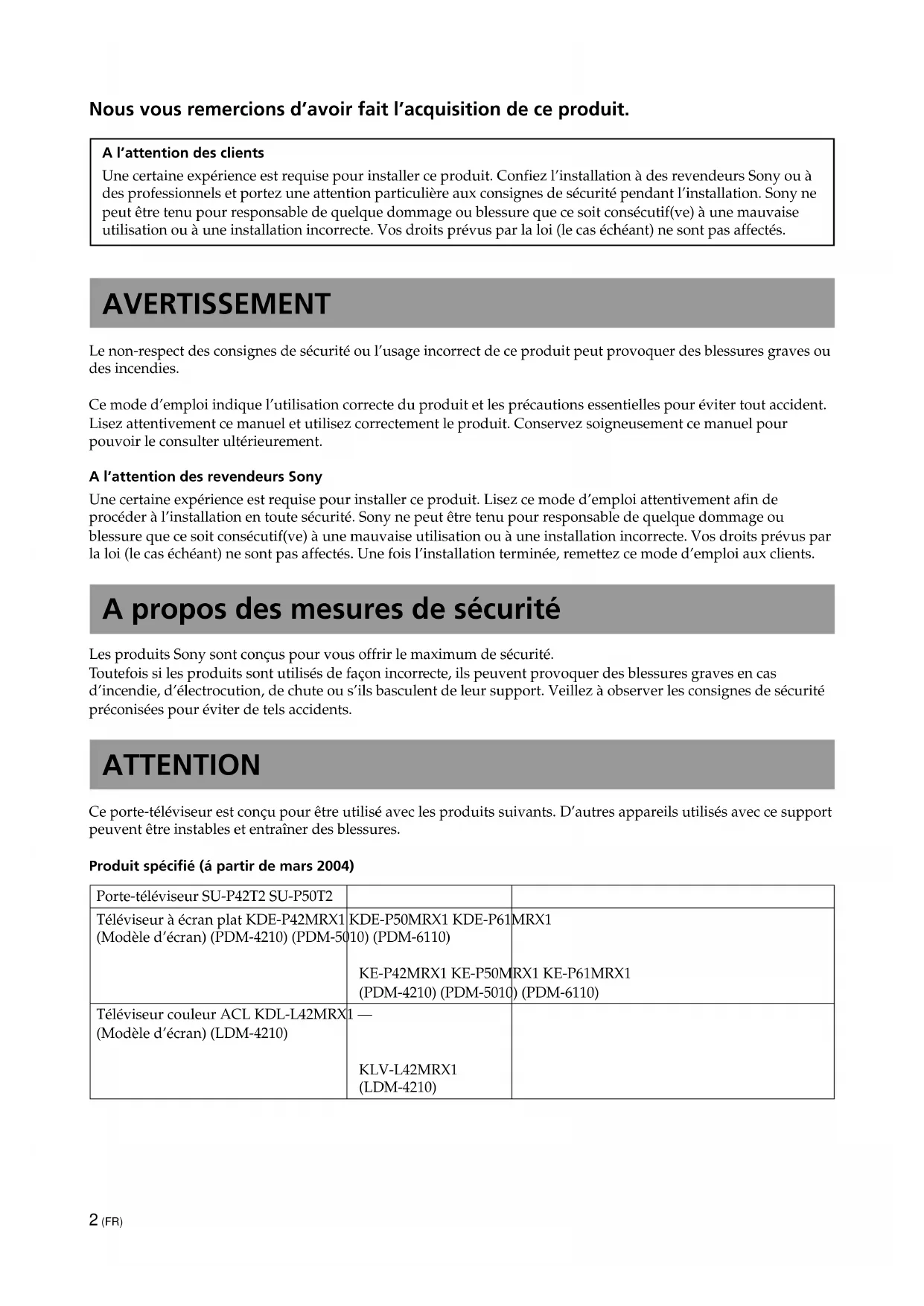B2 (FR) Nous vous remercions d’avoir fait l’acquisition de ce produit. A l’attention des clients Une certaine expérience est requise pour installer ce produit. Confiez l’installation à des revendeurs Sony ou à des professionnels et portez une attention particulière aux consignes de sécurité pendant l’installation. Sony ne peut être tenu pour responsable de quelque dommage ou blessure que ce soit consécutif(ve) à une mauvaise utilisation ou à une installation incorrecte. Vos droits prévus par la loi (le cas échéant) ne sont pas affectés. AVERTISSEMENT Le non-respect des consignes de sécurité ou l’usage incorrect de ce produit peut provoquer des blessures graves ou des incendies. Ce mode d’emploi indique l’utilisation correcte du produit et les précautions essentielles pour éviter tout accident. Lisez attentivement ce manuel et utilisez correctement le produit. Conservez soigneusement ce manuel pour pouvoir le consulter ultérieurement. A l’attention des revendeurs Sony Une certaine expérience est requise pour installer ce produit. Lisez ce mode d’emploi attentivement afin de procéder à l’installation en toute sécurité. Sony ne peut être tenu pour responsable de quelque dommage ou blessure que ce soit consécutif(ve) à une mauvaise utilisation ou à une installation incorrecte. Vos droits prévus par la loi (le cas échéant) ne sont pas affectés. Une fois l’installation terminée, remettez ce mode d’emploi aux clients. A propos des mesures de sécurité Les produits Sony sont conçus pour vous offrir le maximum de sécurité. Toutefois si les produits sont utilisés de façon incorrecte, ils peuvent provoquer des blessures graves en cas d’incendie, d’électrocution, de chute ou s’ils basculent de leur support. Veillez à observer les consignes de sécurité préconisées pour éviter de tels accidents. ATTENTION Ce porte-téléviseur est conçu pour être utilisé avec les produits suivants. D’autres appareils utilisés avec ce support peuvent être instables et entraîner des blessures. Produit spécifié (á partir de mars 2004) Porte-téléviseur SU-P42T2 SU-P50T2 Téléviseur à écran plat KDE-P42MRX1 KDE-P50MRX1 KDE-P61MRX1 (Modèle d’écran) (PDM-4210) (PDM-5010) (PDM-6110)
