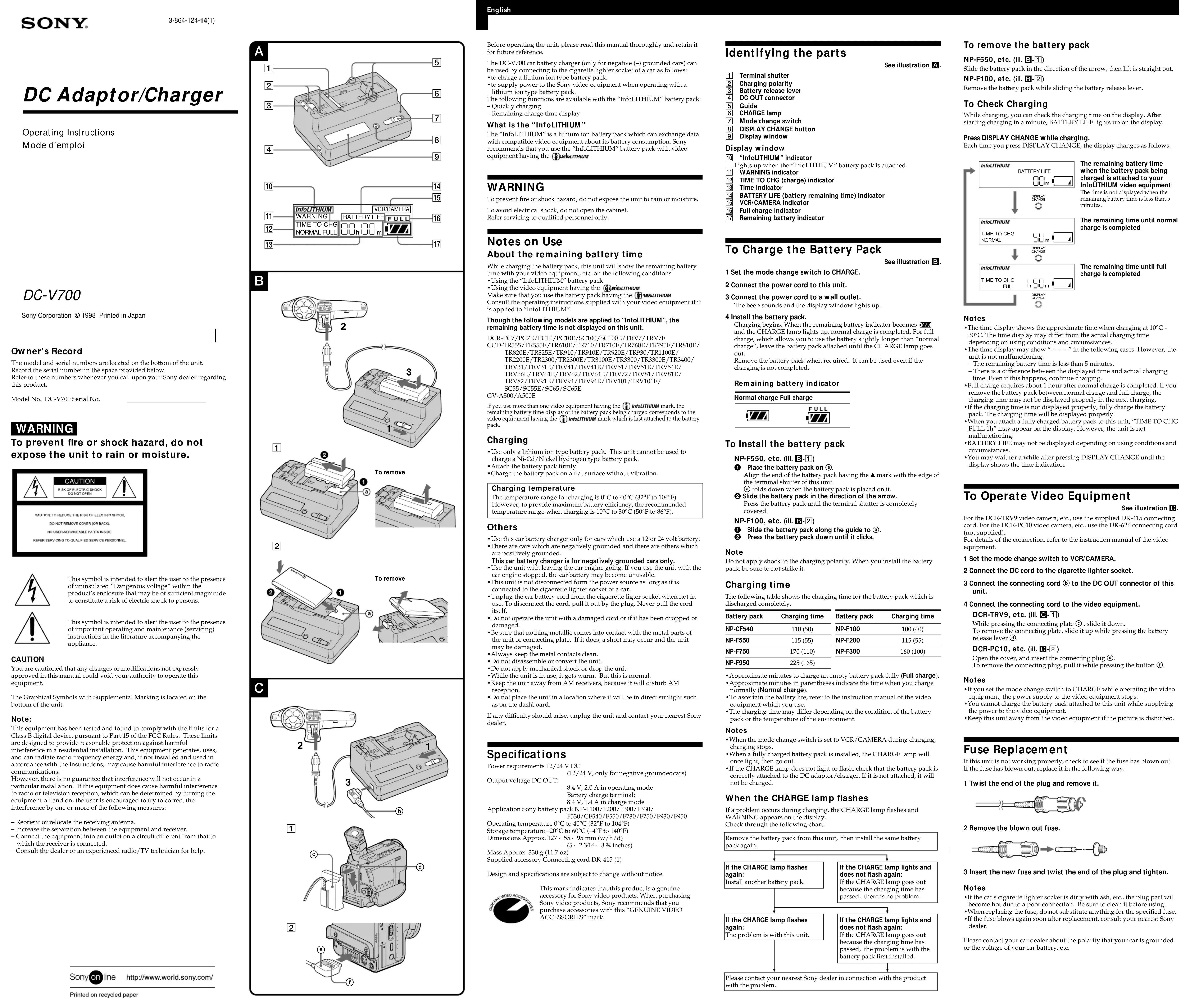 DCV700 - Chargeur de piles SONY - Notice d'utilisation et mode d'emploi gratuit